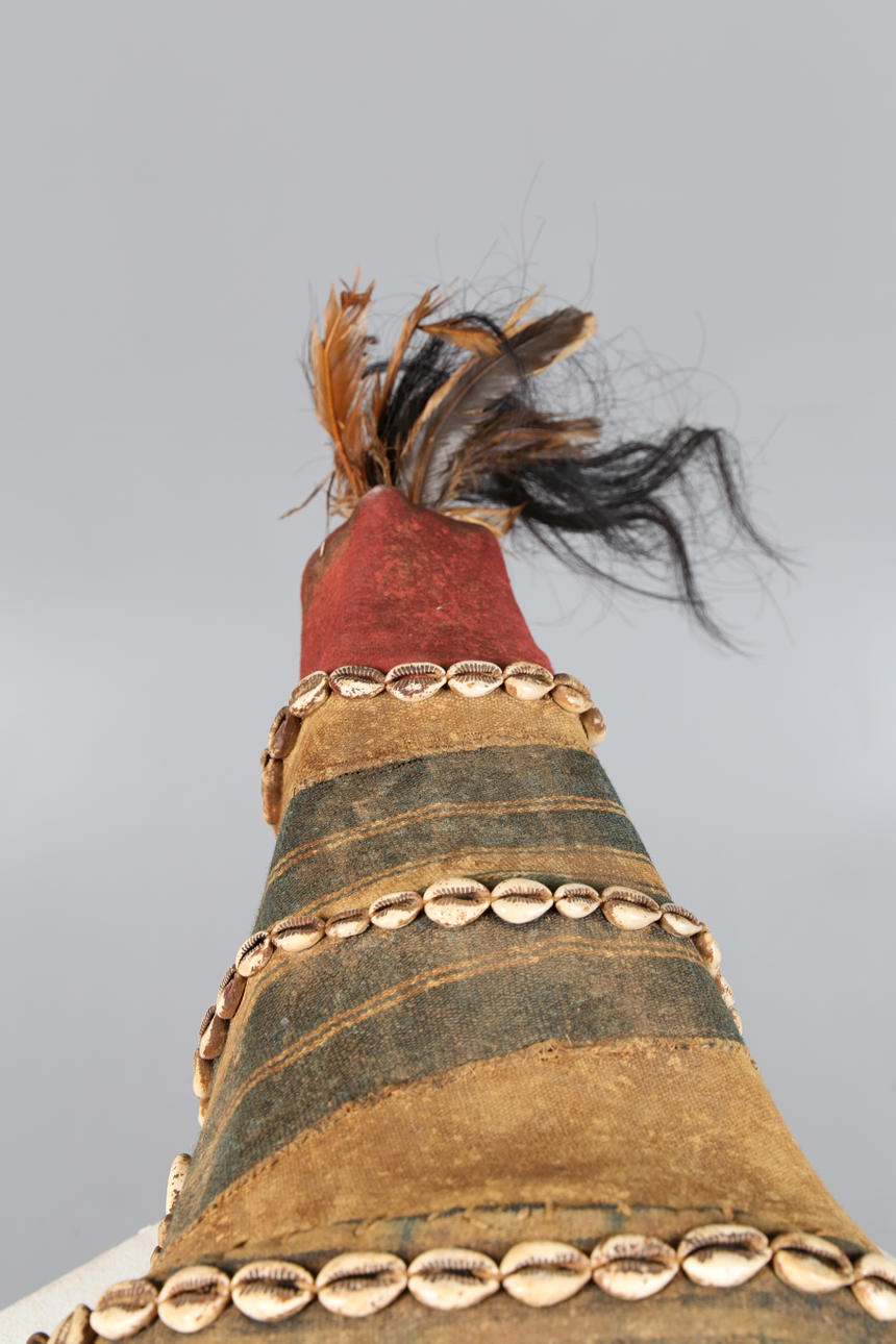 Anden tredjedel af det 20. århundrede, med en klud og påført skalhovedbeklædning over masken med spaltede udskårne øjne og et naturfiberskæg, 32 cm højt 25 cm bredt