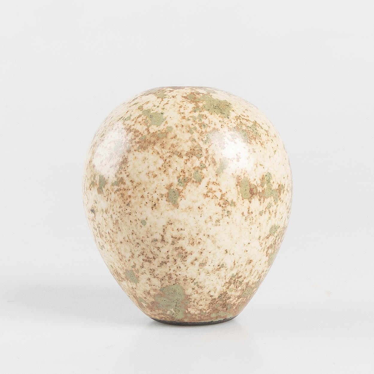 Starkeldsfaience, plettet glasur i hvide, grønne og brune toner, signeret Hhg, højde ca 9,5 cm.