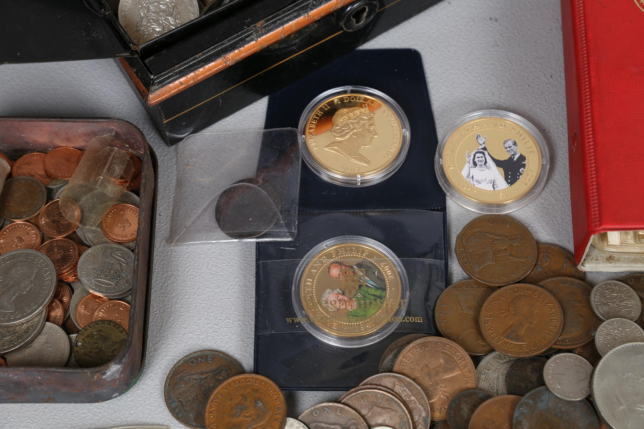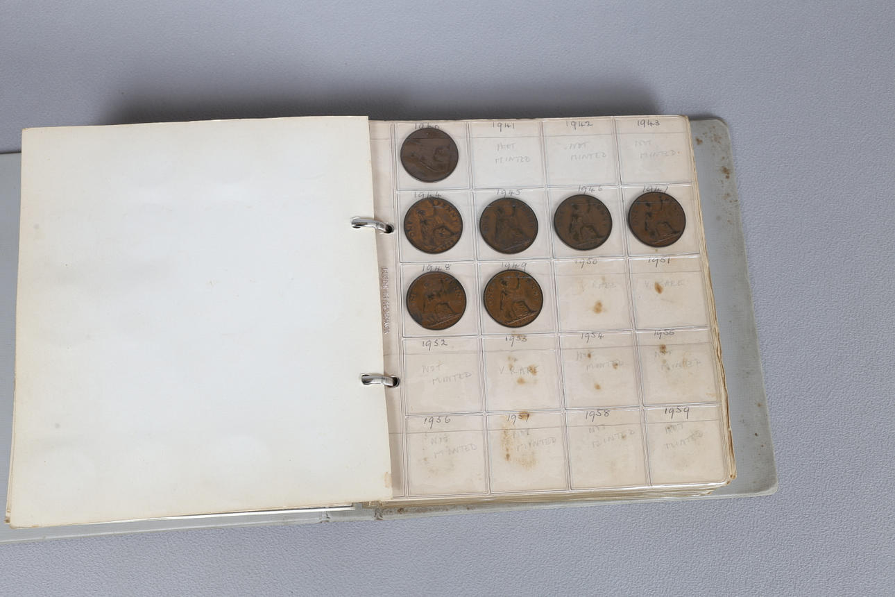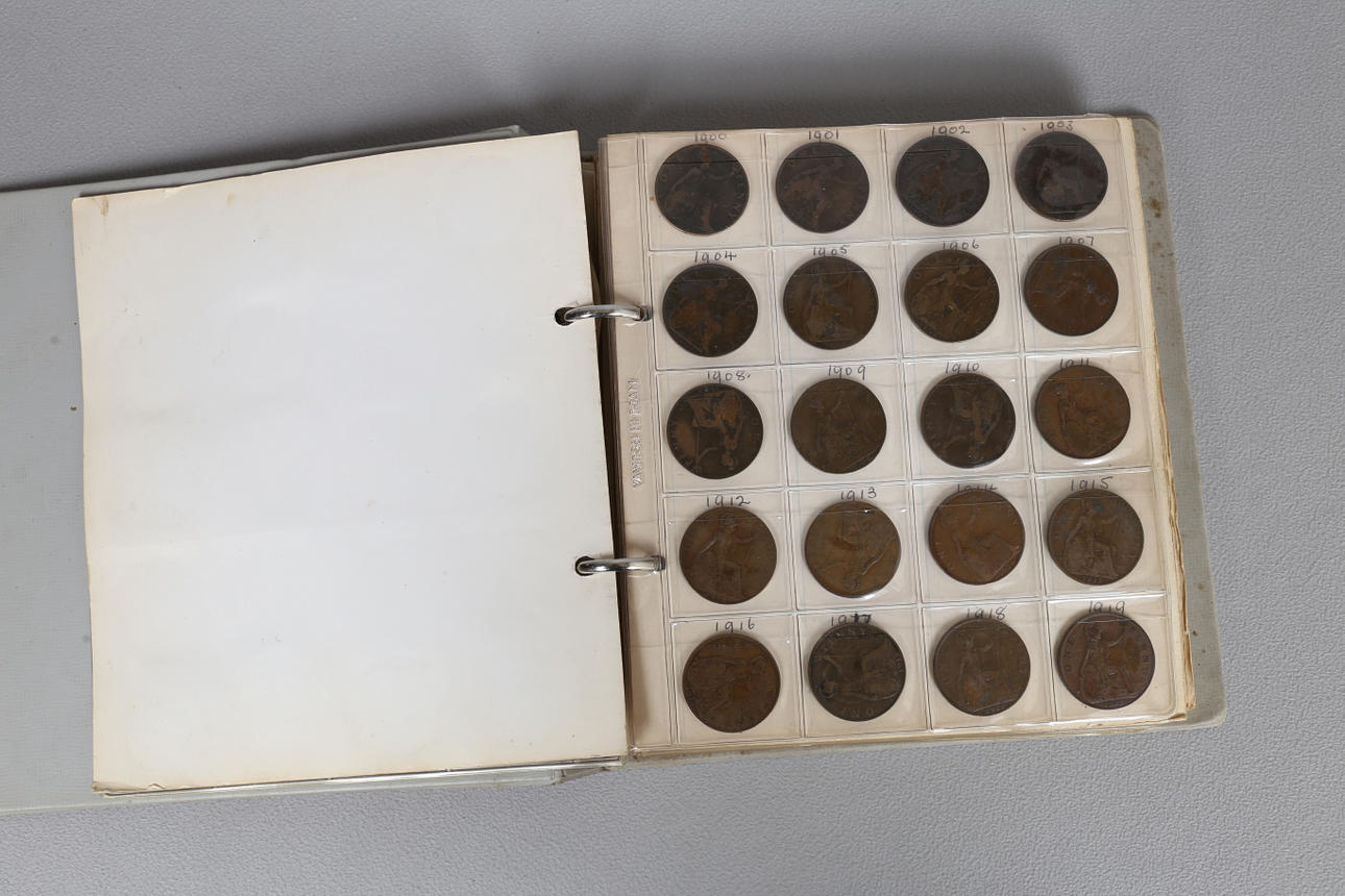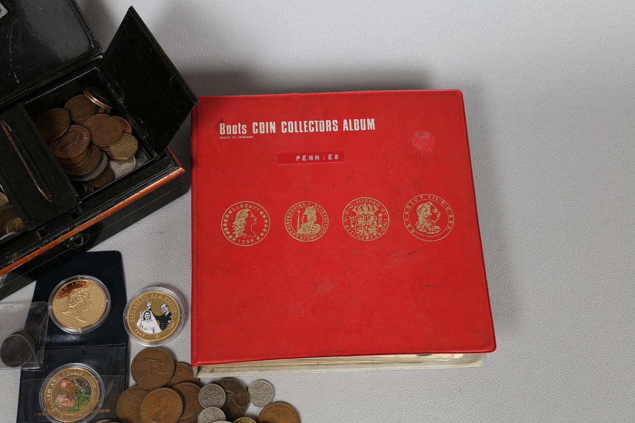Album, der indeholder Pennies til Sixpences, med en stor mængde løse mønter inklusive 1/2 øre, Cook island 1 Dollar billedmønter osv.