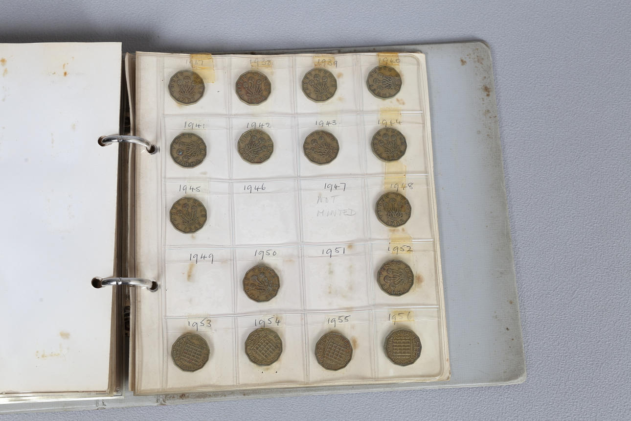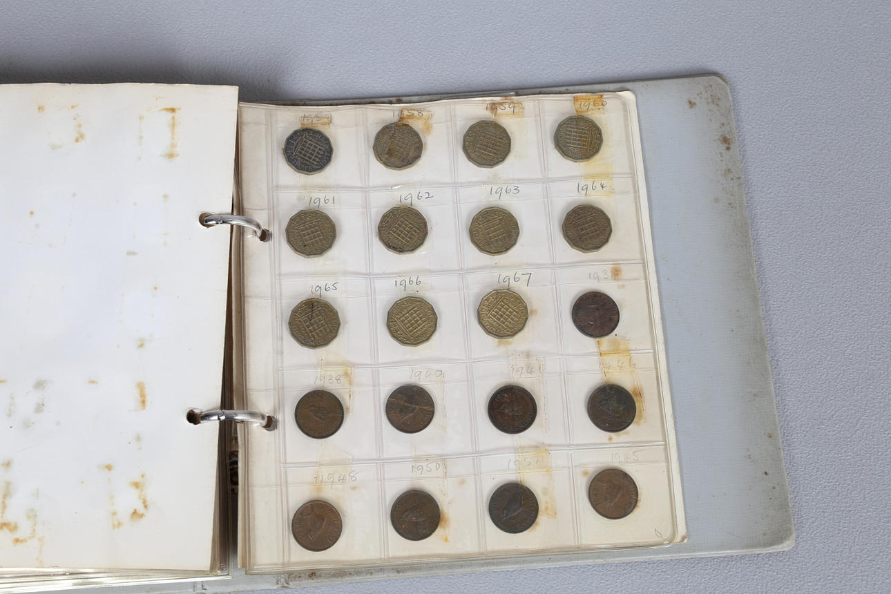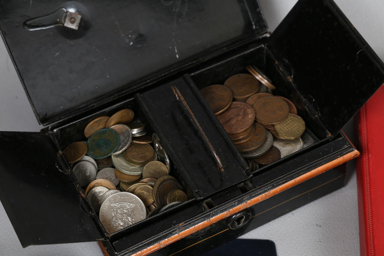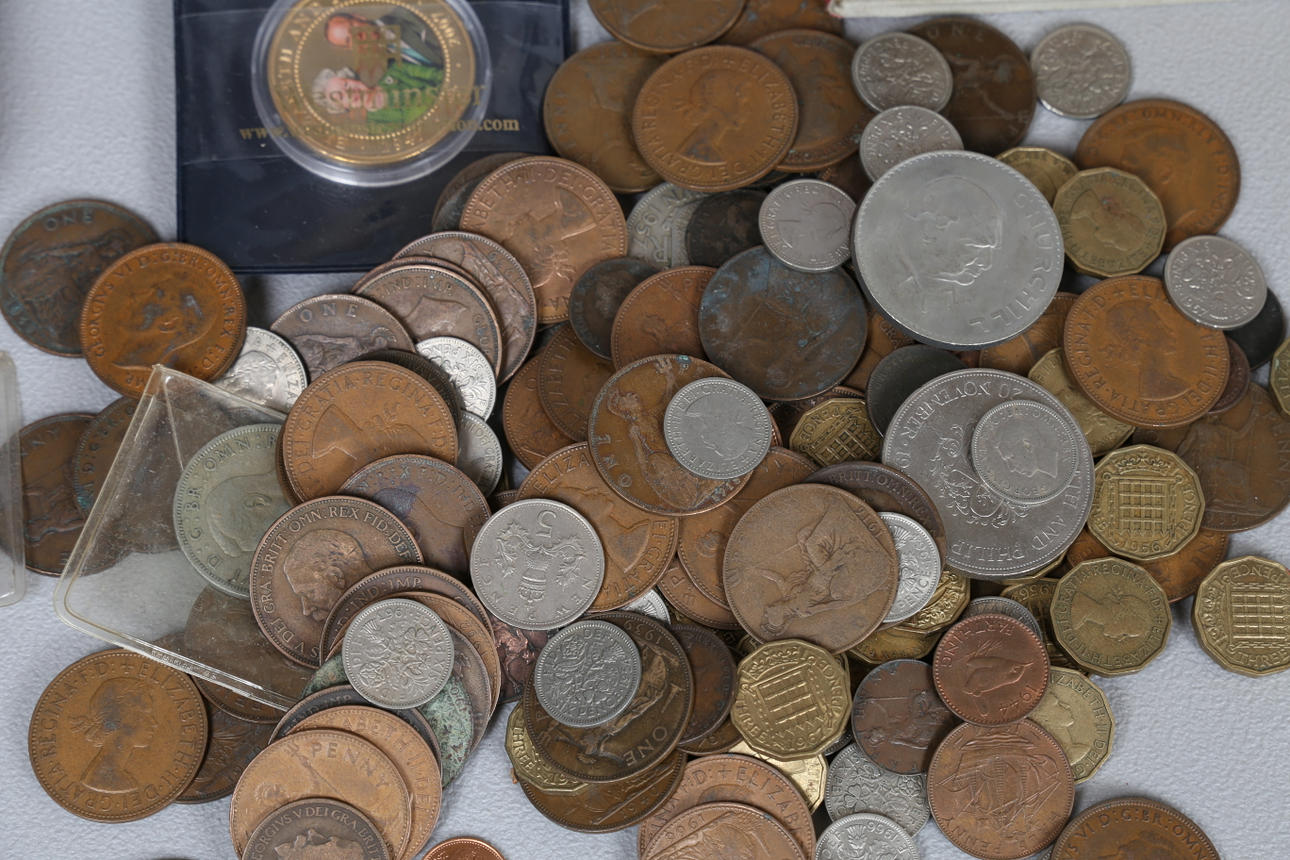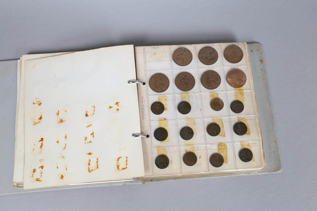 Album, der indeholder Pennies til Sixpences, med en stor mængde løse mønter inklusive 1/2 øre, Cook island 1 Dollar billedmønter osv.