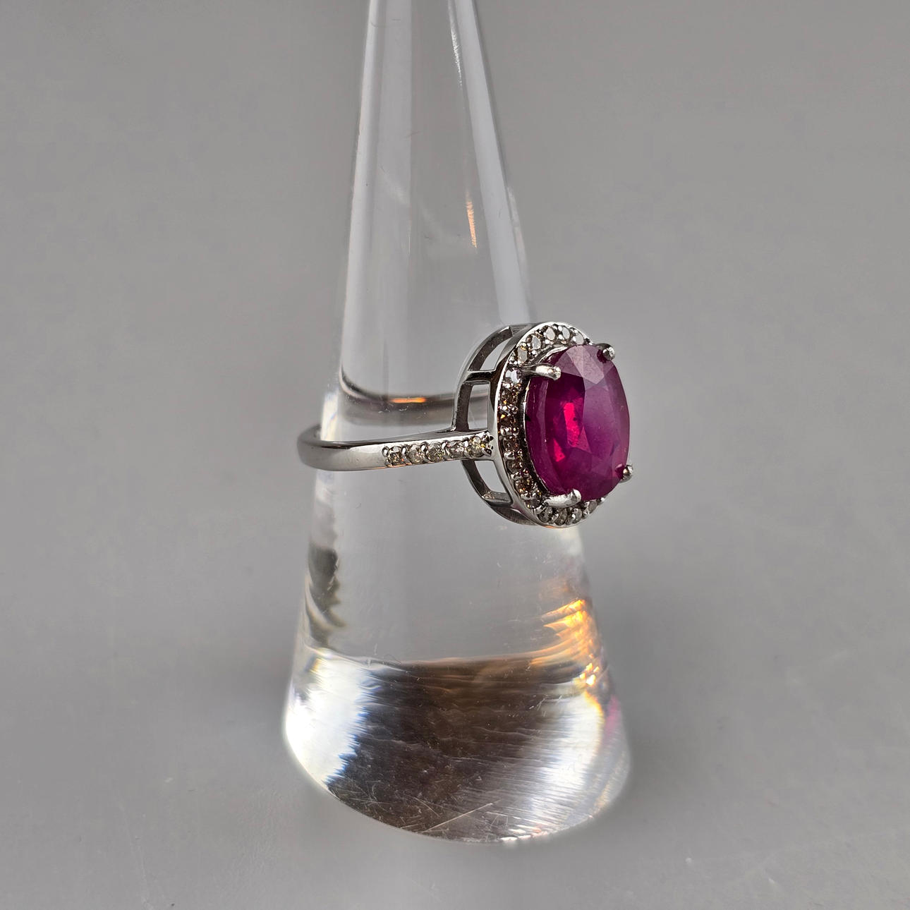 - Rubinring med diamant accenter, 925 sølv.