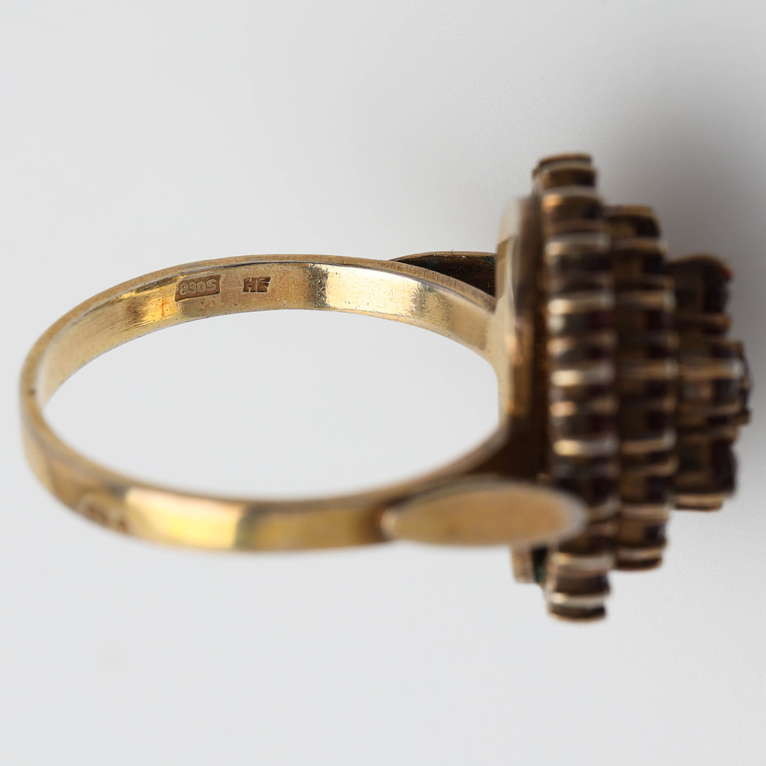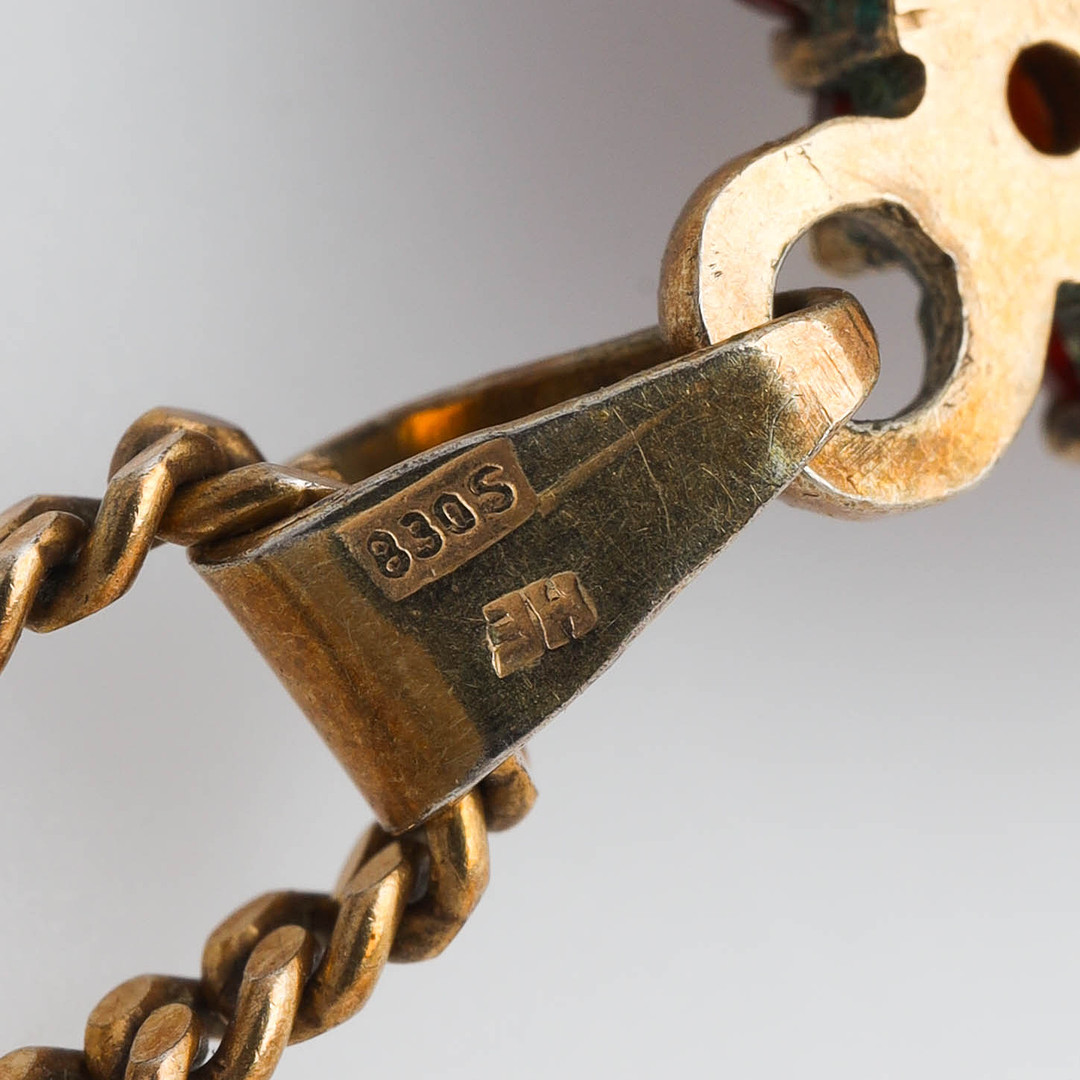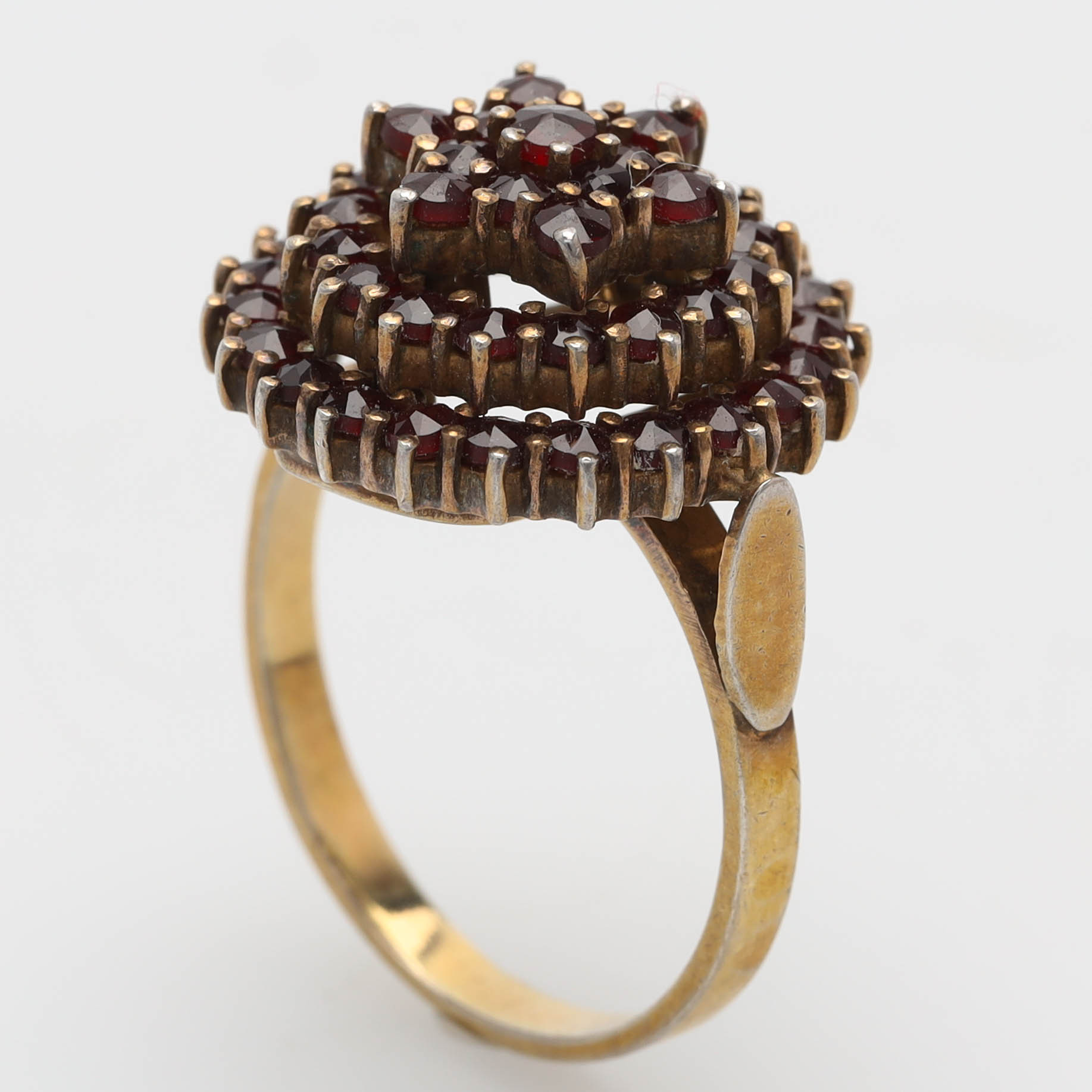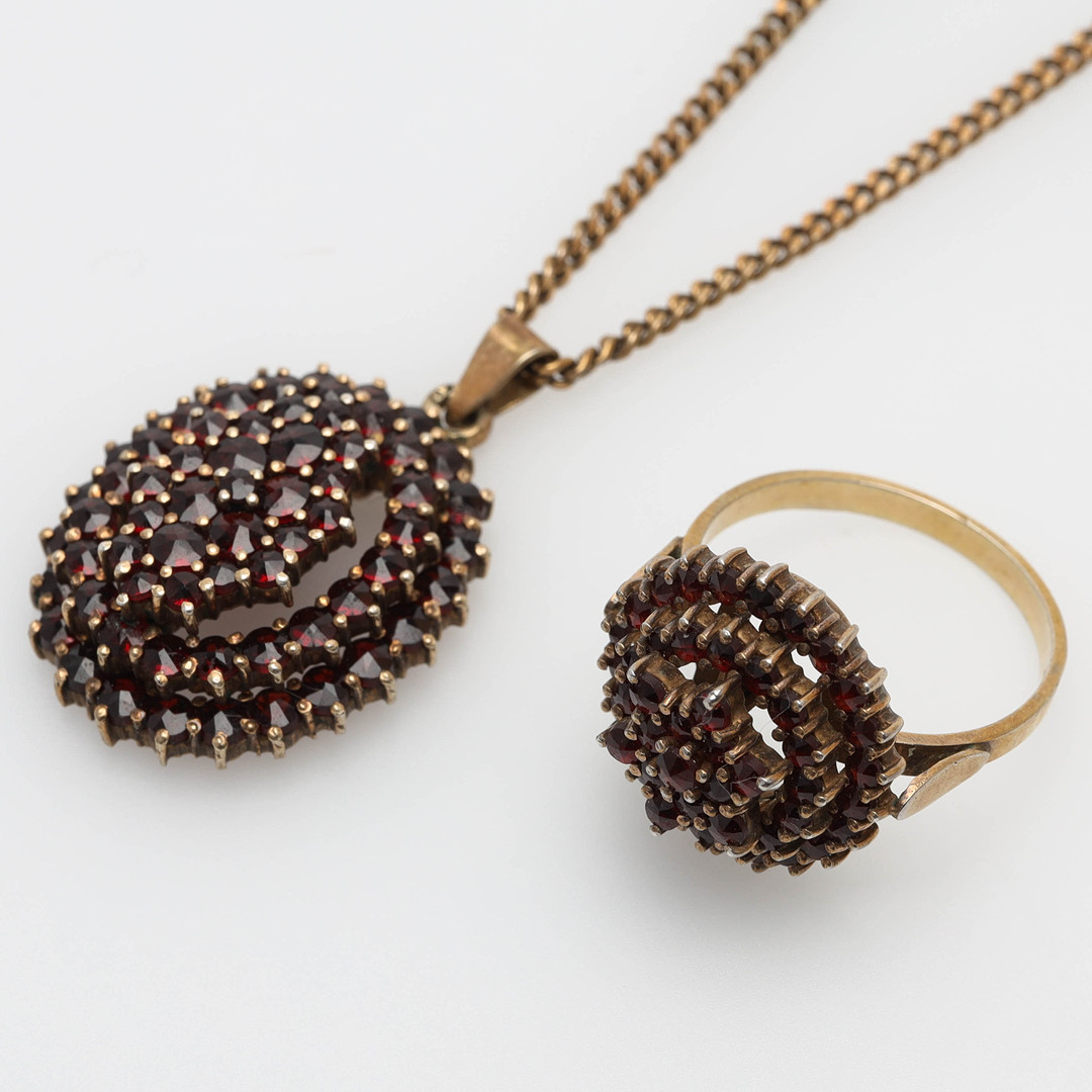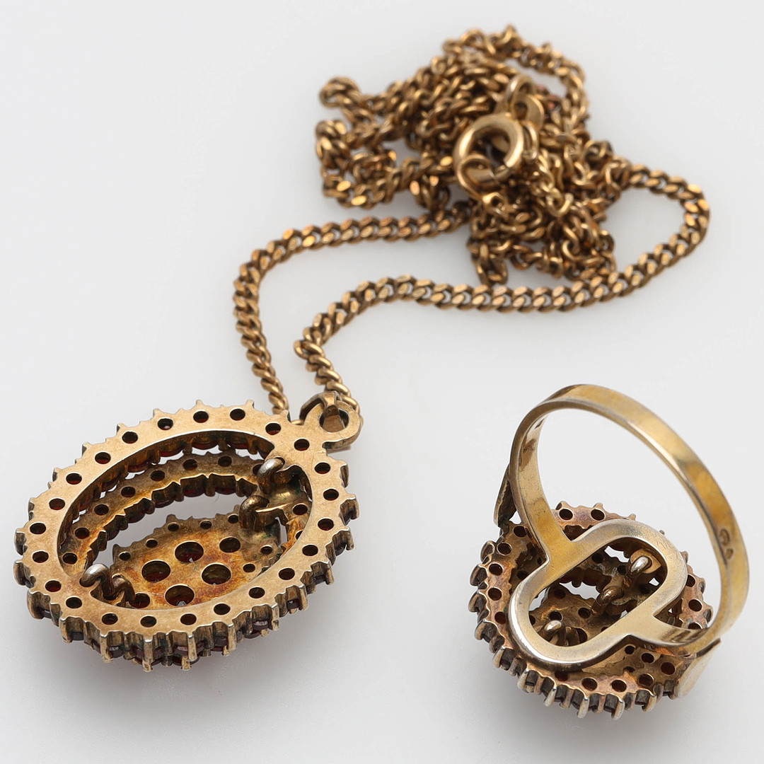 4156749. HALSKÆDE og RING, 2 stk., forgyldt sølv, granater.