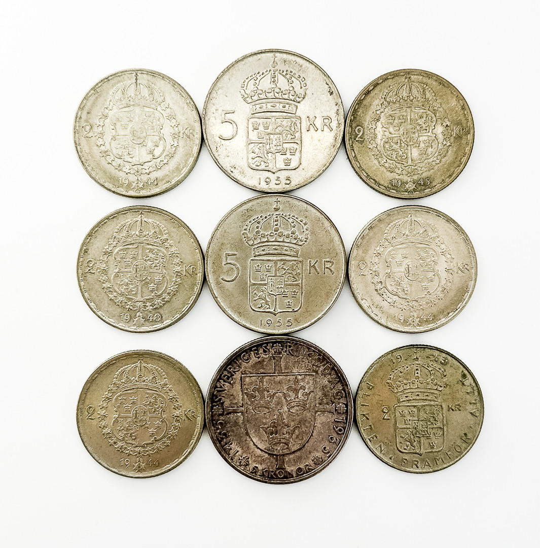 4157589. MØNTER, 9 stykker af 5 kroner og 2 kroner, sølv.