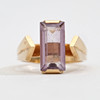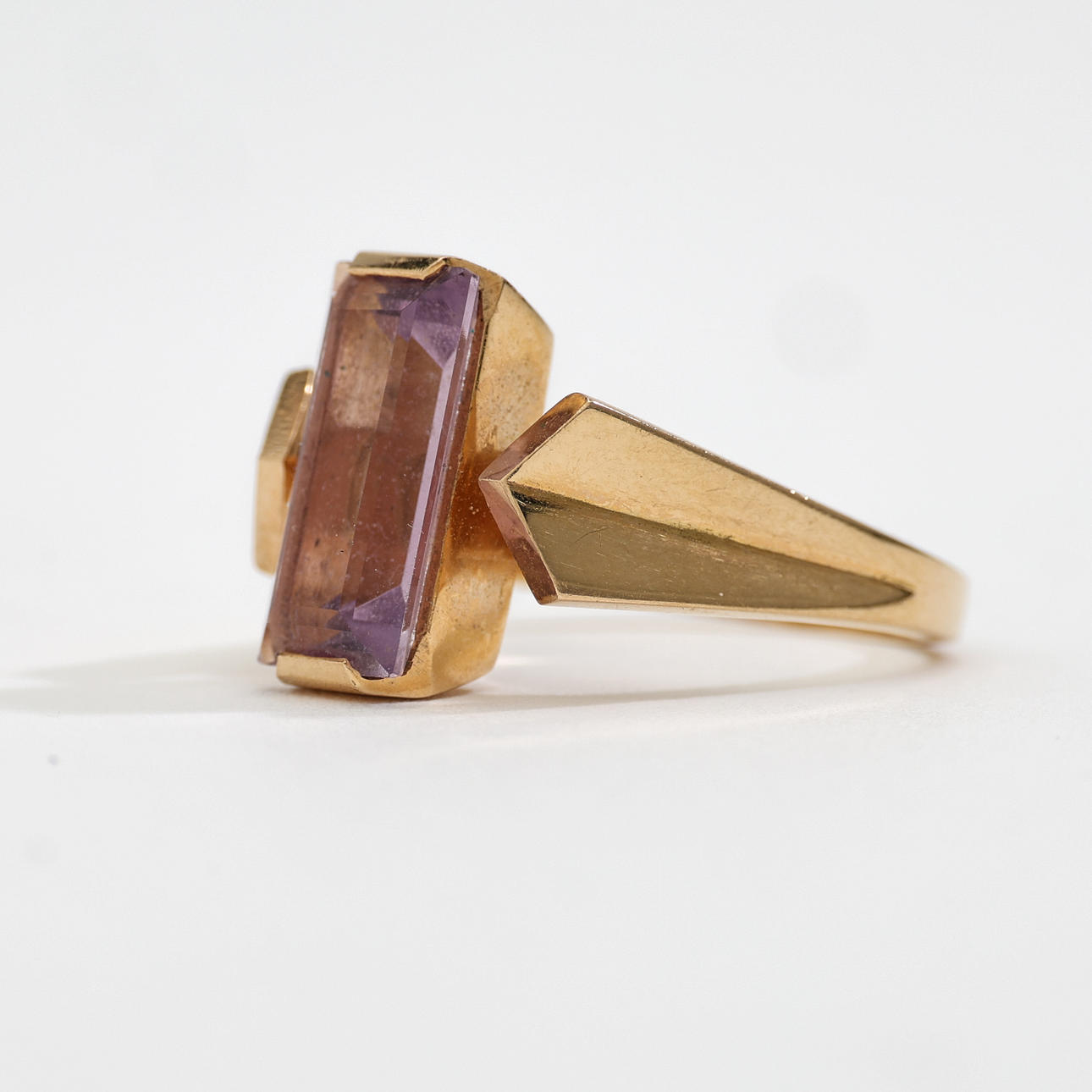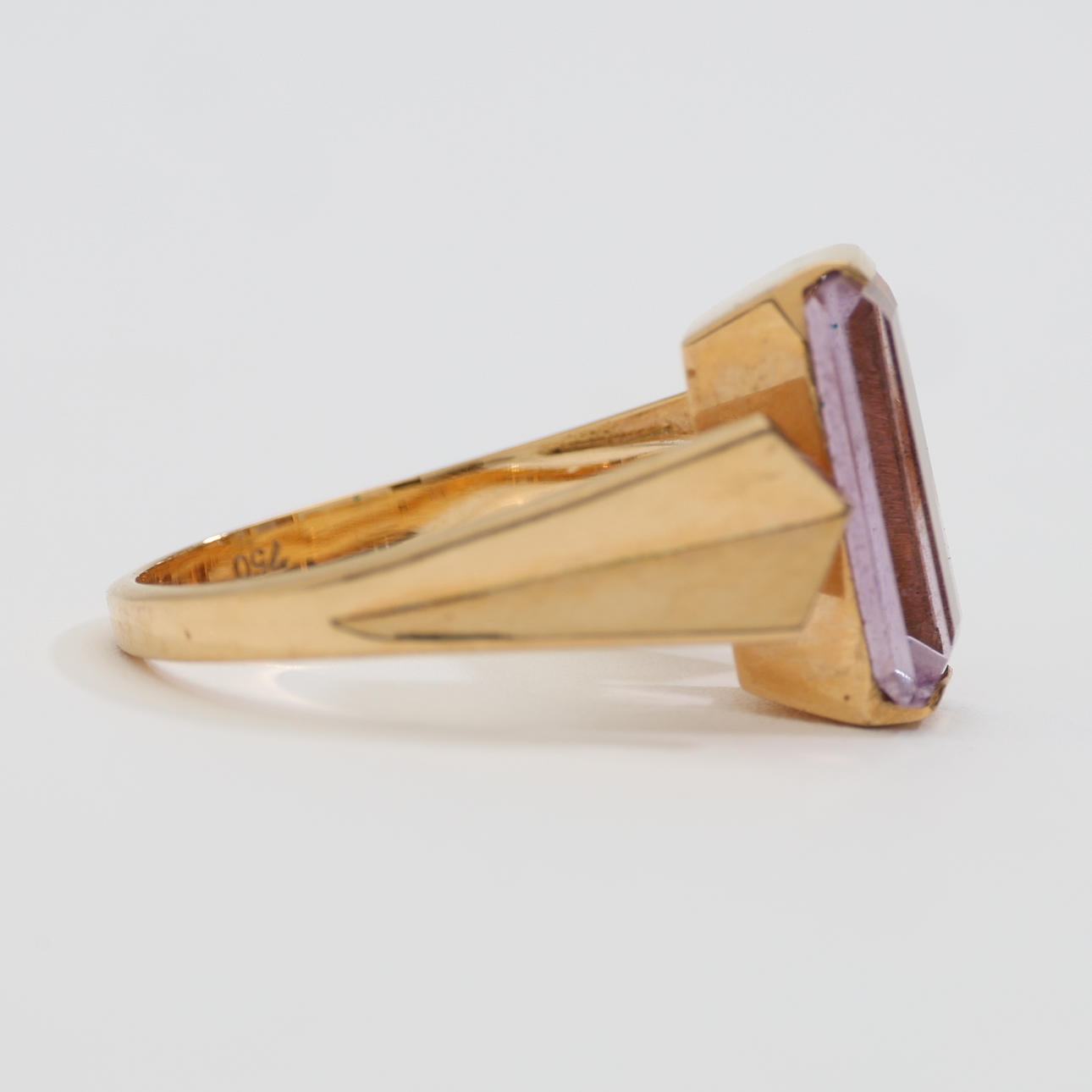 4159572. RING K18 guld, med baguetteslippet ametyst.