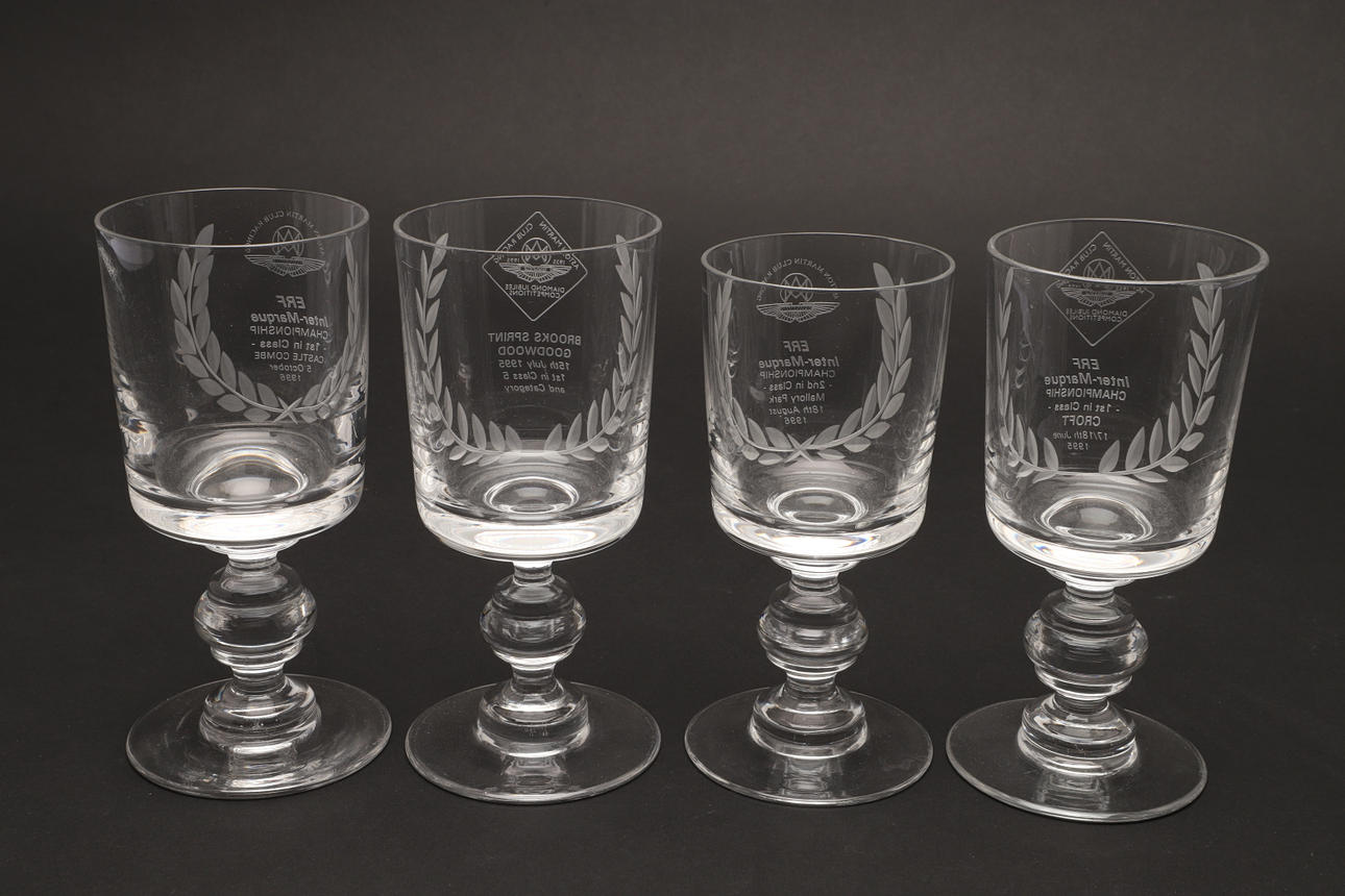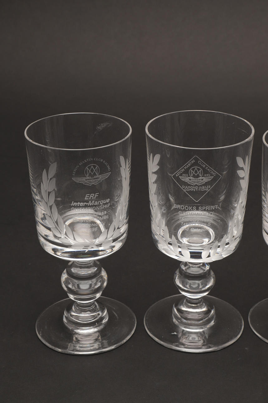En samling af fire klare glasbægre indgraveret med 'Aston Martin Club Racing' trofæer, Mallory park, Castle Combe 1996 og andre. 16,5 cm.