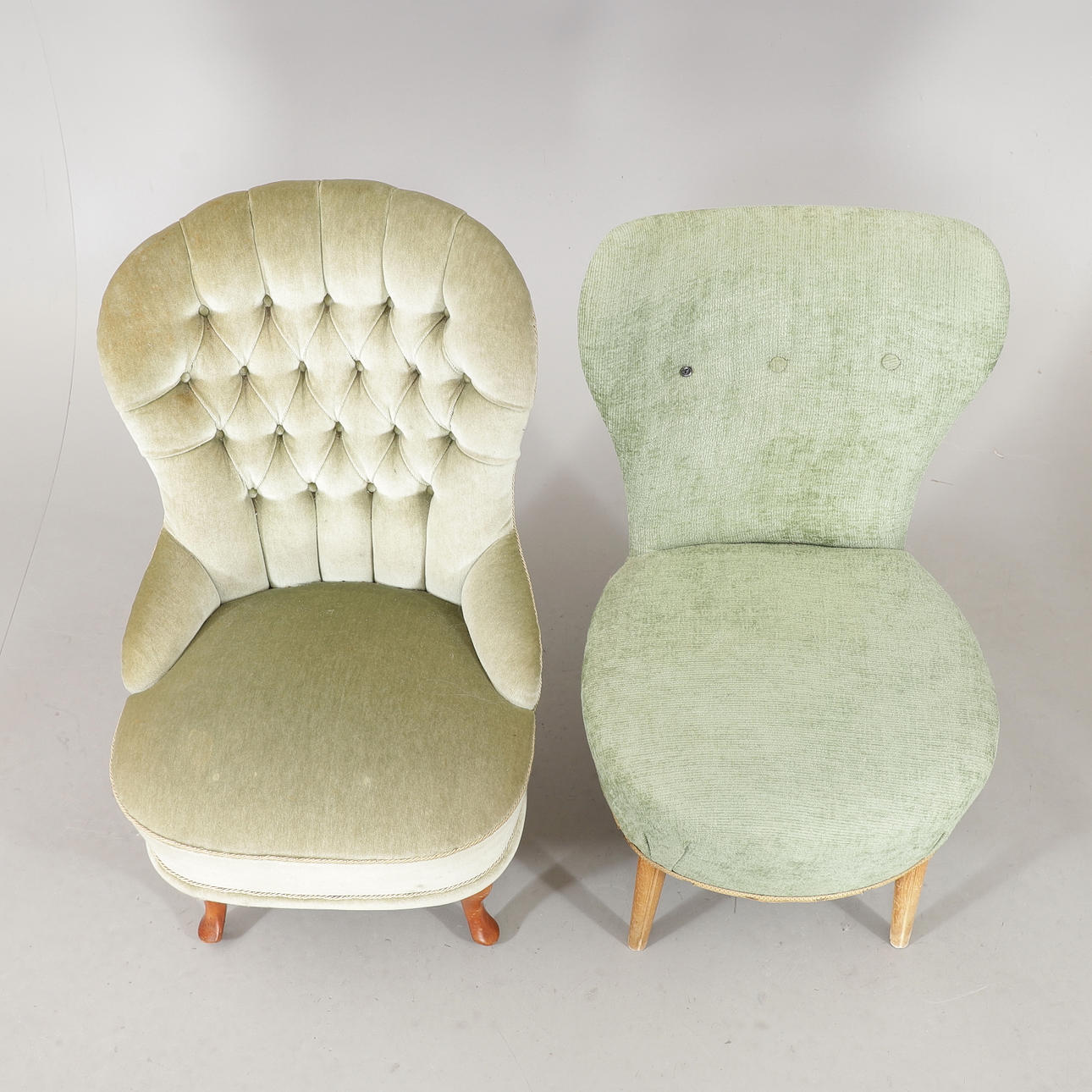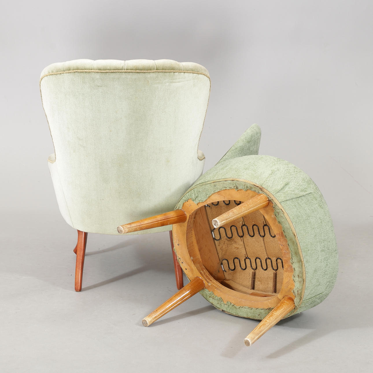 Brugsslitage. En lænestol mangler en knap.
