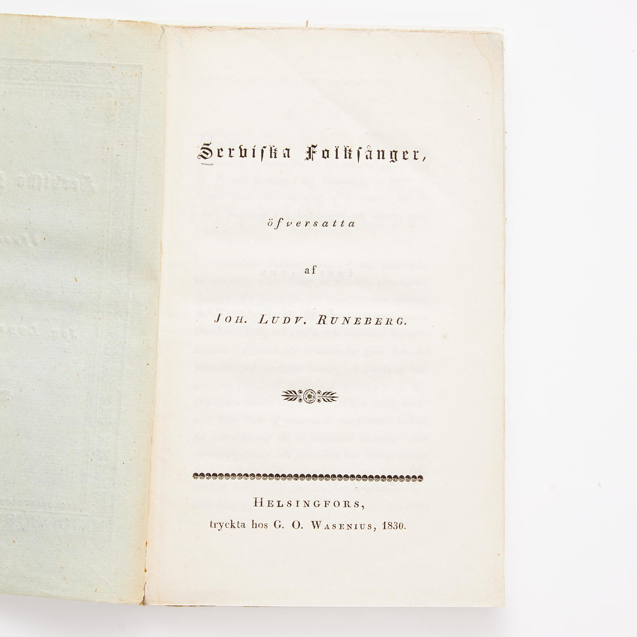 RUNEBERG, JOHAN LUDVIG. Serbiske folkesange. Forarget... Helsinki, G. O.Wasenius, 1830.