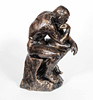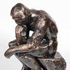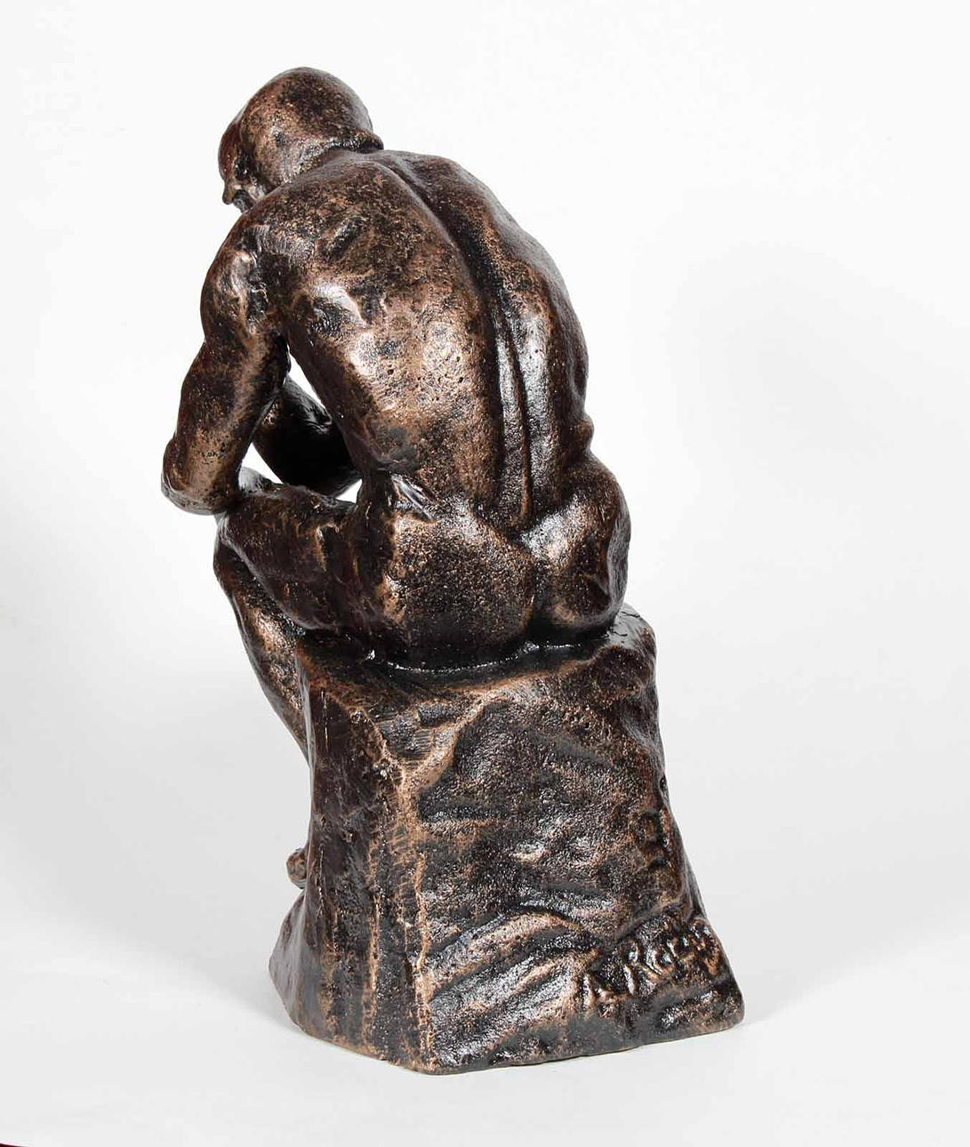 Skulptur af en nøgen mand, støbt metal, hvilende hovedet på den ene hånd, udført siddende på en klippebase, efter Rodin, højde ca. 26 cm Vægt 5 kg.
