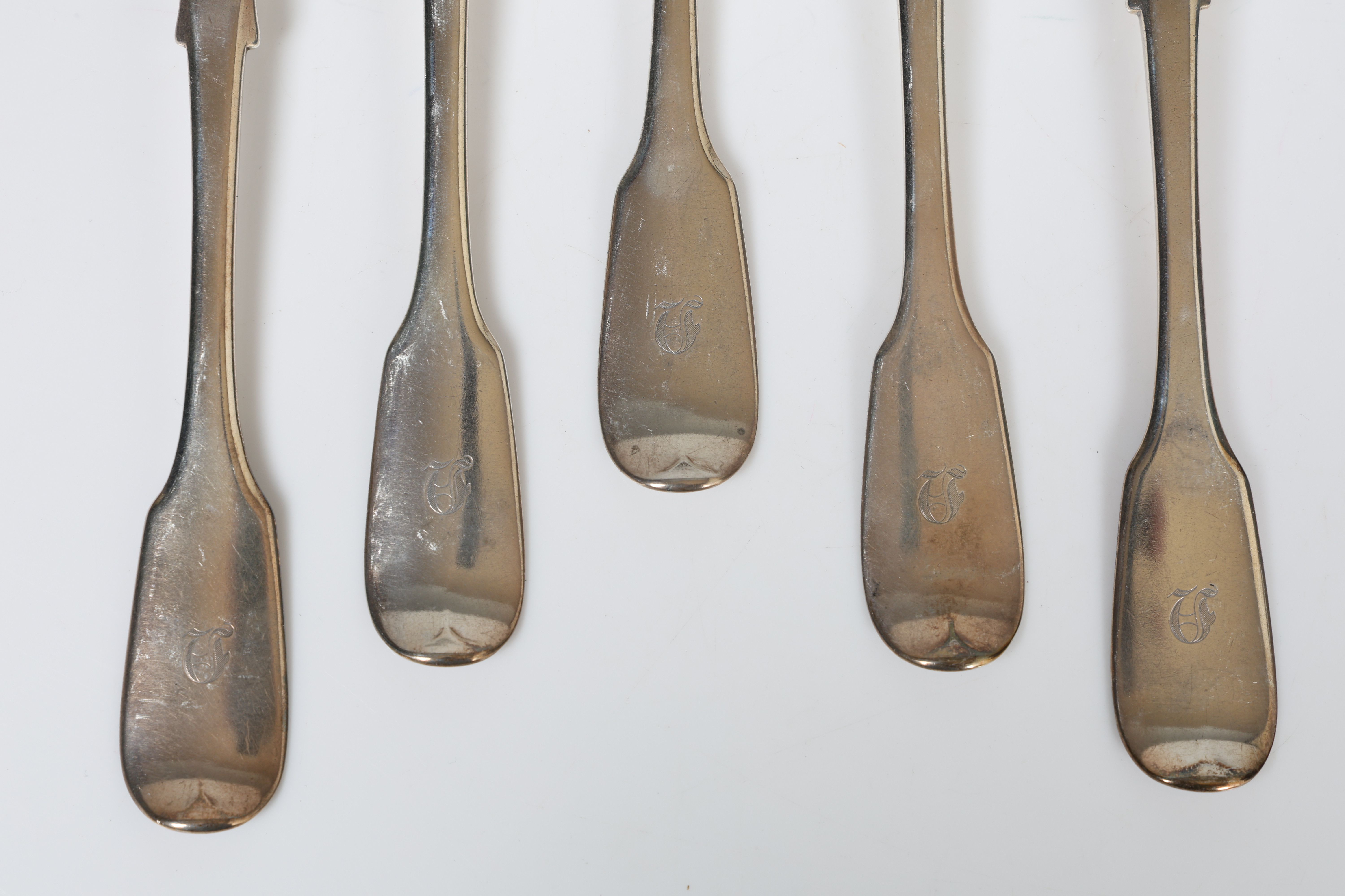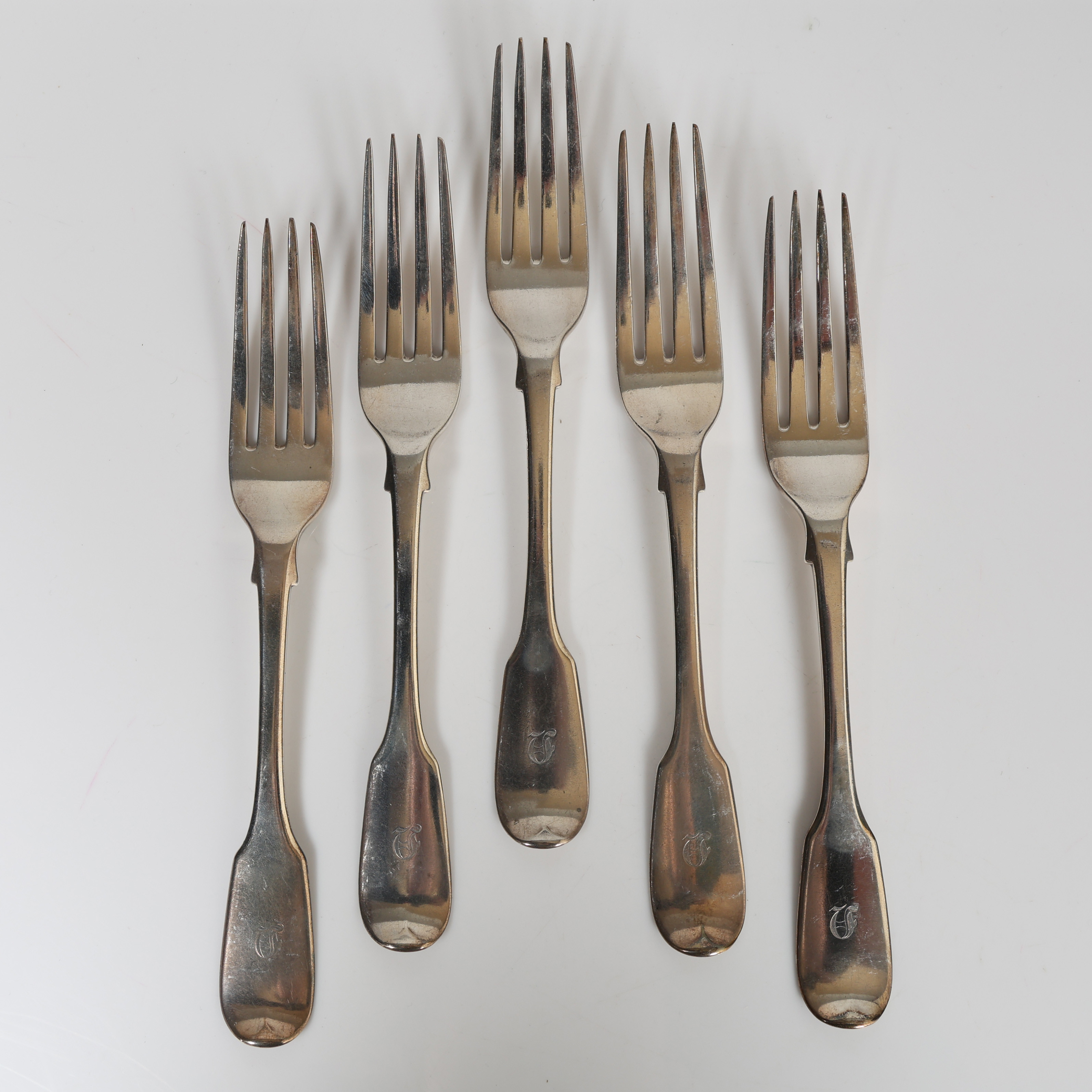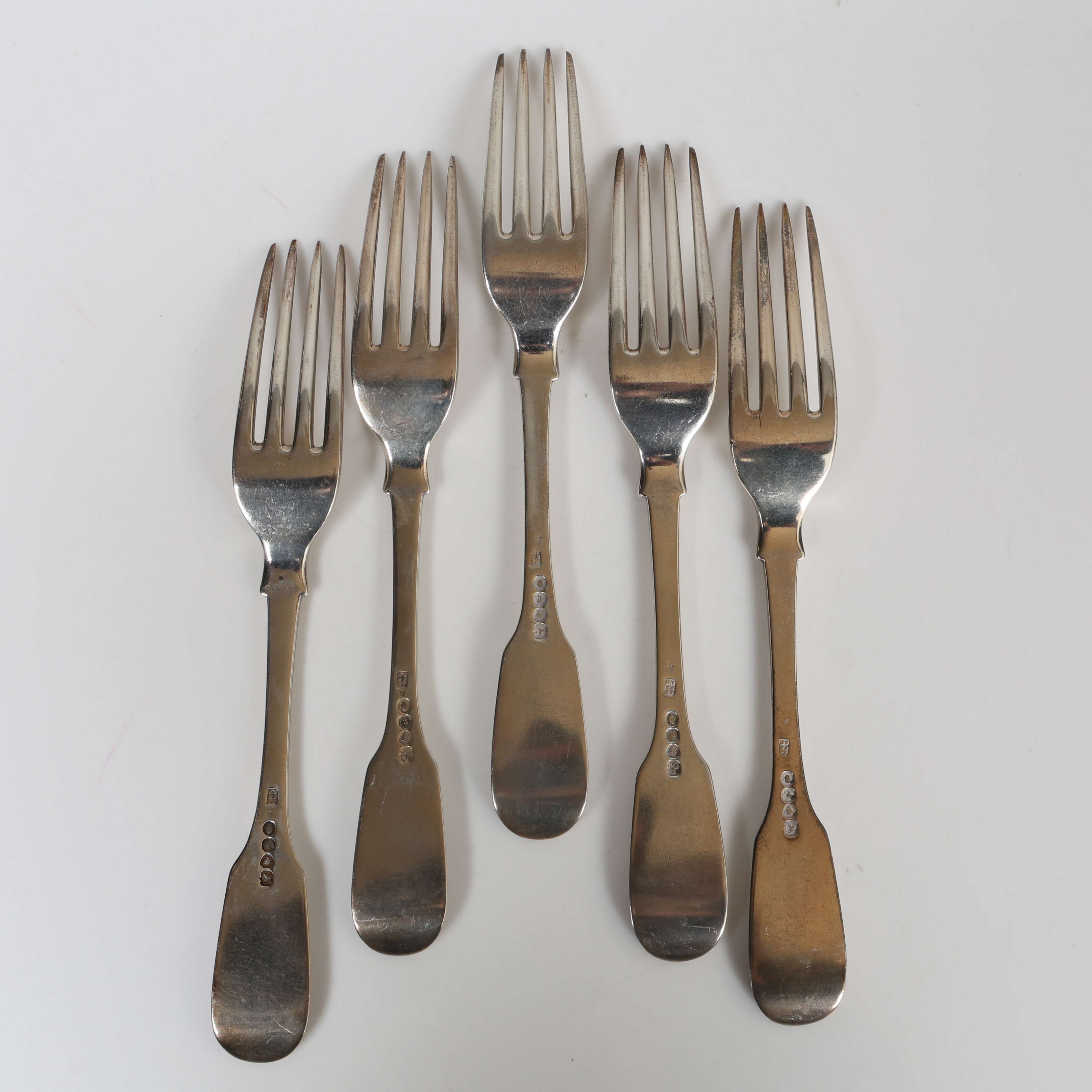 4168773. FEM WILLIAM IV SØLV BORDGAFLER (5).
