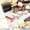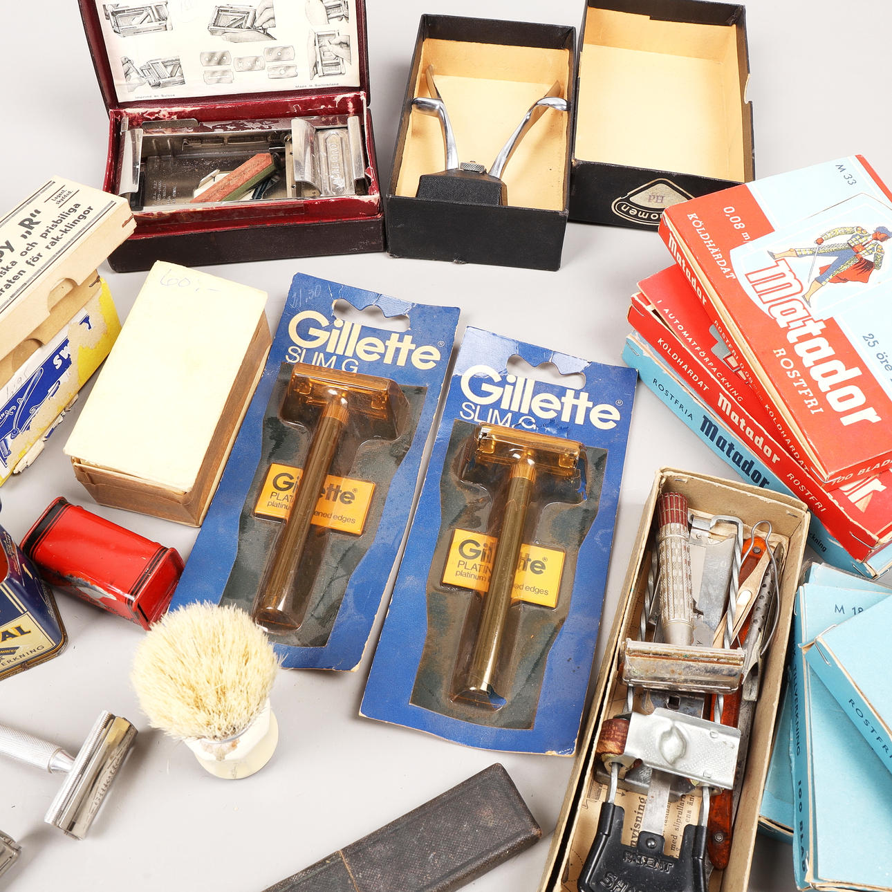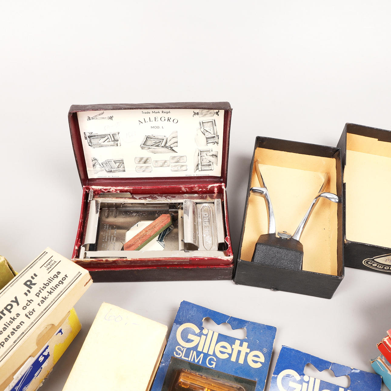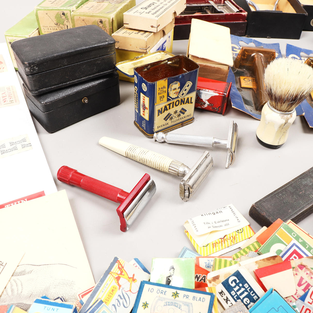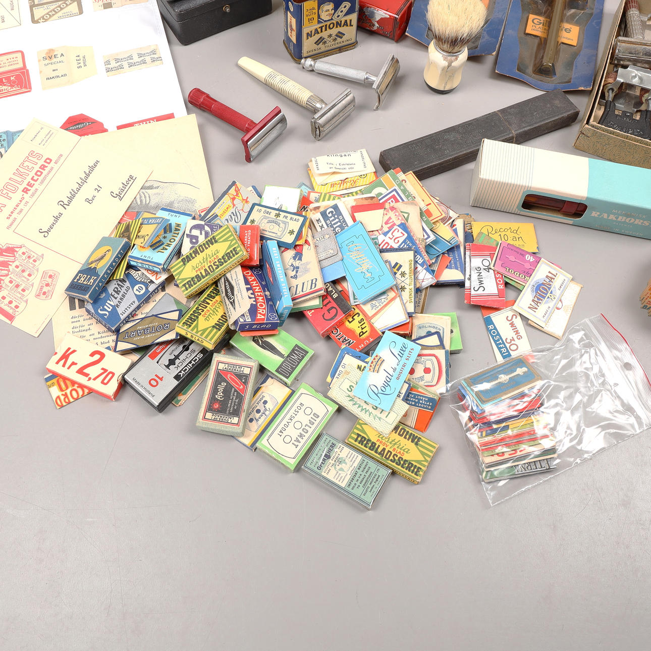 Et parti barberblade, barbermaskiner, barberbørster, hårsaks, barbermaskiner osv.