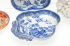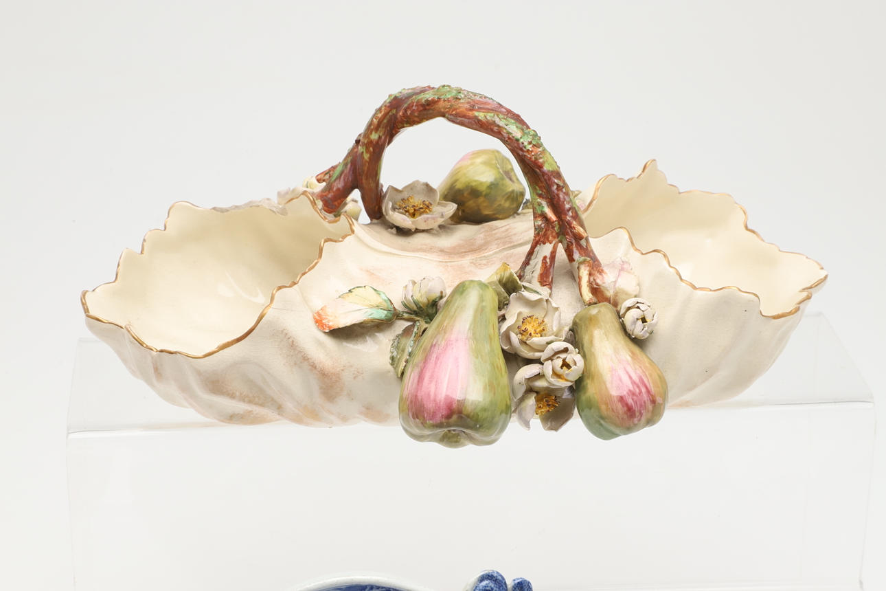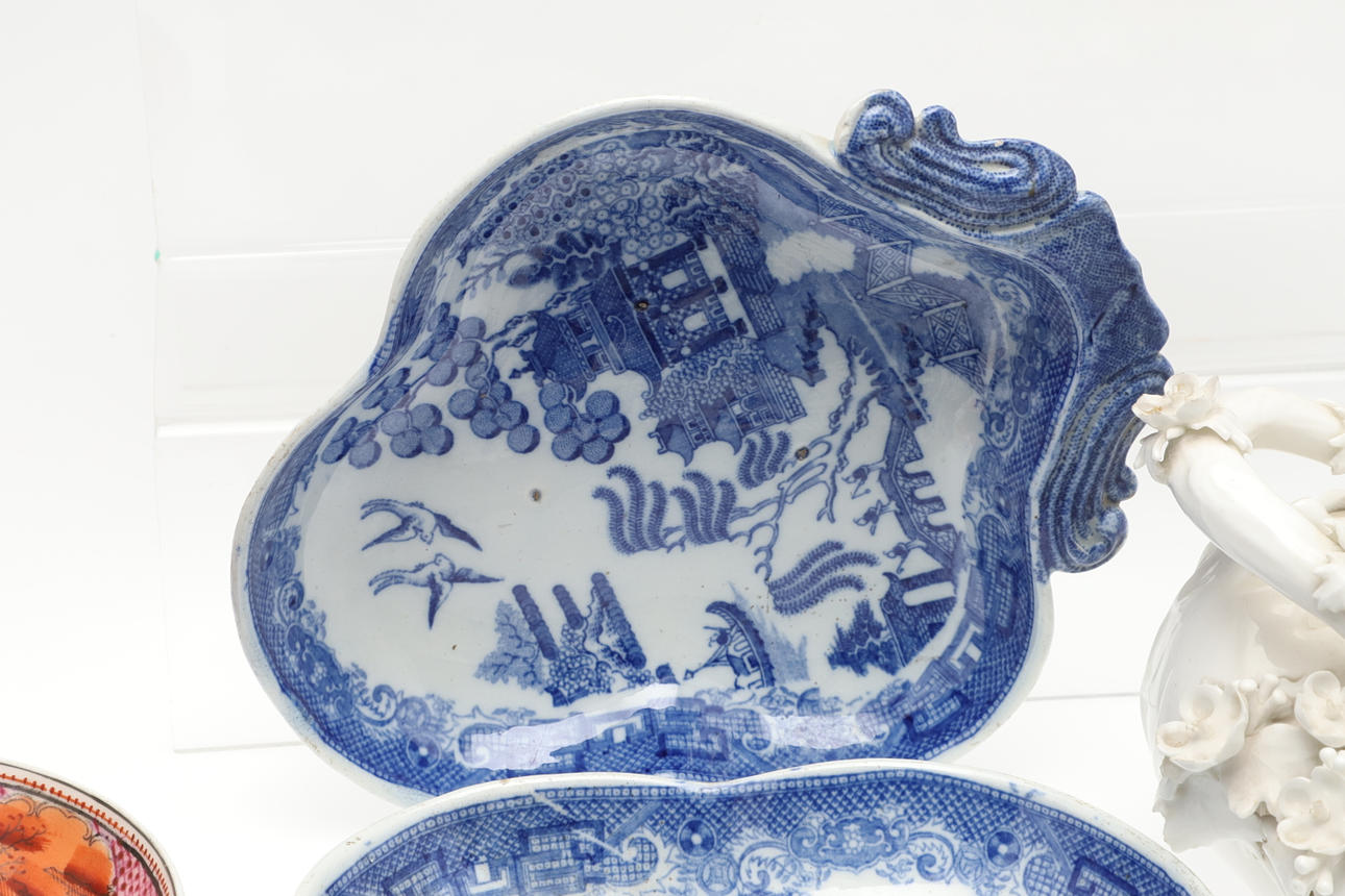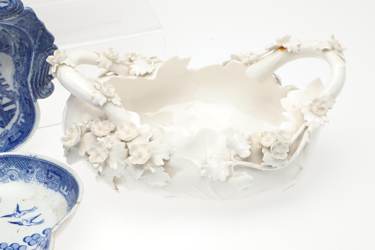 Et blandet parti inklusive et par blå og hvide tallerkener (19 cm på tværs), en New Hall underkop (14 cm i diameter), en Derby skål med to håndtag med indkapslede blomster og blade (23 cm på tværs, skader) og en skål med indkapslede blomster og frugt (28 cm på tværs).
