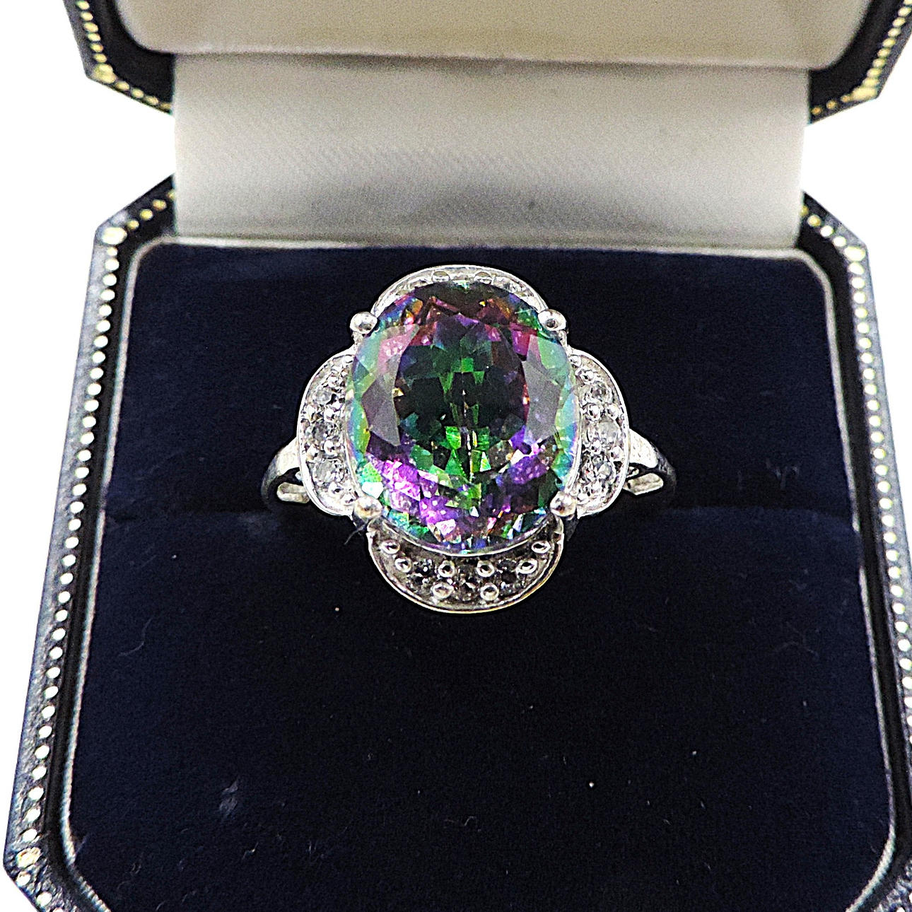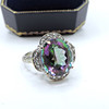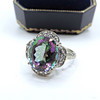 En smuk ring i sterlingsølv sat med en 11x9mm oval Mystic Topaz med hvide Topaz-sten sat i omgivelserne.