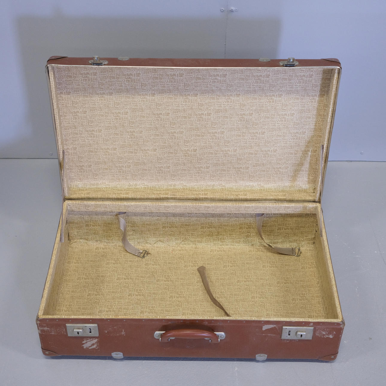 Kuffert, længde 75cm, bredde 44cm, højde 23cm.