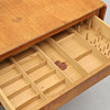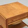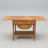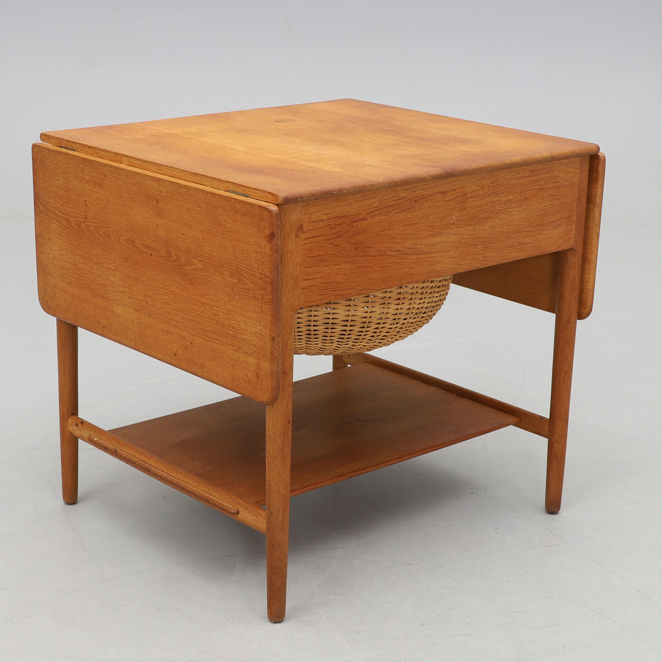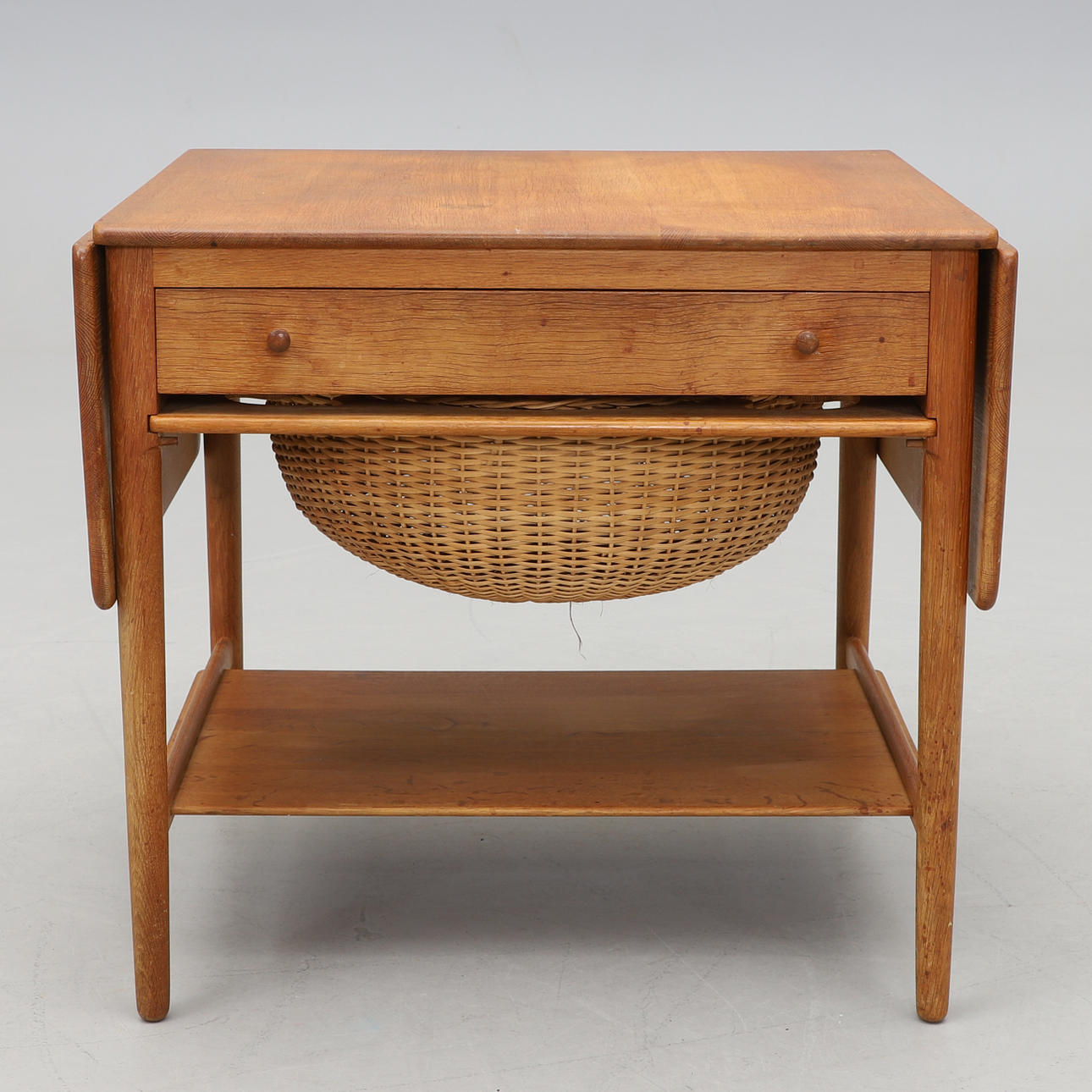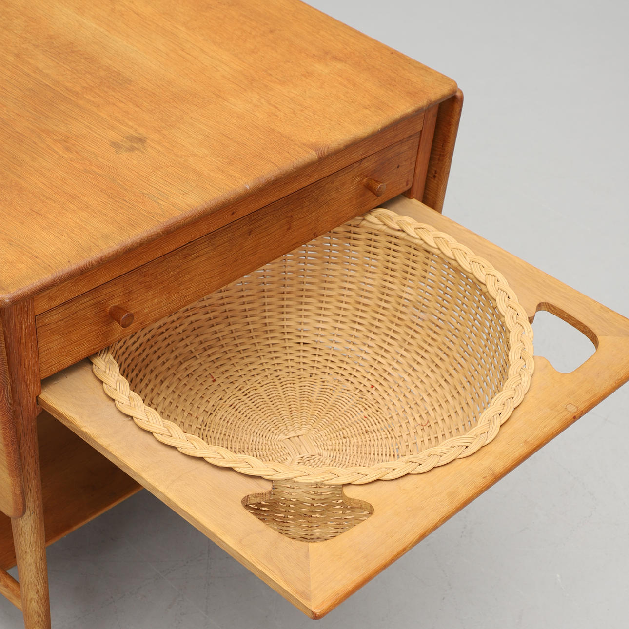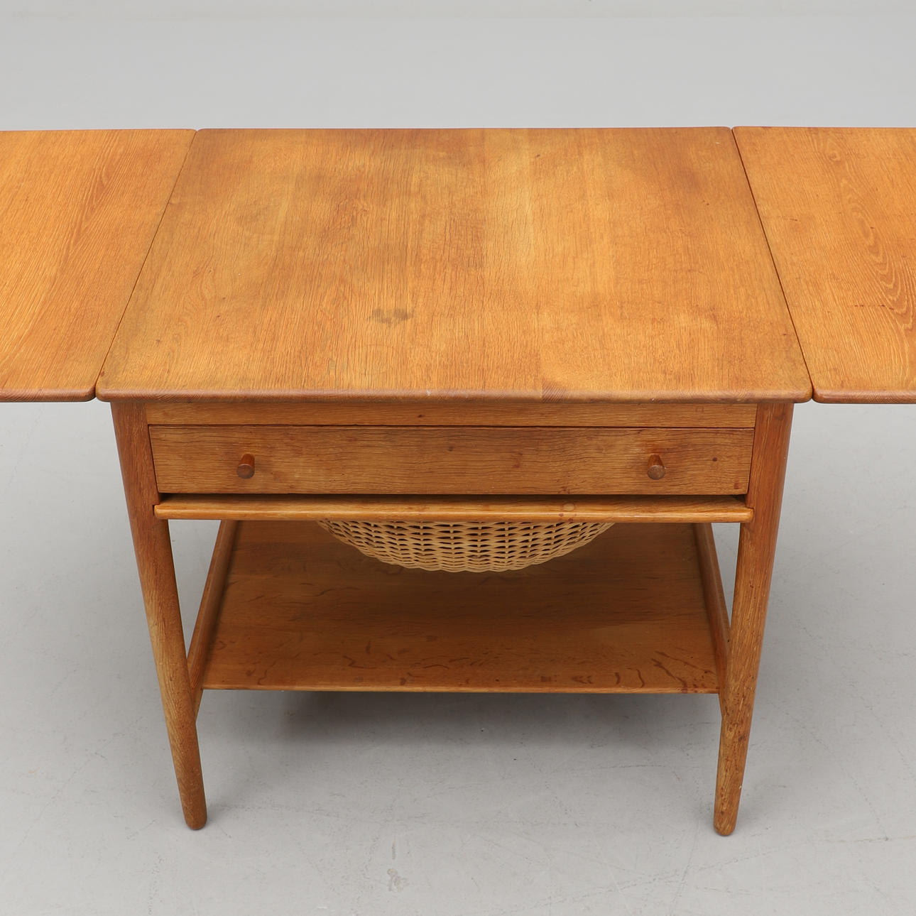 Ich. Bord med to foldeknapper. Udtræksskuffe med rumindvendigt. Udtræksskive med flettet kurv. Under hylder. Mærket. Længde 63,5 (streg 117,5), bredde 57,5, højde 60 cm.