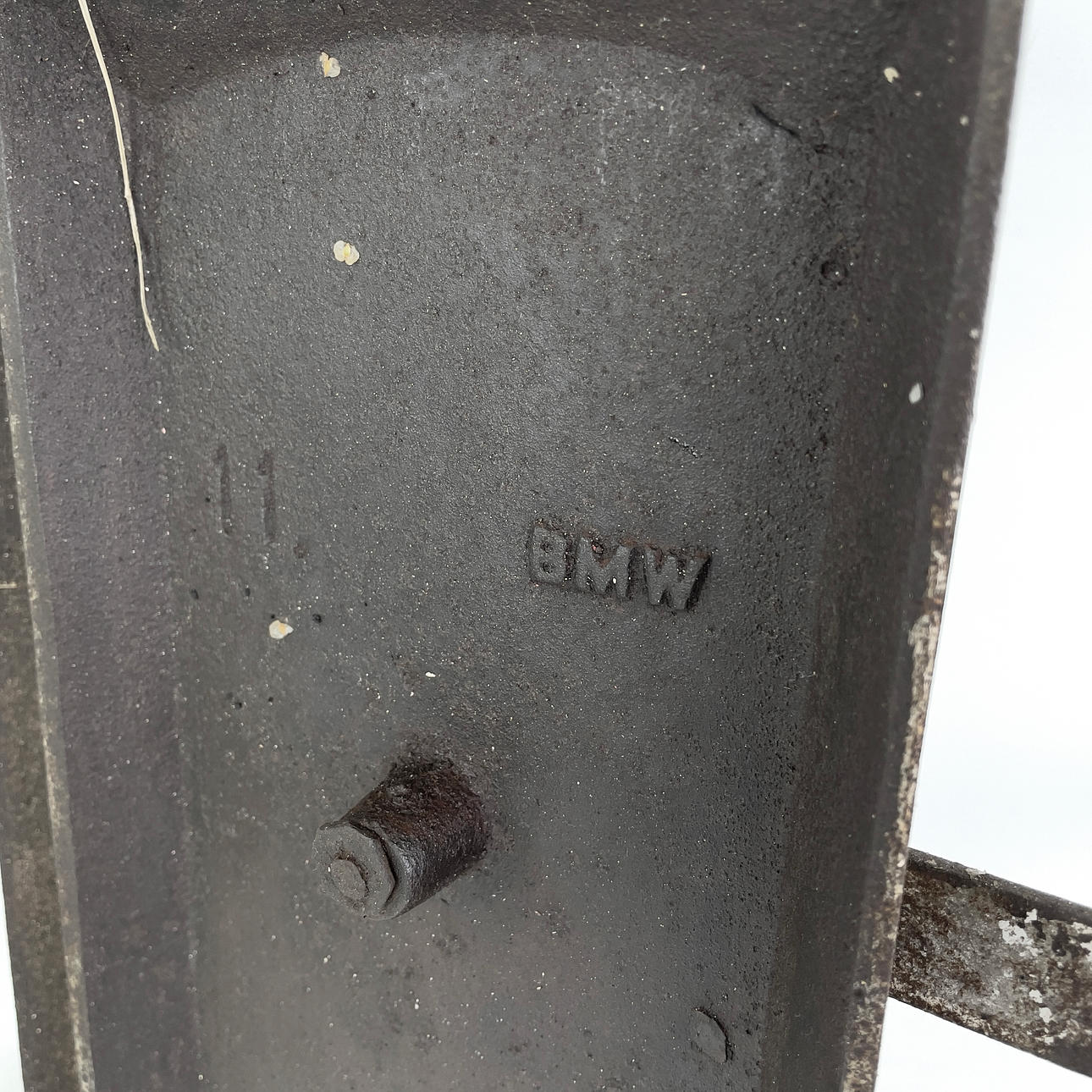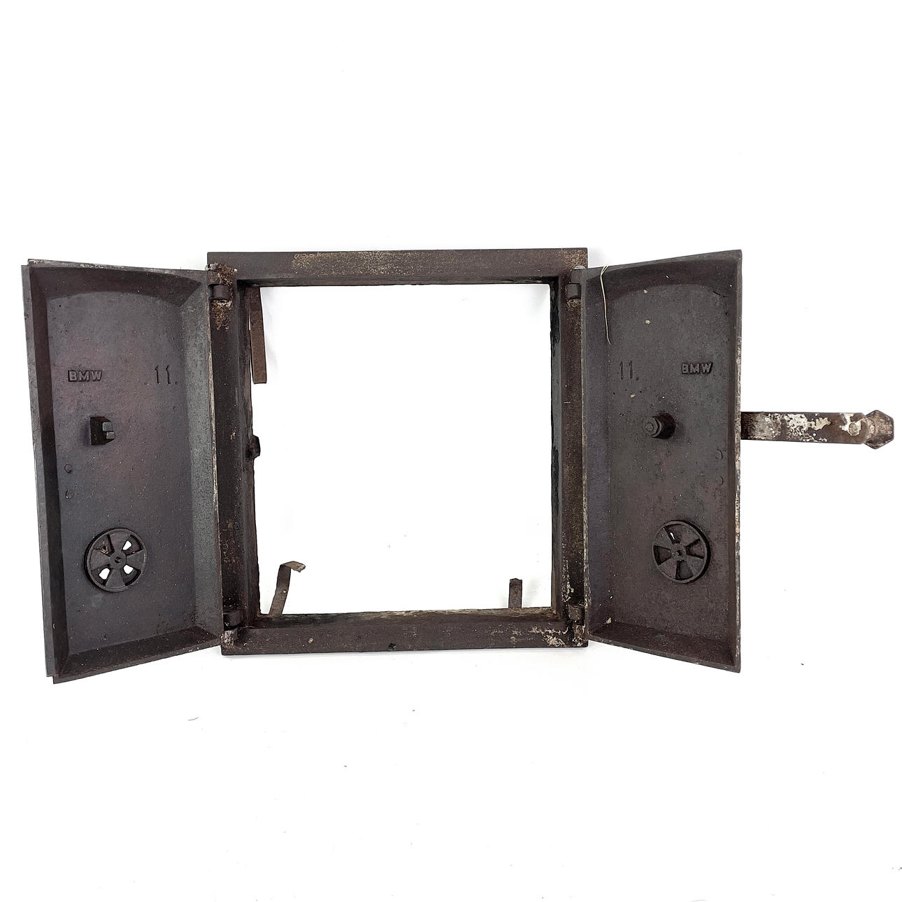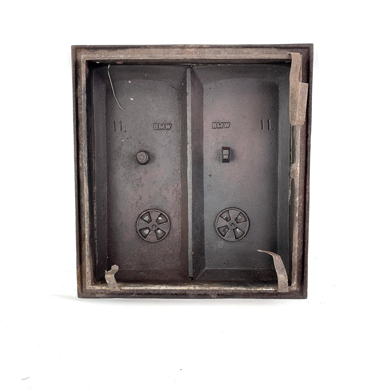 Komfurer med stel, støbejern, mærket „BMW“ og „11", mål ca. 33 x 36, dybde ca. 13 cm.