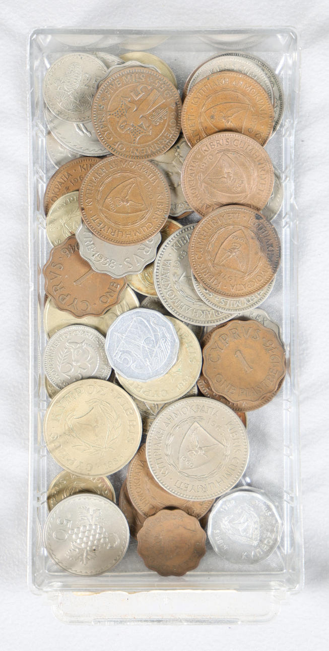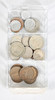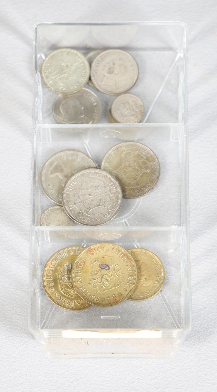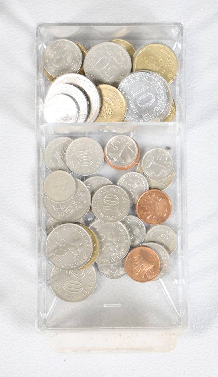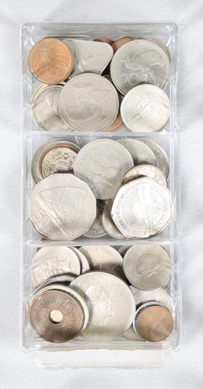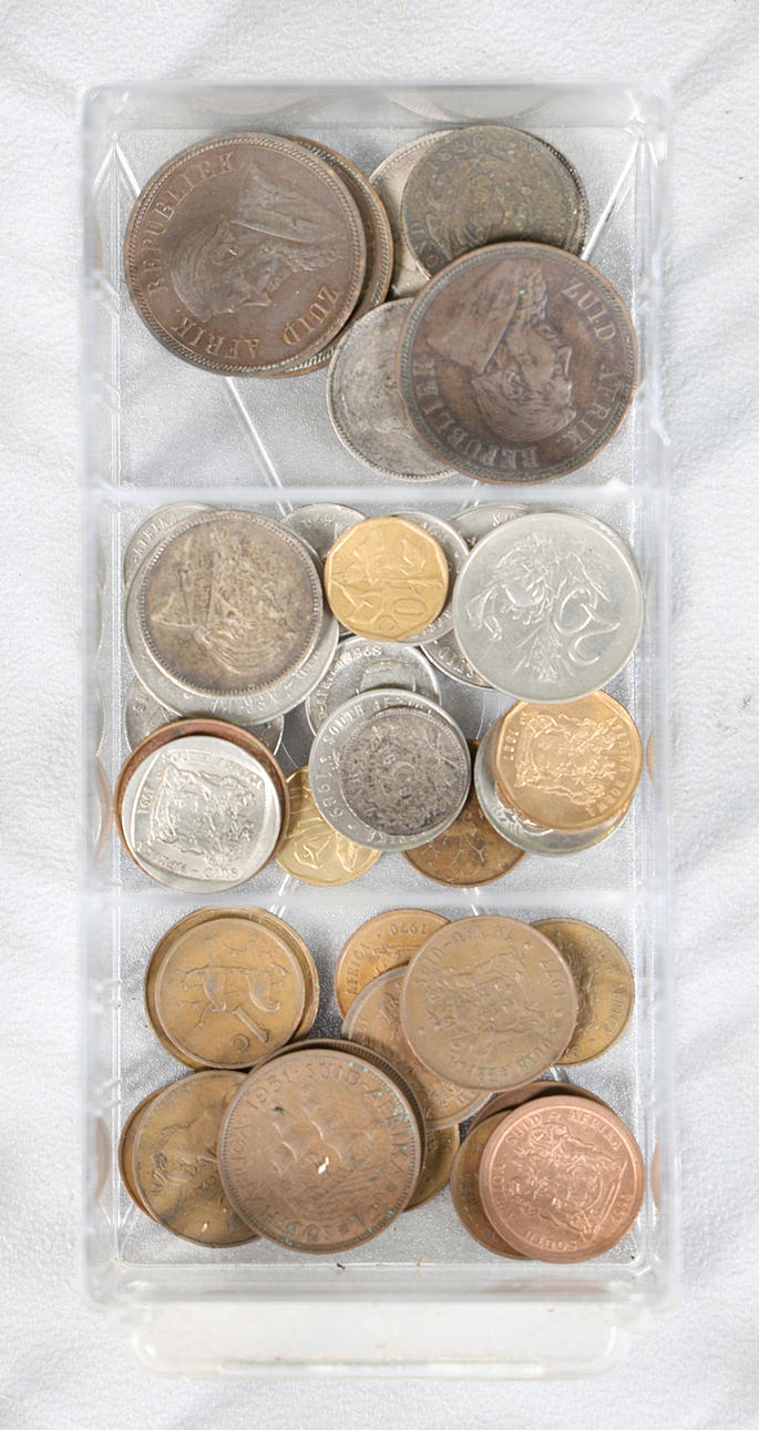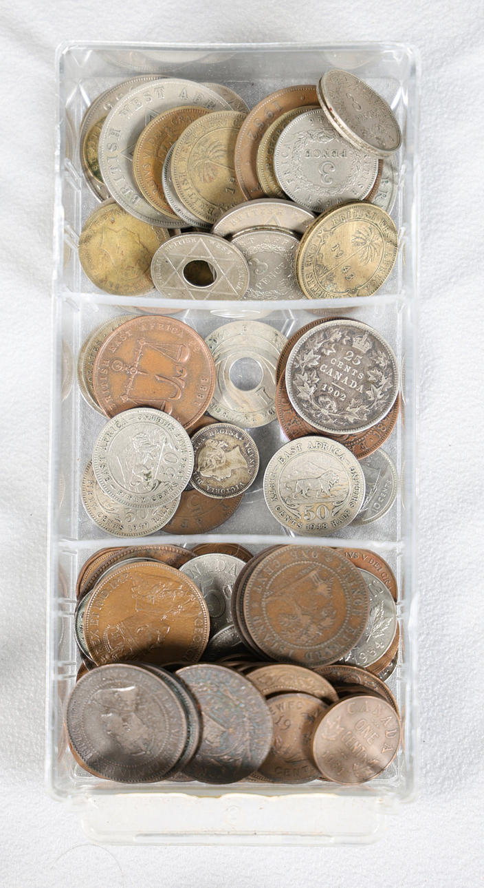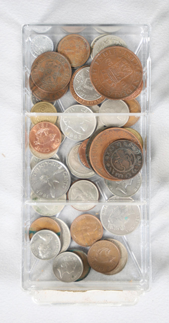 anbragt i to møntindsamlede sæt bakker til inkluderede mønter fra USA, Sydafrika, Canada, Fiji, Cypris, New Zealand, usorteret.