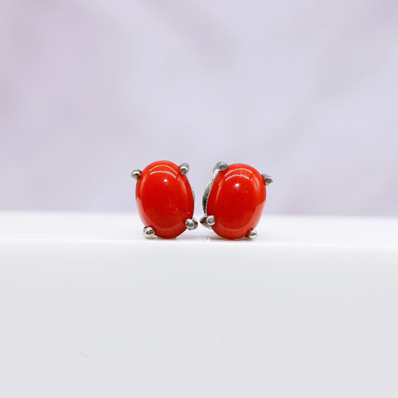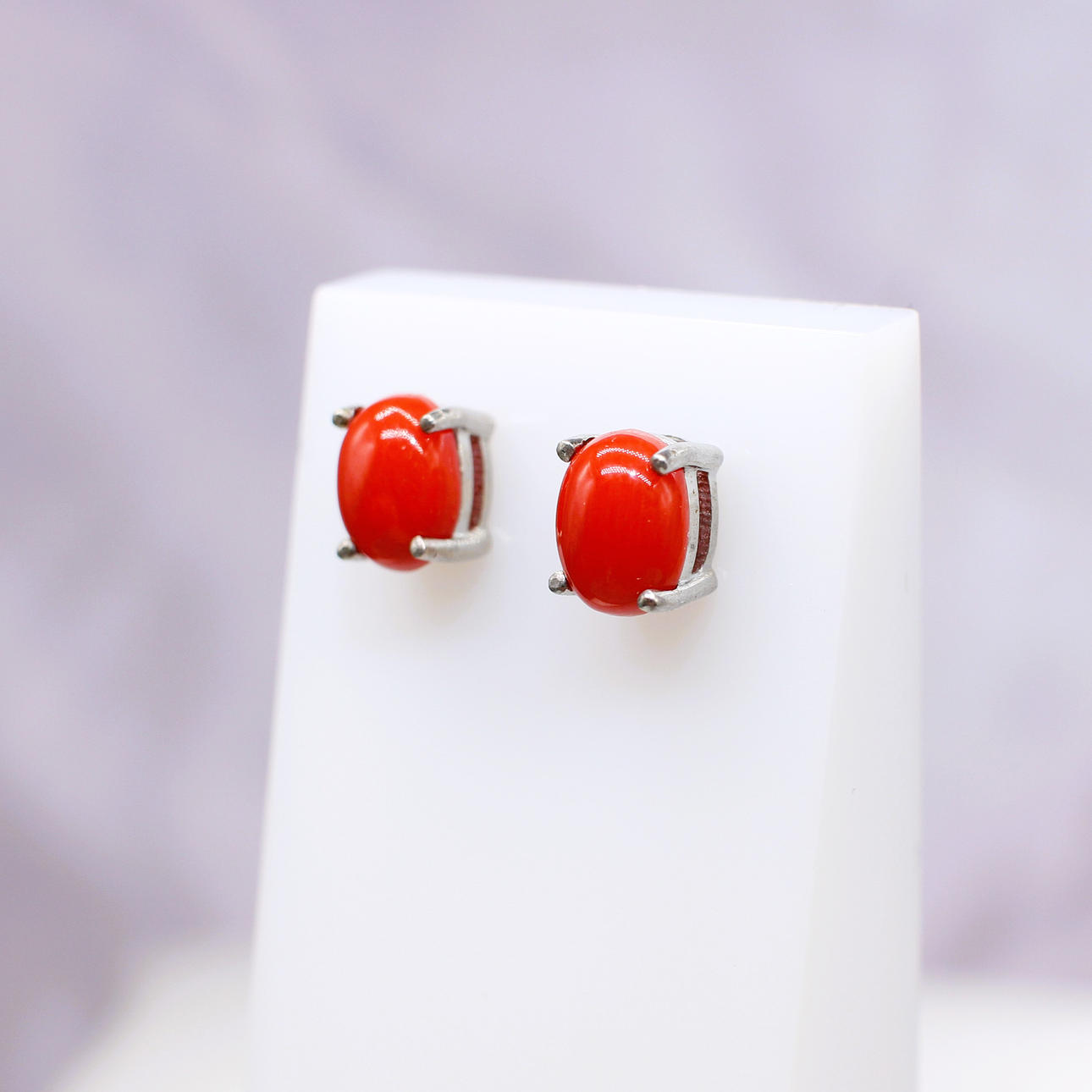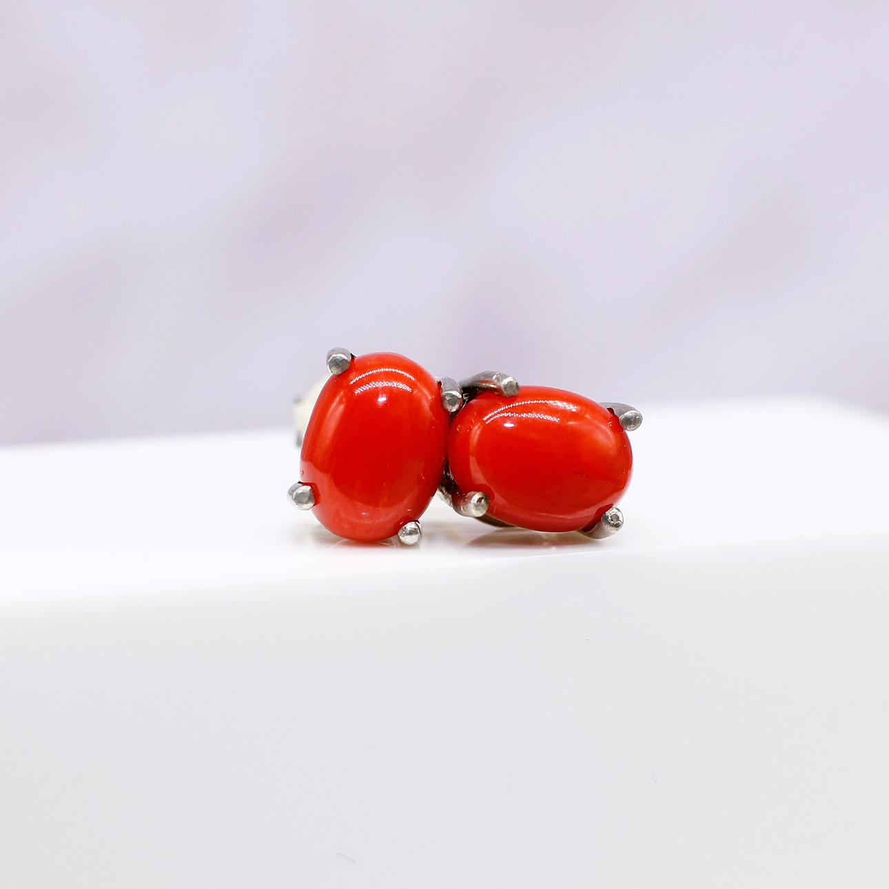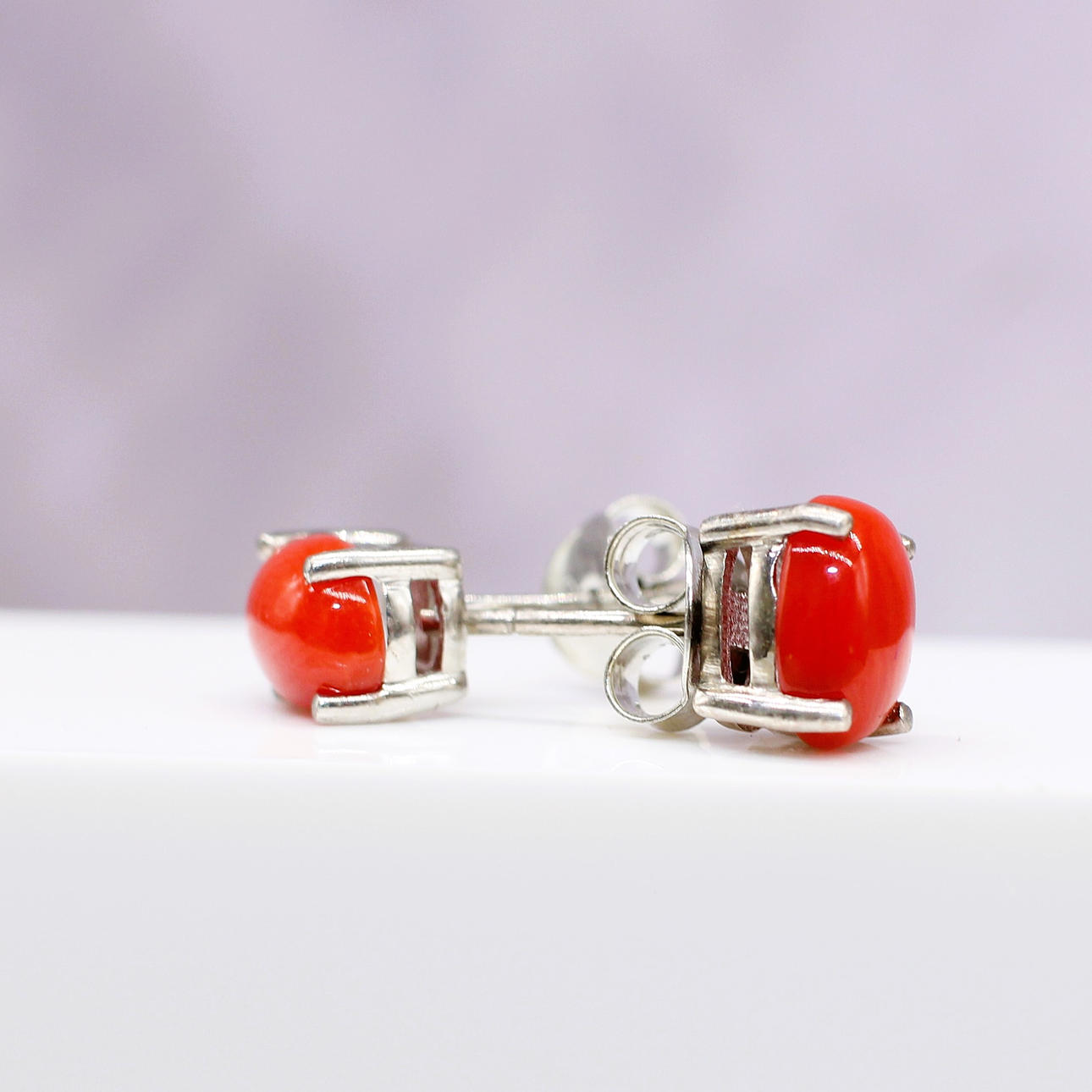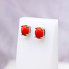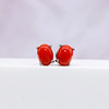 Hver stud er klosæt med en naturlig rød koral ædelsten, der måler 7½ x 5½ mm.
