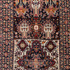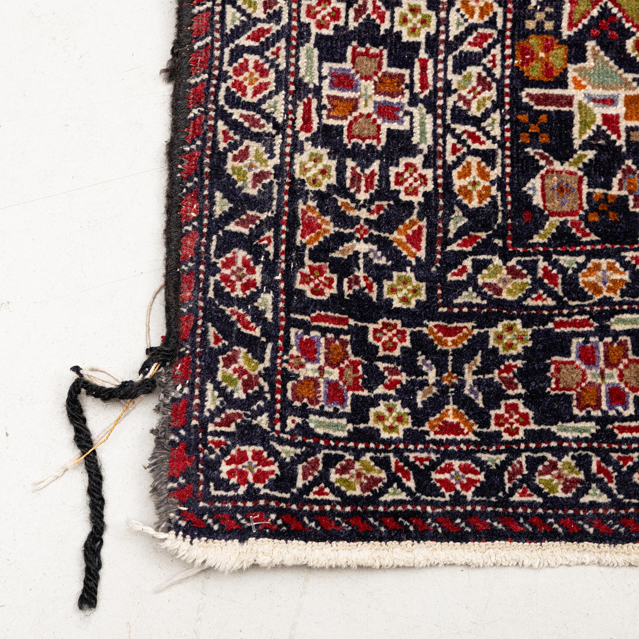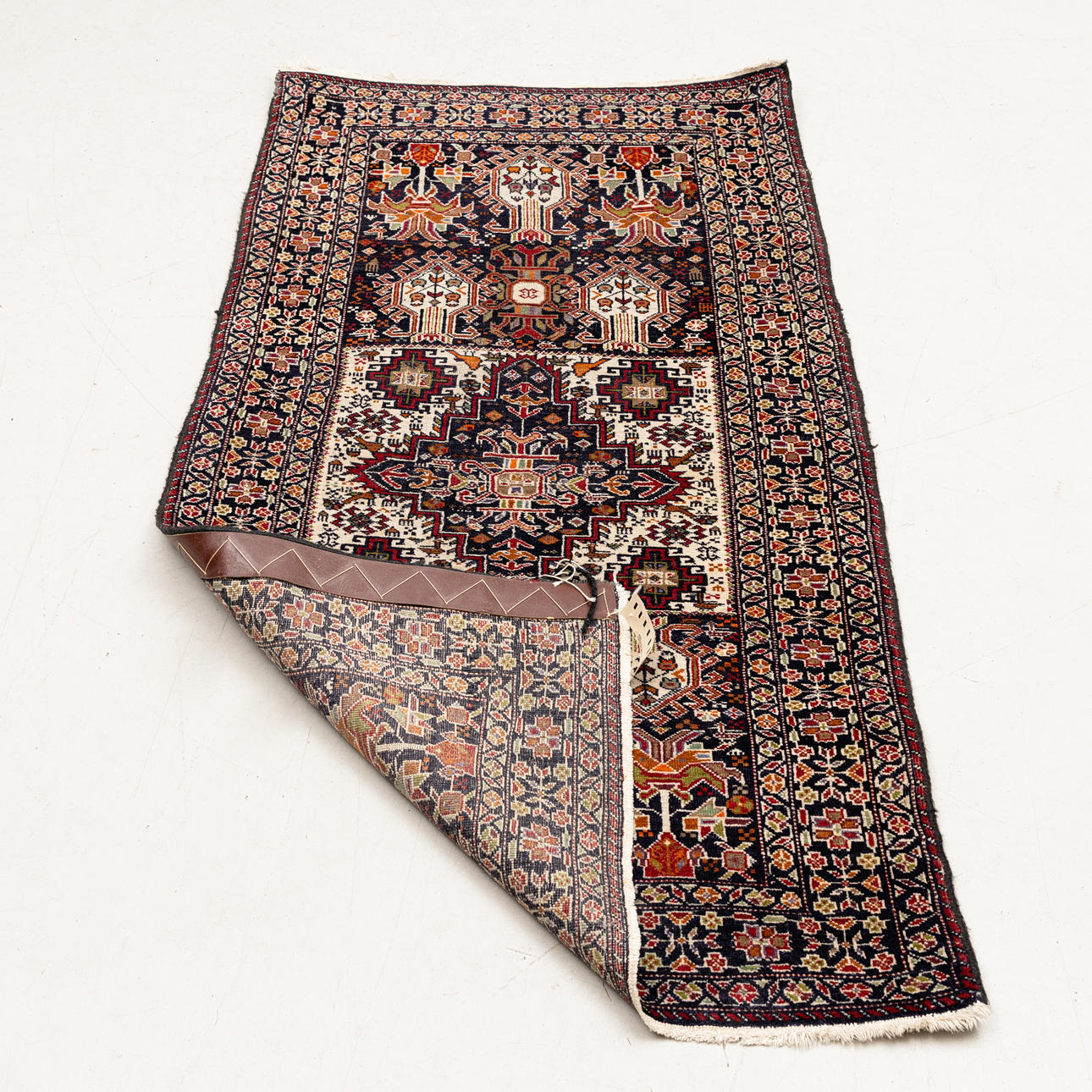 Mørkeblå bund, rigt polykrom geometrisk mønster med stiliserede blomster og fugle.