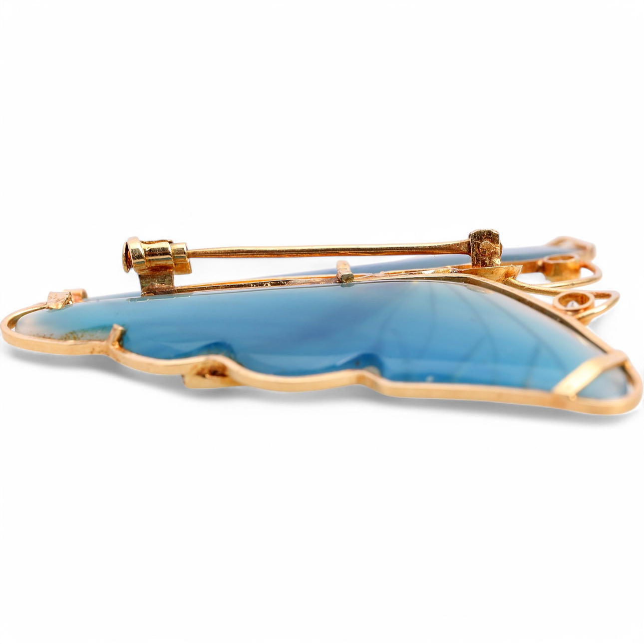 18K guld, brillantslebne diamanter, ca 0.06 ct. og blå agat. 4,8 x 4,9 cm 11 gr.