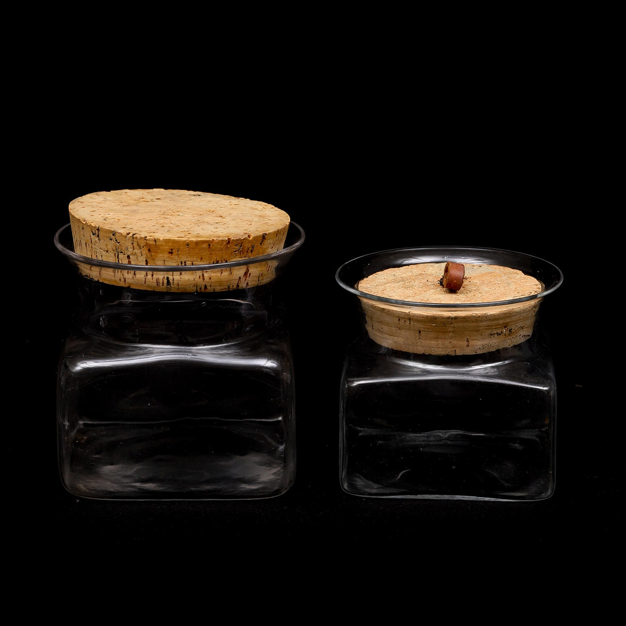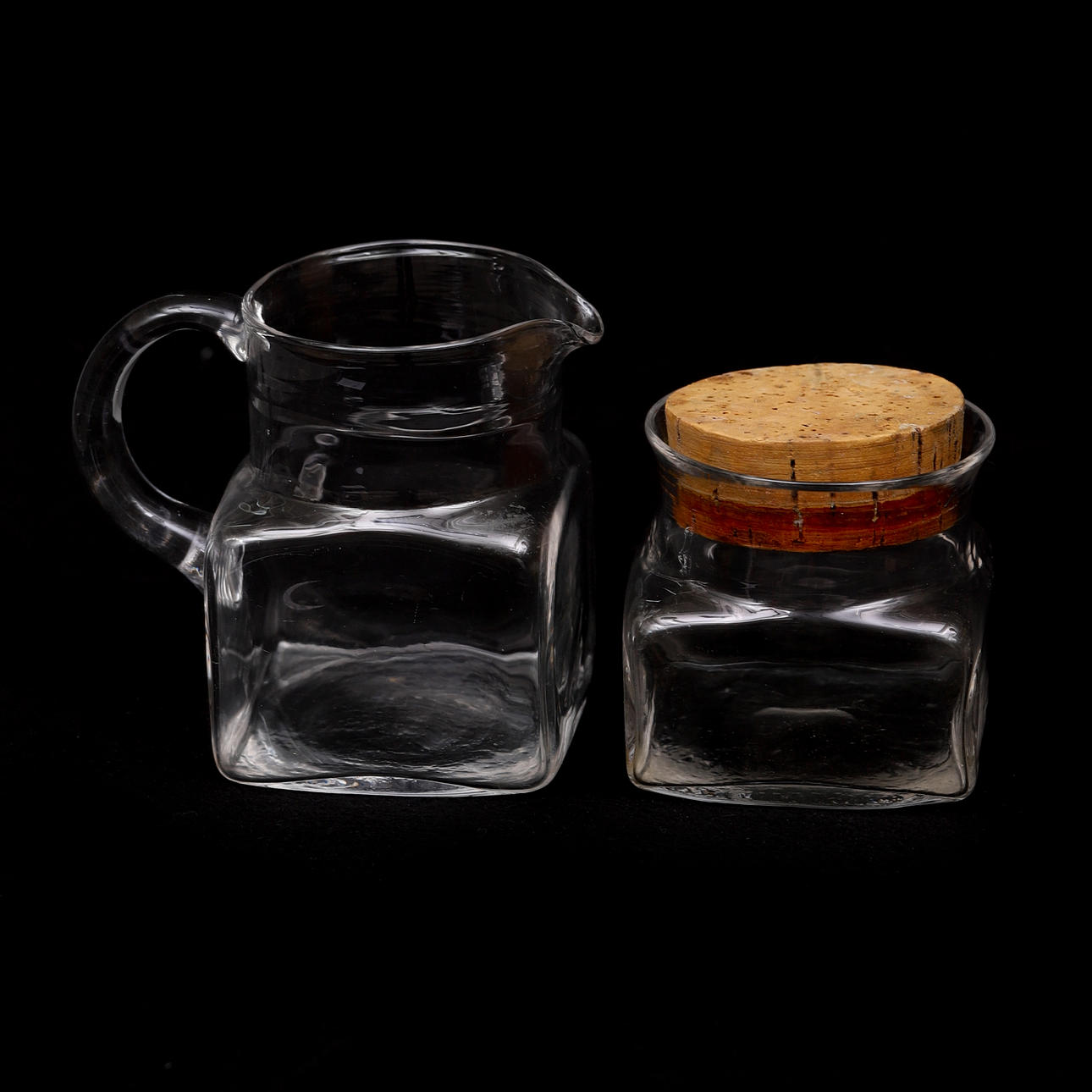 3 krukker med korklåg, en kande. Bredden af dåserne 9-12,5, højden af kanden 12,5 cm.