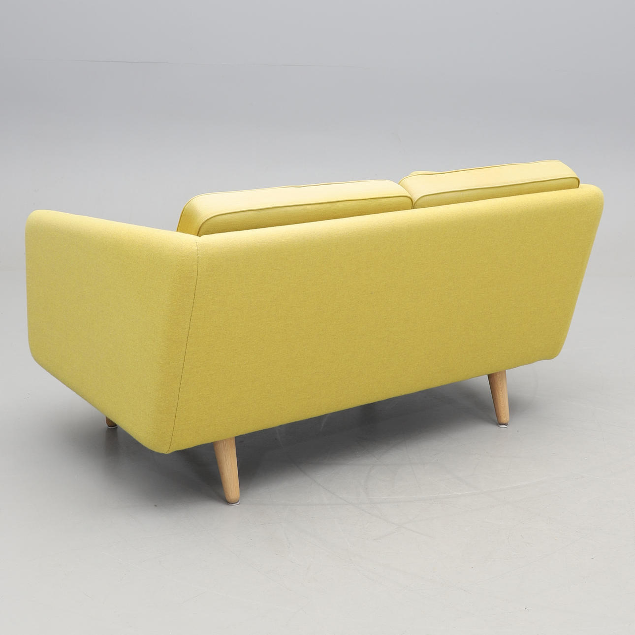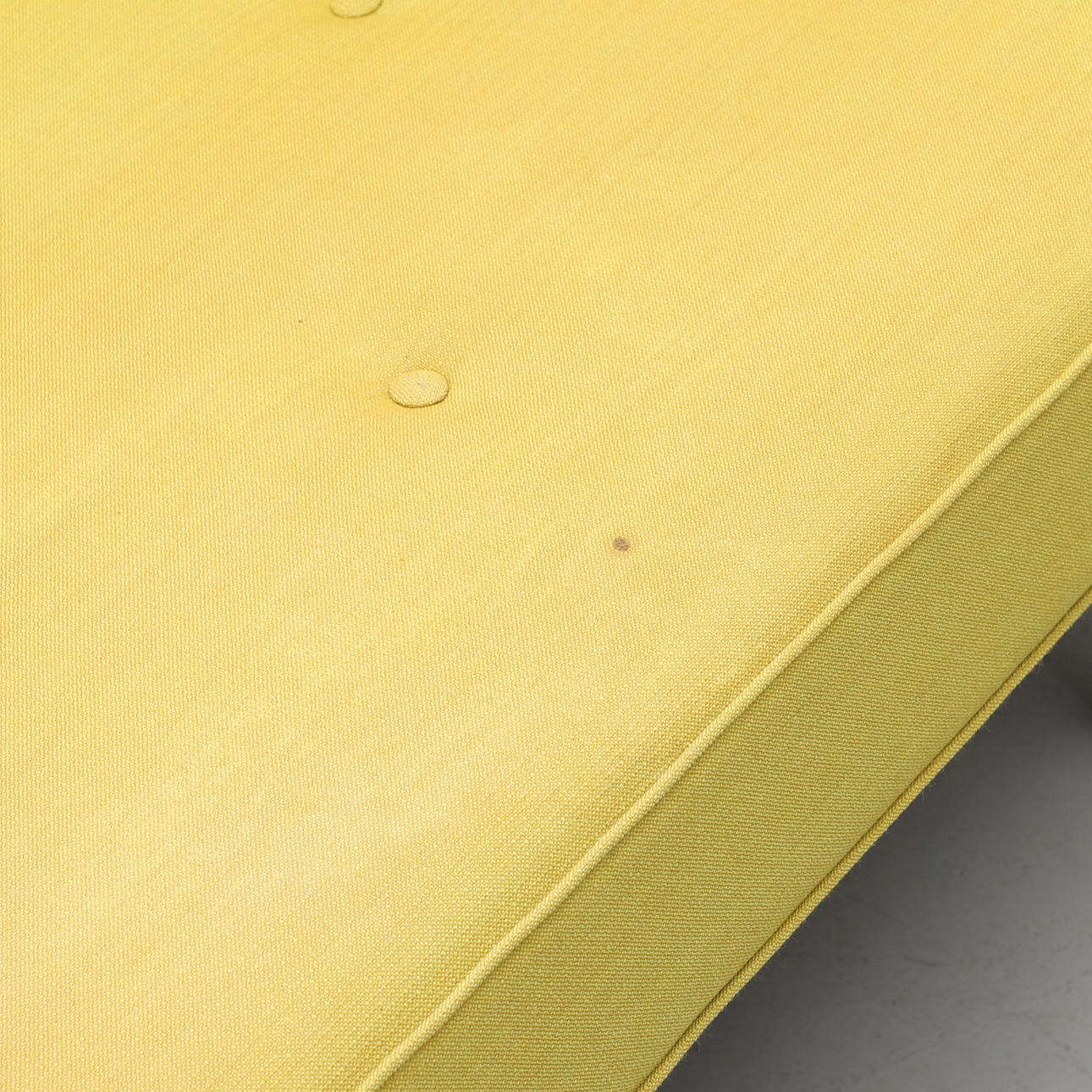 To-personers. Fuldt polstret med løse puder. Klædt i gult stof med knapper. Længde 142, dybde 86. Højde 72 cm.