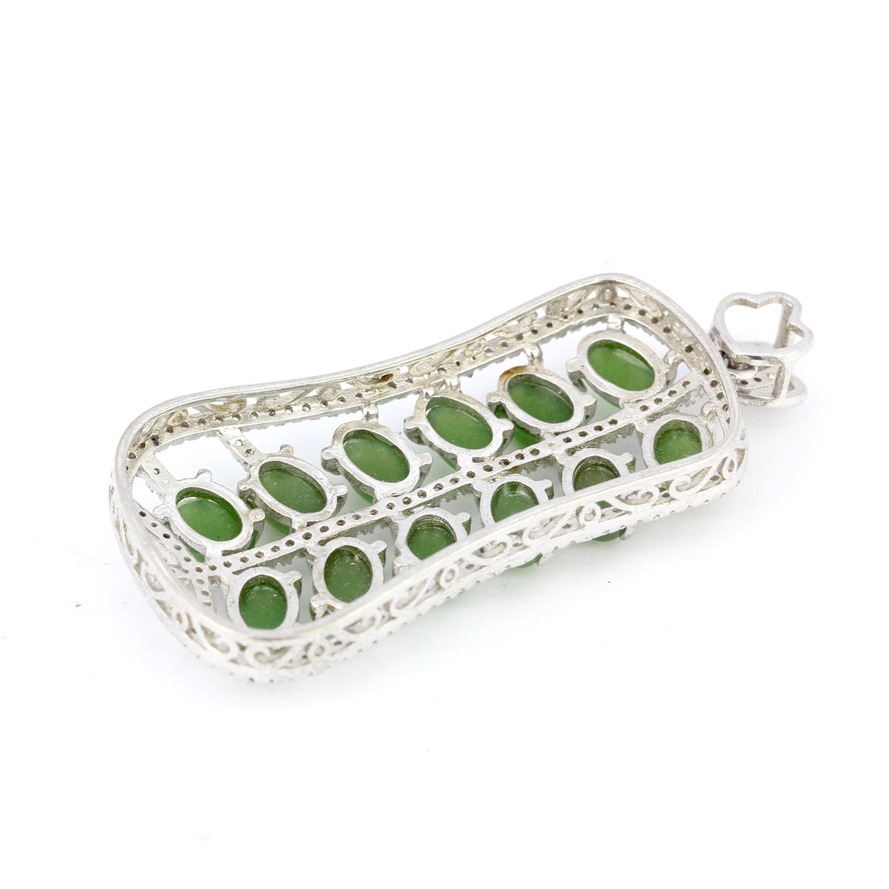 Et 18 karat hvidguldbelagt vedhæng sæt med jade og andre hvide sten. Størrelse: 5,1cm x 2.3cm.