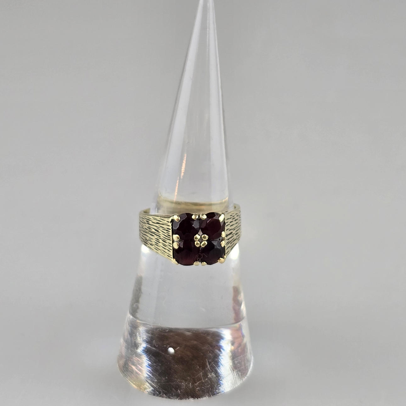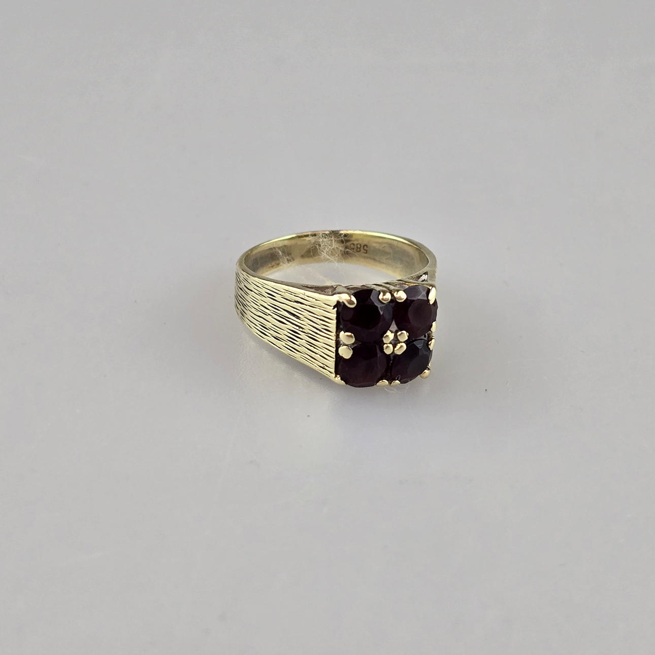 Stemplet „585", ringhoved sæt med fire runde facetterede granatsten (ca. 4 mm diameter), ringstørrelse 52, vægt ca. 4,9 g.