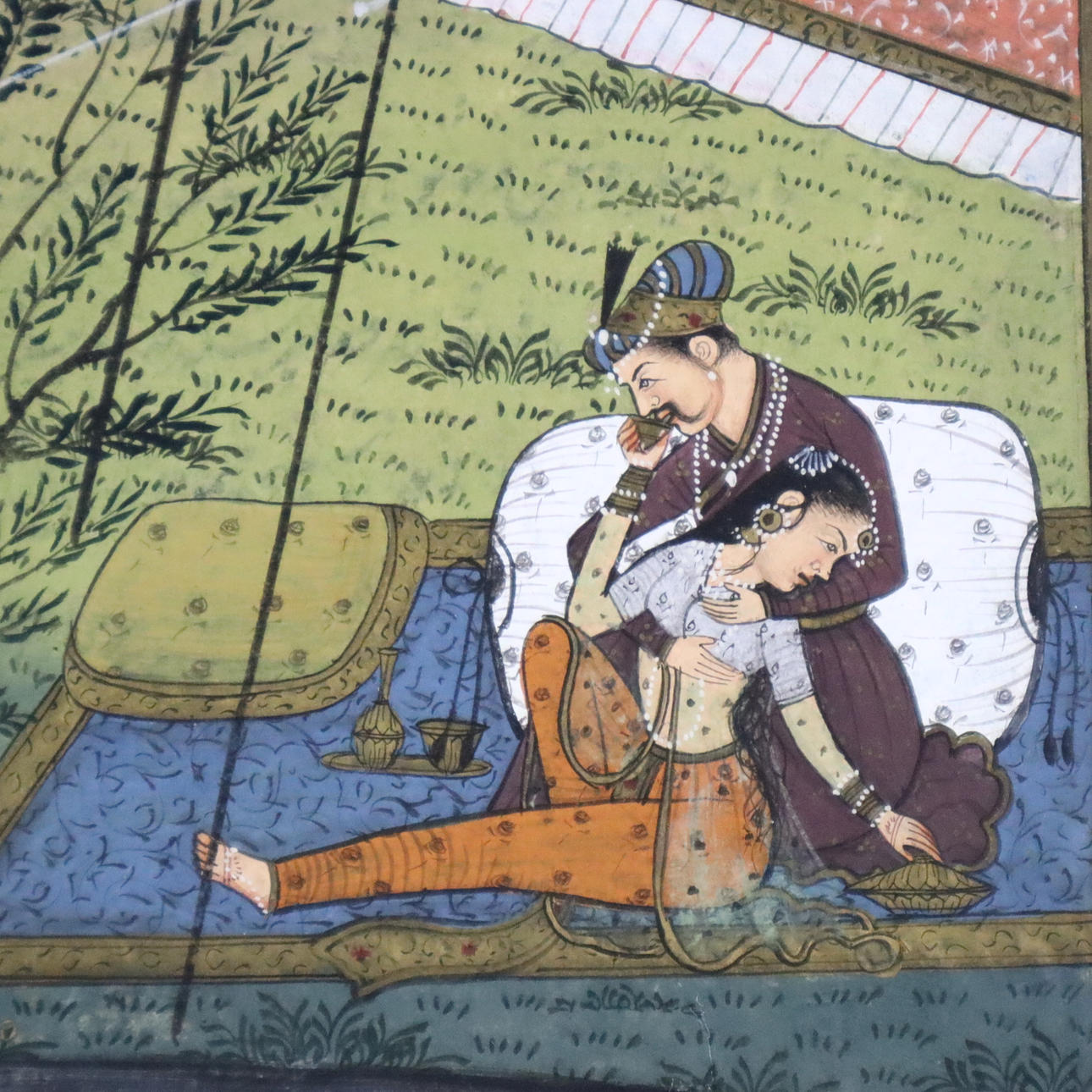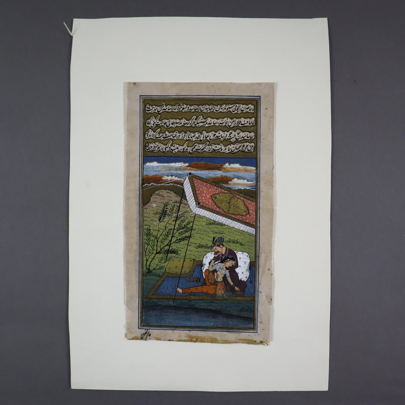 fint polykrom miniatyrmaleri på papir, der viser et par elskere i et telt, indskrevet øverst, arkstørrelse ca. 20,5 x 11,5 cm, samlede dimensioner ca. 30 x 21 cm.