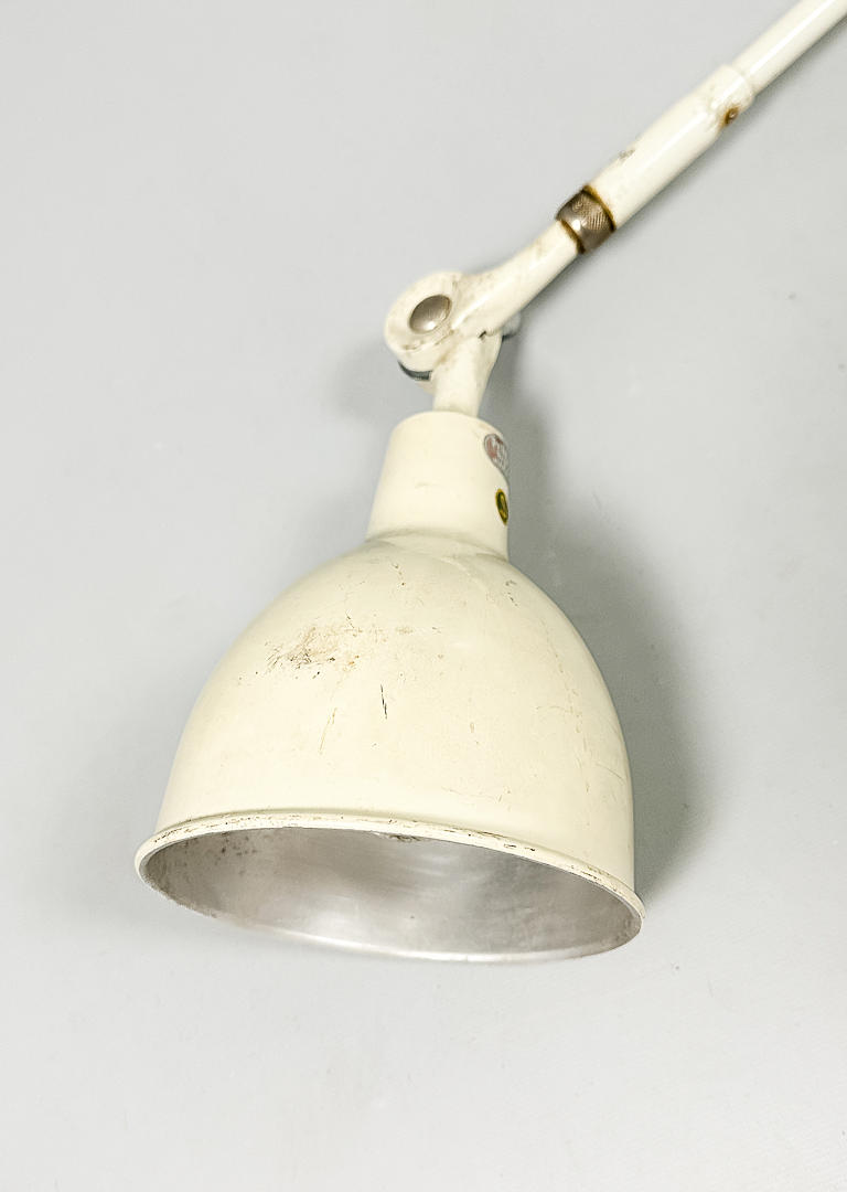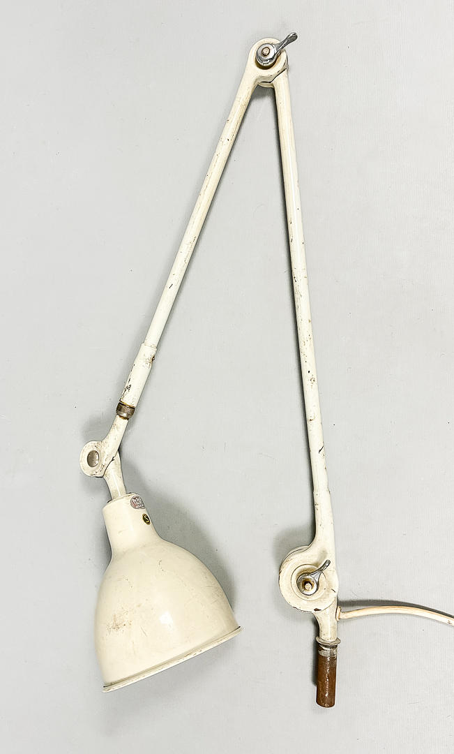Foldelampe, min. længde ca. 55 cm, stålskjold og arme. Skærmdiameter ca. 15 cm. Mærket.