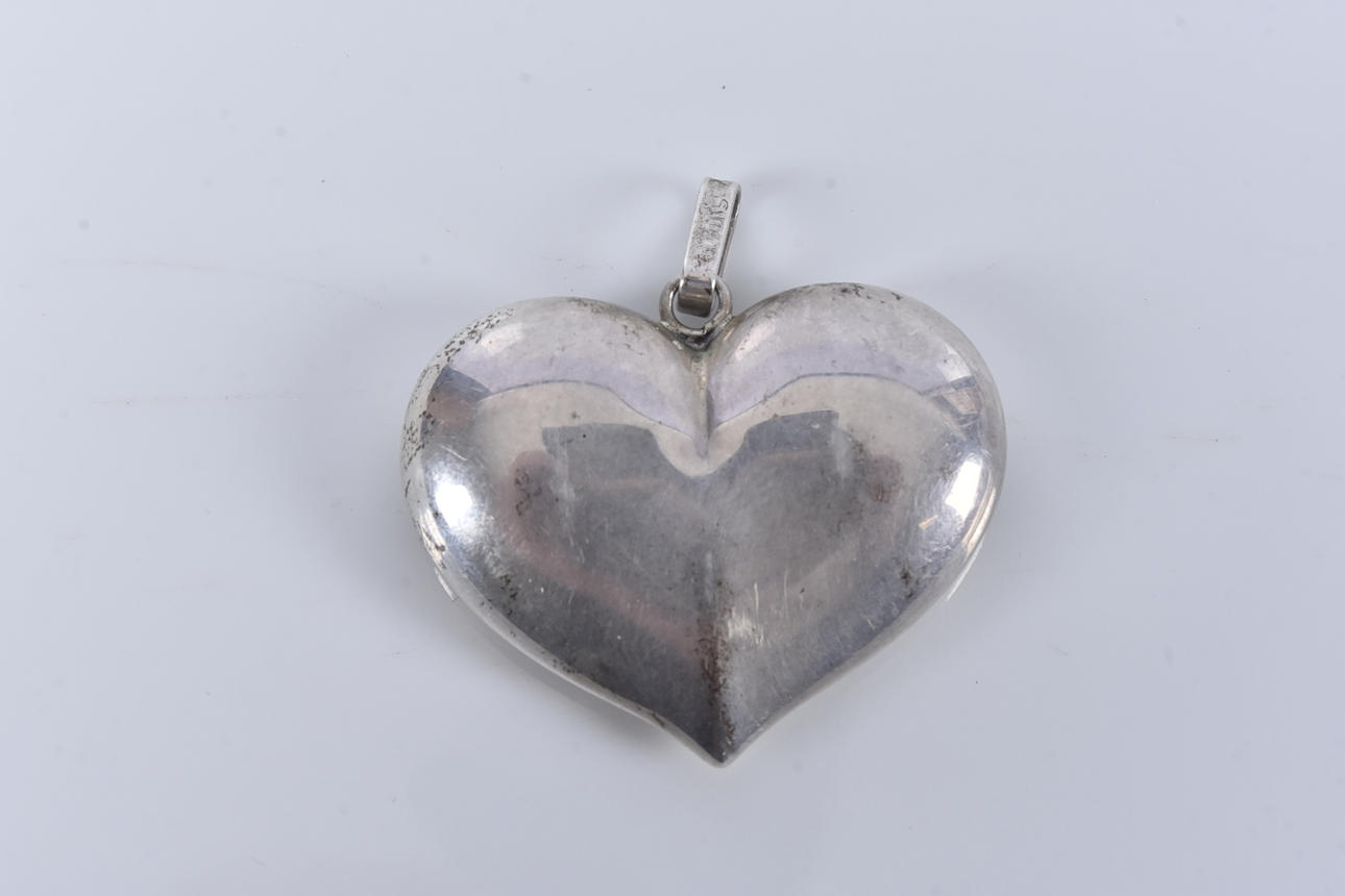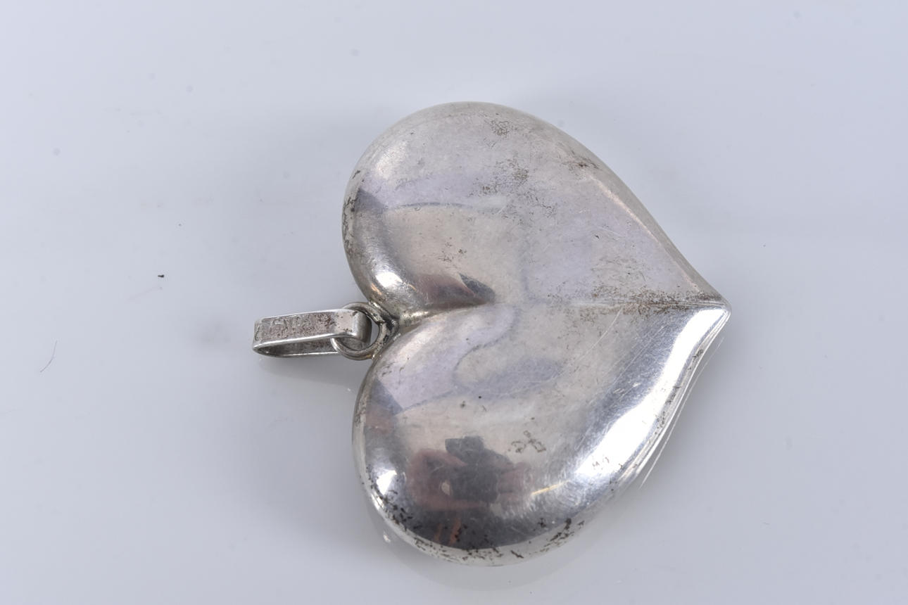 I form af et hjerte, vægt 9,9 gram, højde med løkke 45 mm, bredde 42 mm.