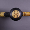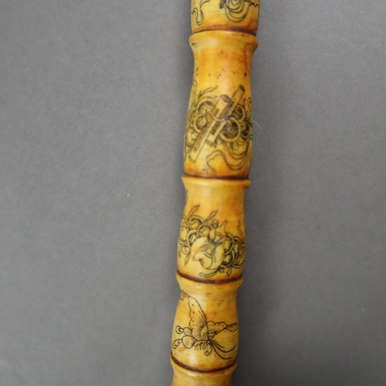 Opiumrør - Kina, knogle/træ, drejet, dekoration med udskårne og sorte skatte, sommerfugle og skildring af shoulao med hjorte og fersken, træmundstykke delvist beskadiget, metalsamling med reliefdekoration, endestykke mangler, l ca. 45,2 cm.