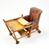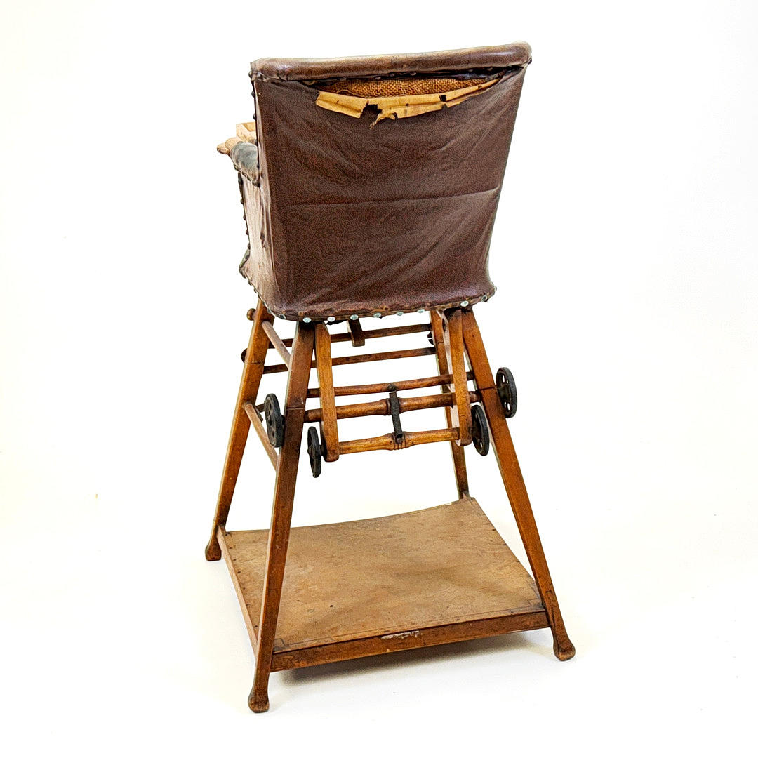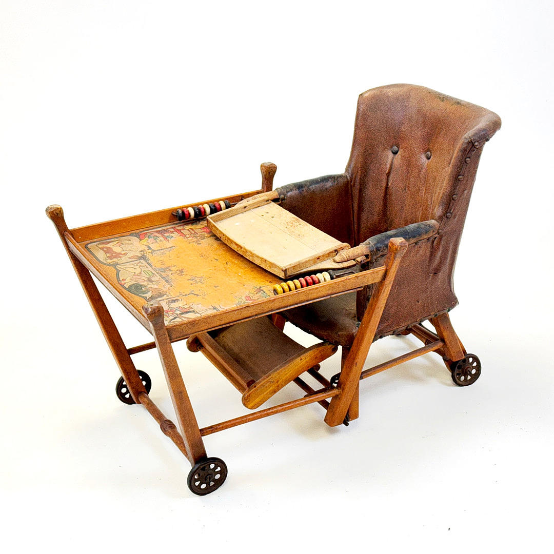 En metamorf babyhøjstol fra begyndelsen af det 20. århundrede, omdannet til en rullende babystol og spillebord, 96 x 45 x 65 cm.