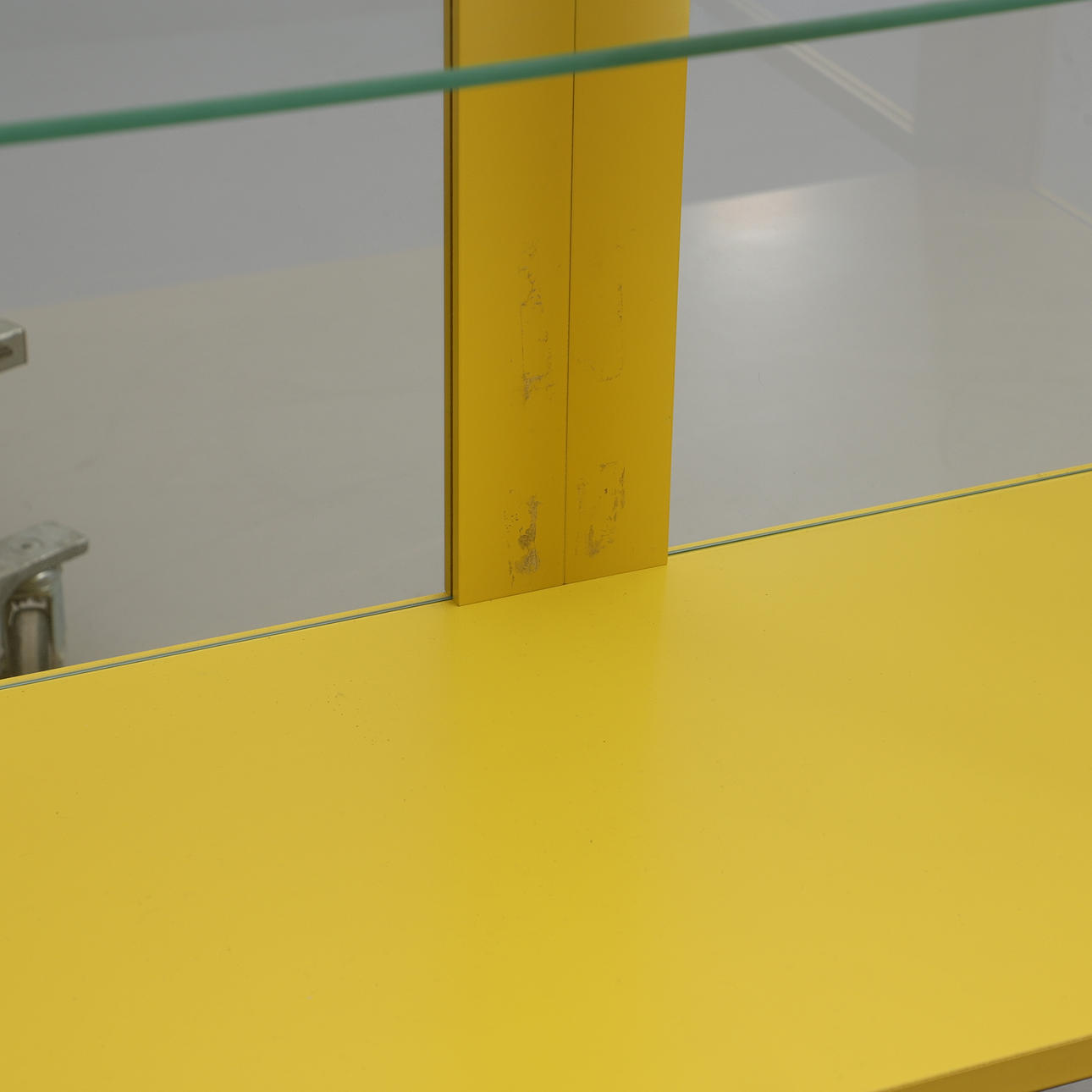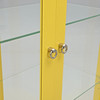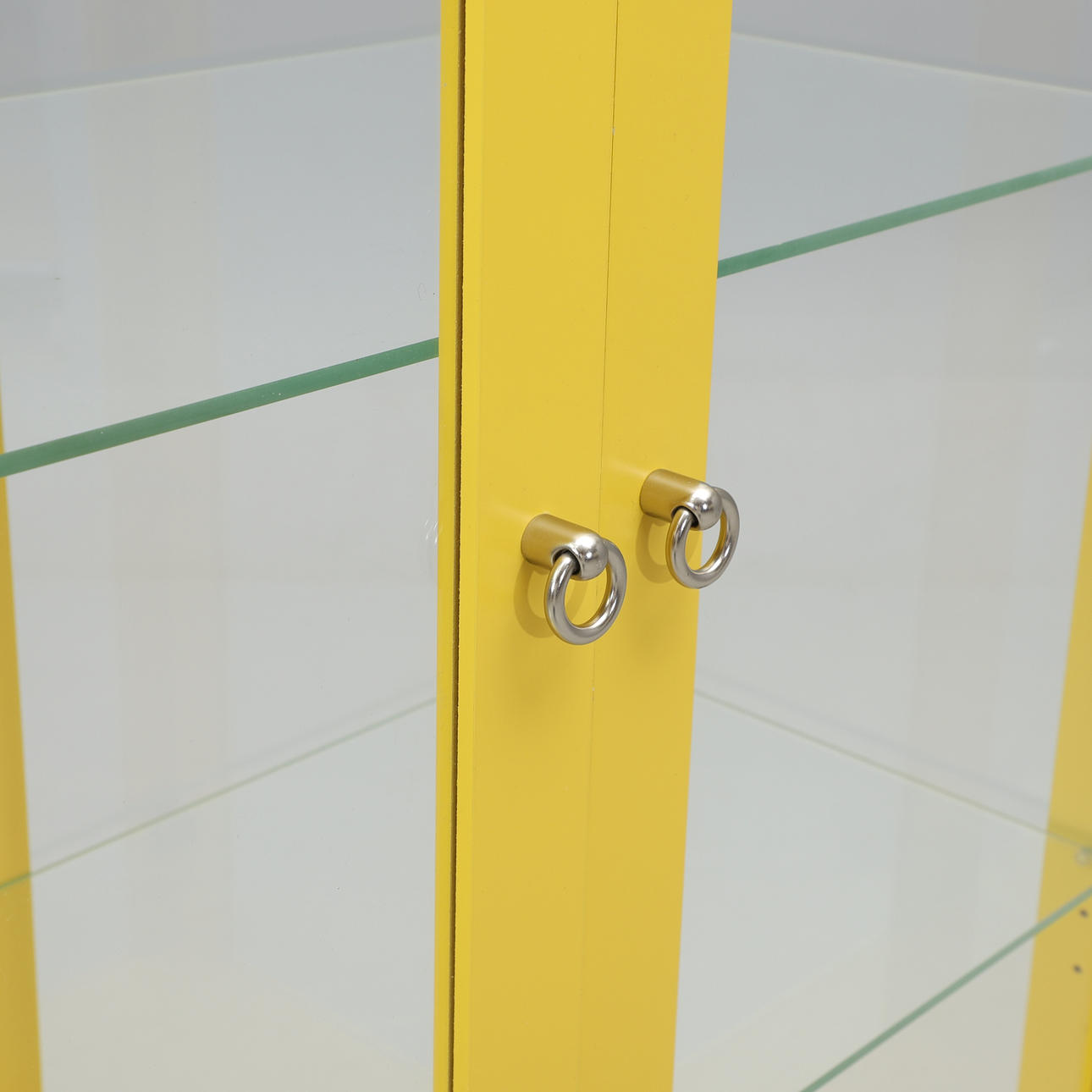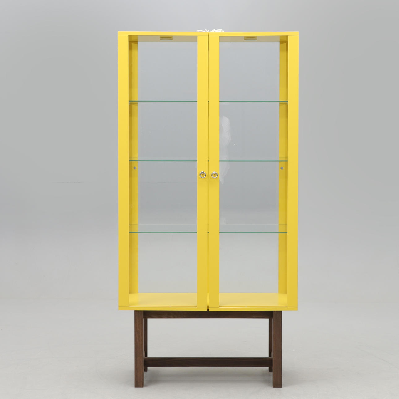 Guldlakeret med glaserede sider og døre, glashylder. Benstativ lavet af bejdset eg. Bredde 90, dybde 43, højde 180 cm.