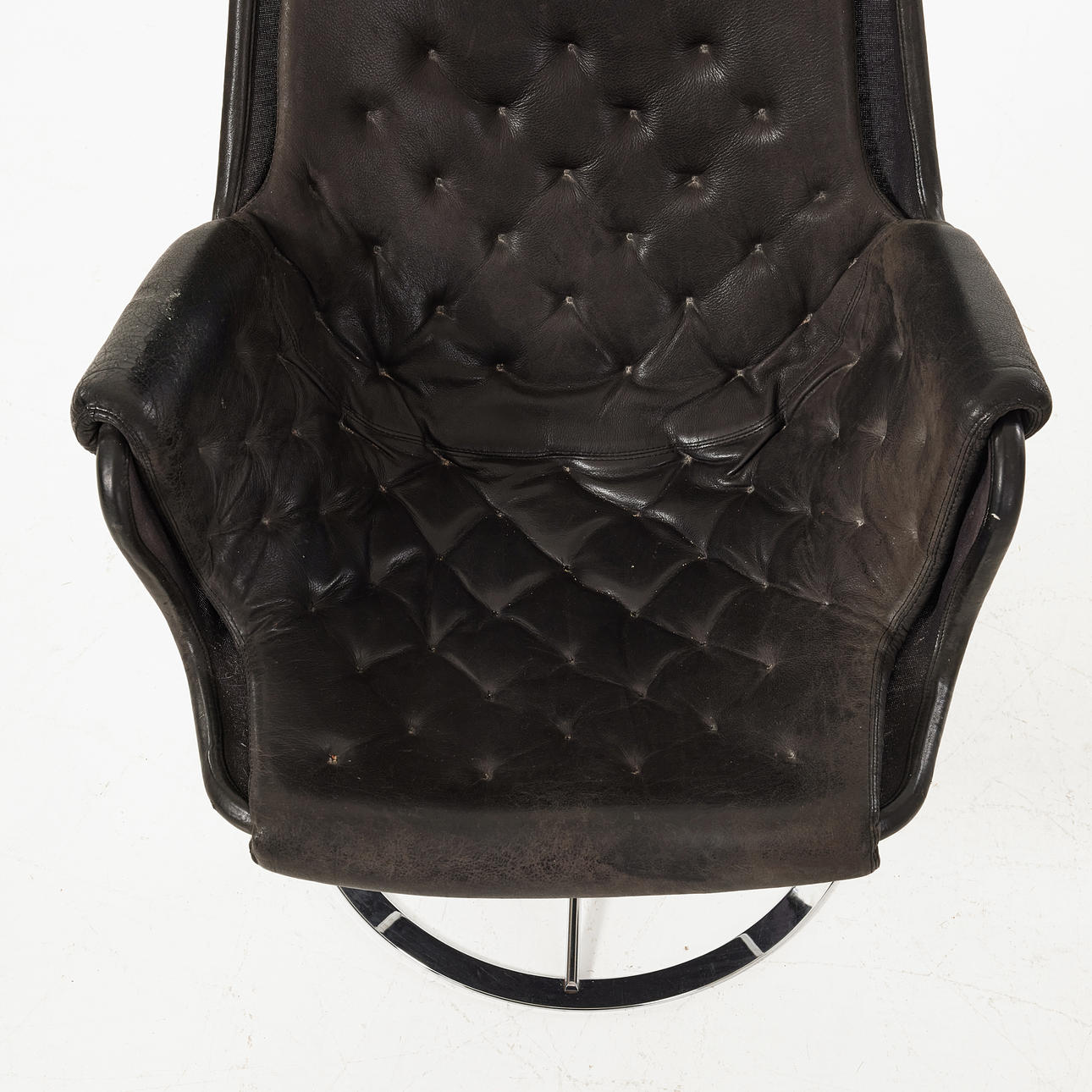 Sort læderbetræk, forkromet stel, sædehøjde ca. 42, ryghøjde 98 cm.