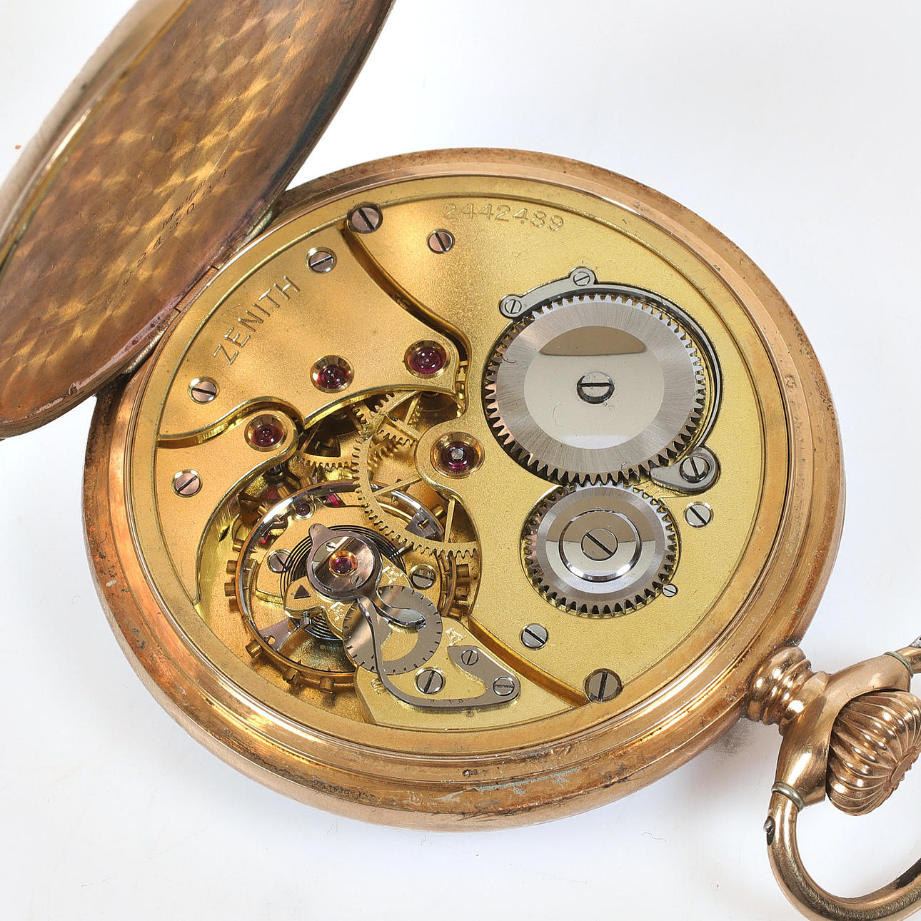 Urværk mærket „Zenit"H, værkstedsnummer 2442489,, kasse mærket „14k Zenith“, kasse nummer 243024, diameter 50 mm, vægt 80 gram.