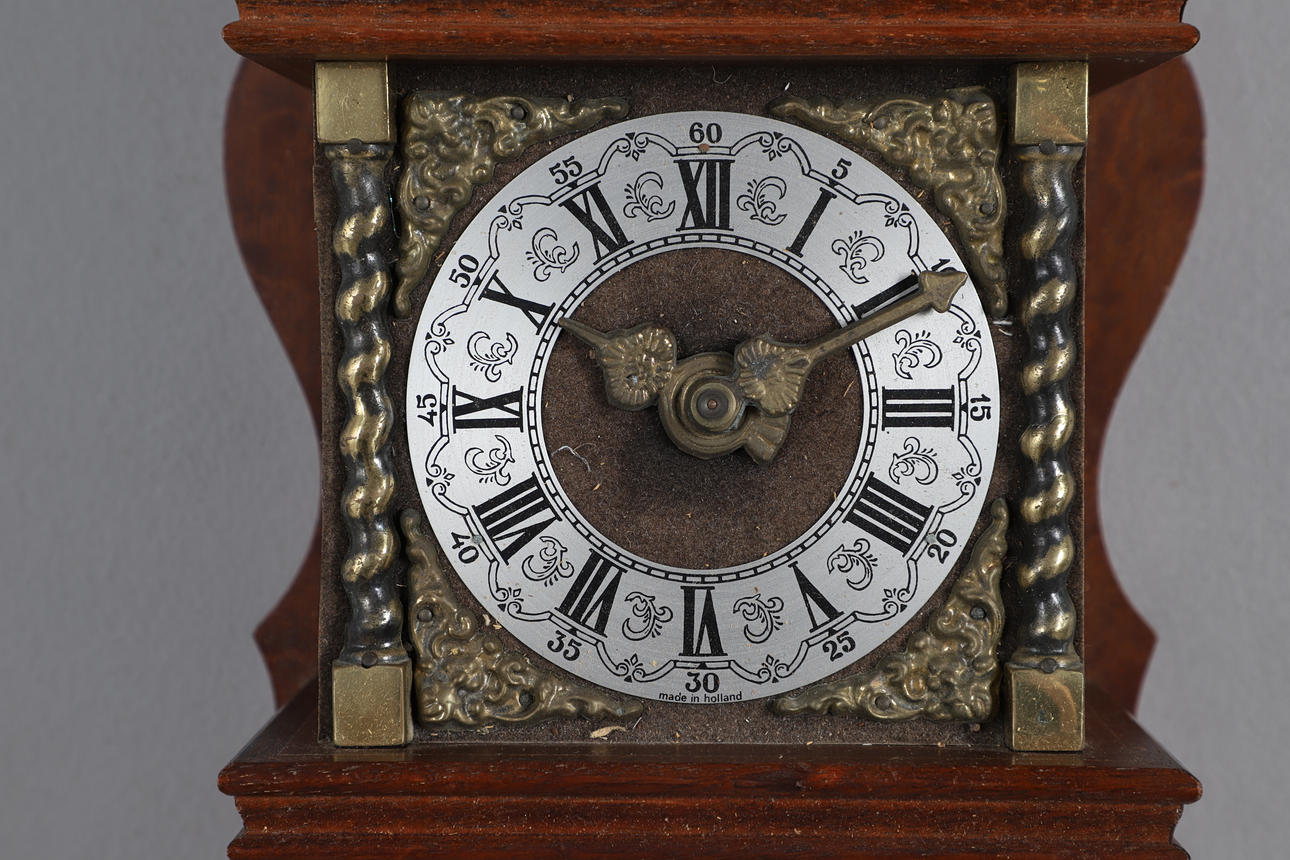 Midt i det 20. århundrede, med atlasoverhæng, den 11 cm forsølvede urskive med romersk kapitel inden for kerubspandrels, indeholdt i en mahognifinish. 50,5 cm høj x 21 cm bred x 13 cm dyb.