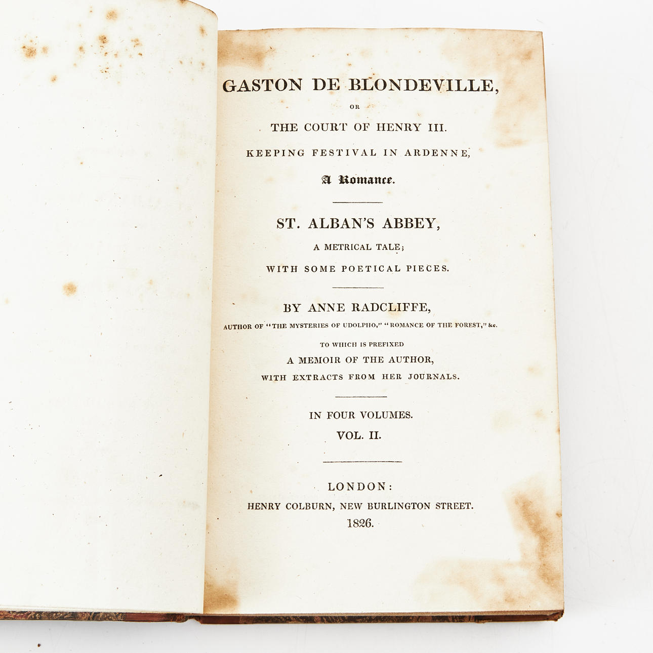 RADCLIFFE, MOR. Gaston de Blondeville, eller hoffet til Henry III... st. Albans kloster, en metrisk fortælling... til hvilken der er præfikset en erindring om forfatteren.. London, Colburn, 1826.
