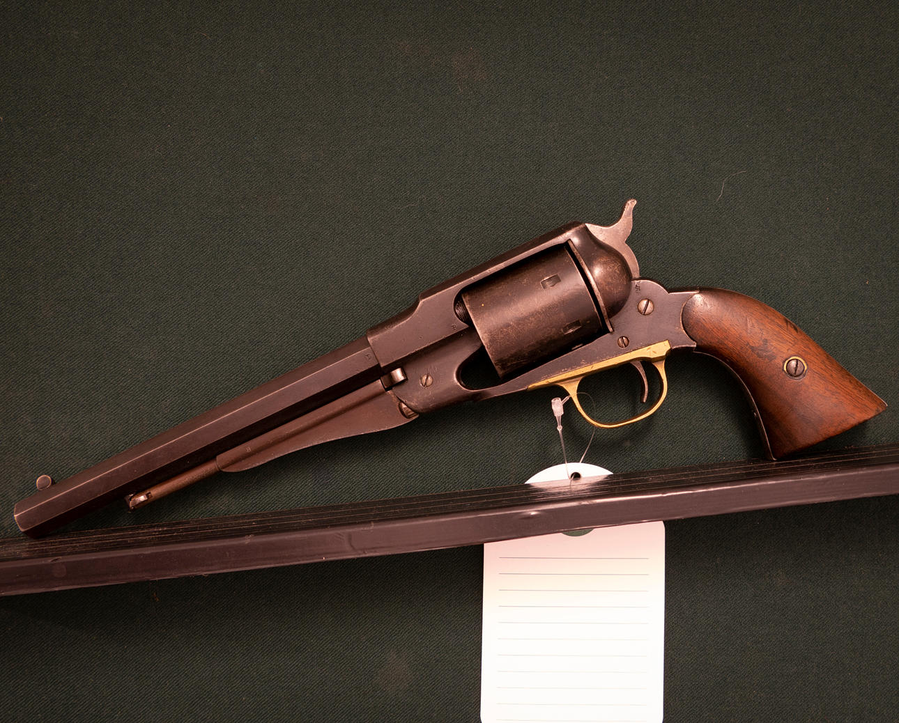 Revolver American Make Remington Caliber 44-40. Supplerende nr. 412. Tudlængde 20cm Ottekantet. Stempelsider lavet af træ. Messing varmebøjle.