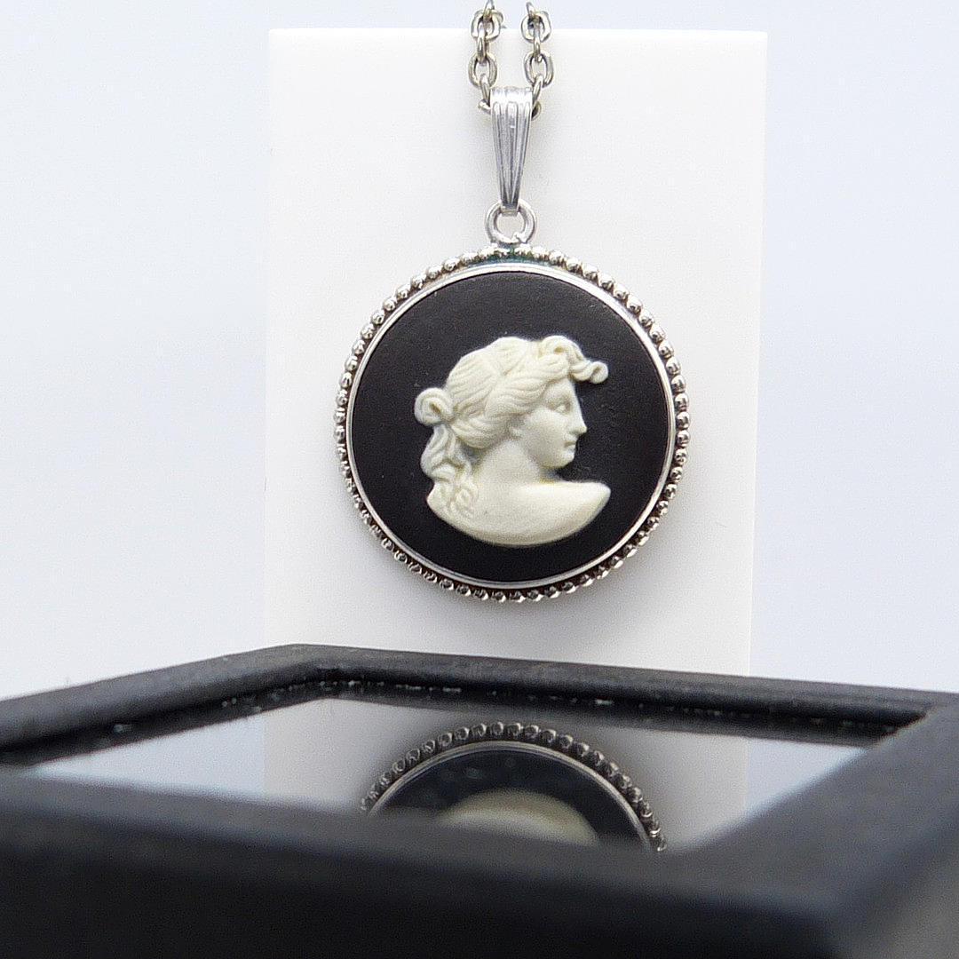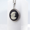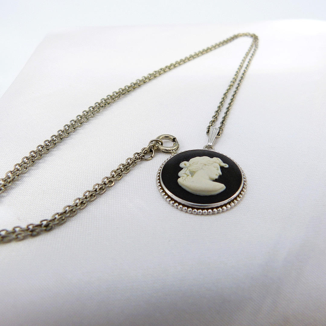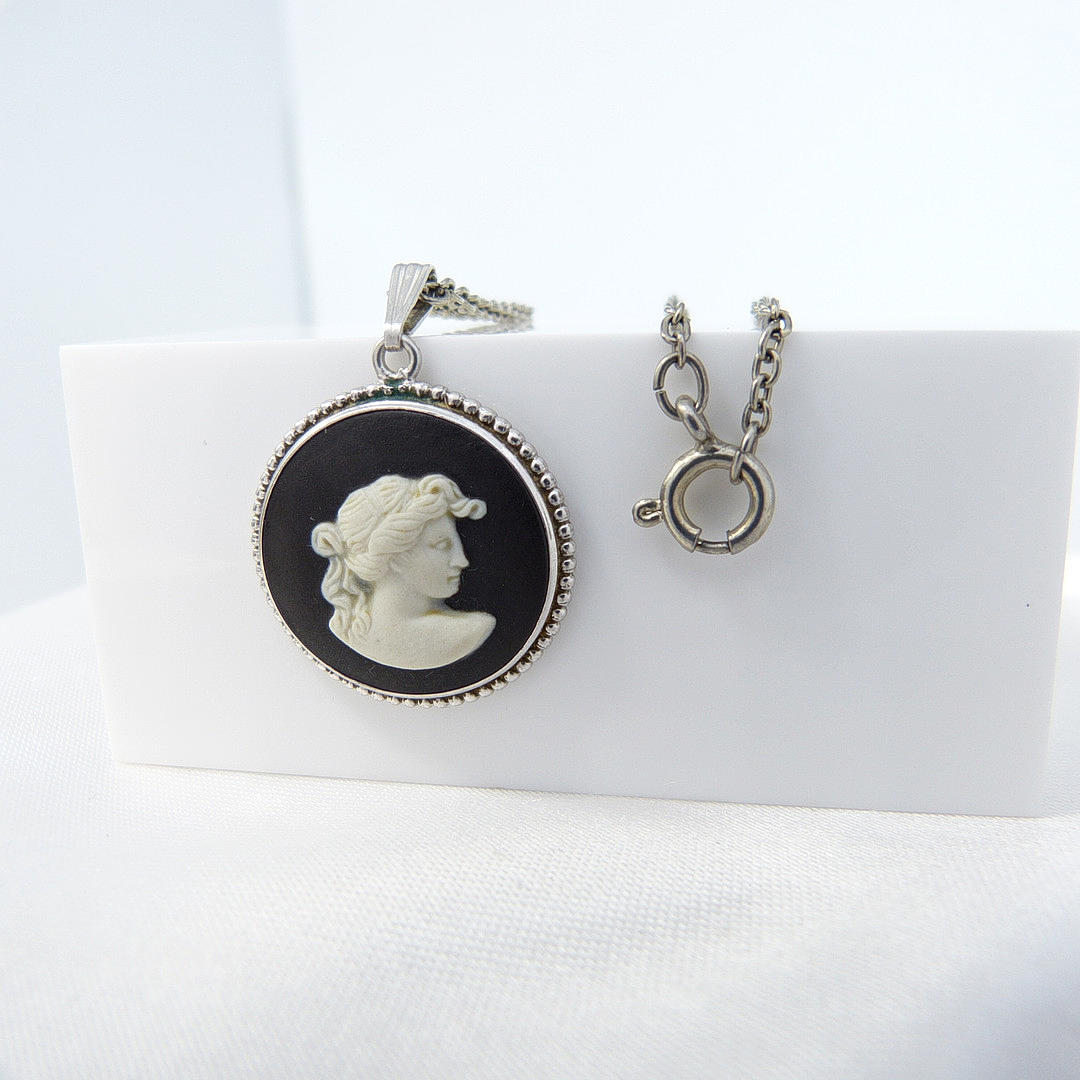 Et vintage Wedgewood Pottery stemplet vedhæng sæt i en sølvramme komplet med hvid metalkæde.