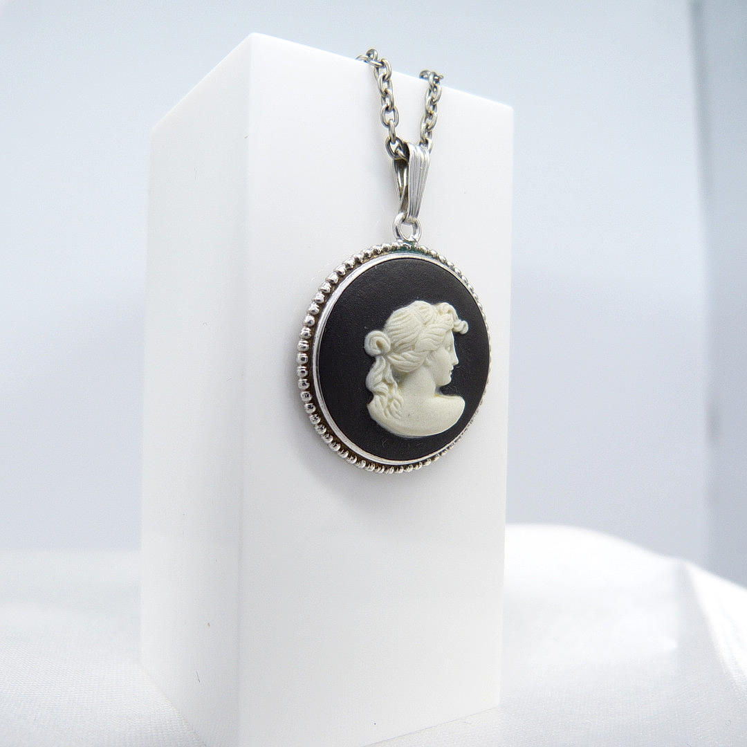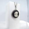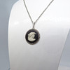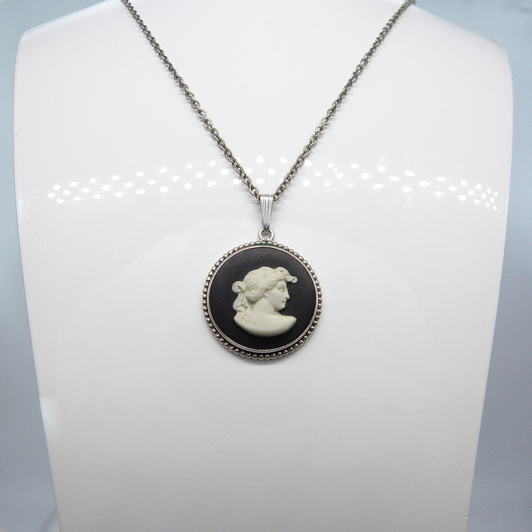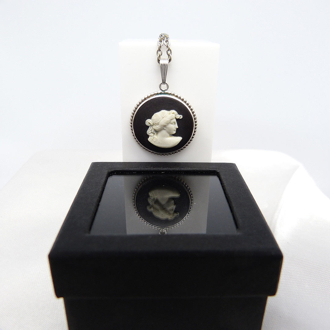 Et vintage Wedgewood Pottery stemplet vedhæng sæt i en sølvramme komplet med hvid metalkæde.