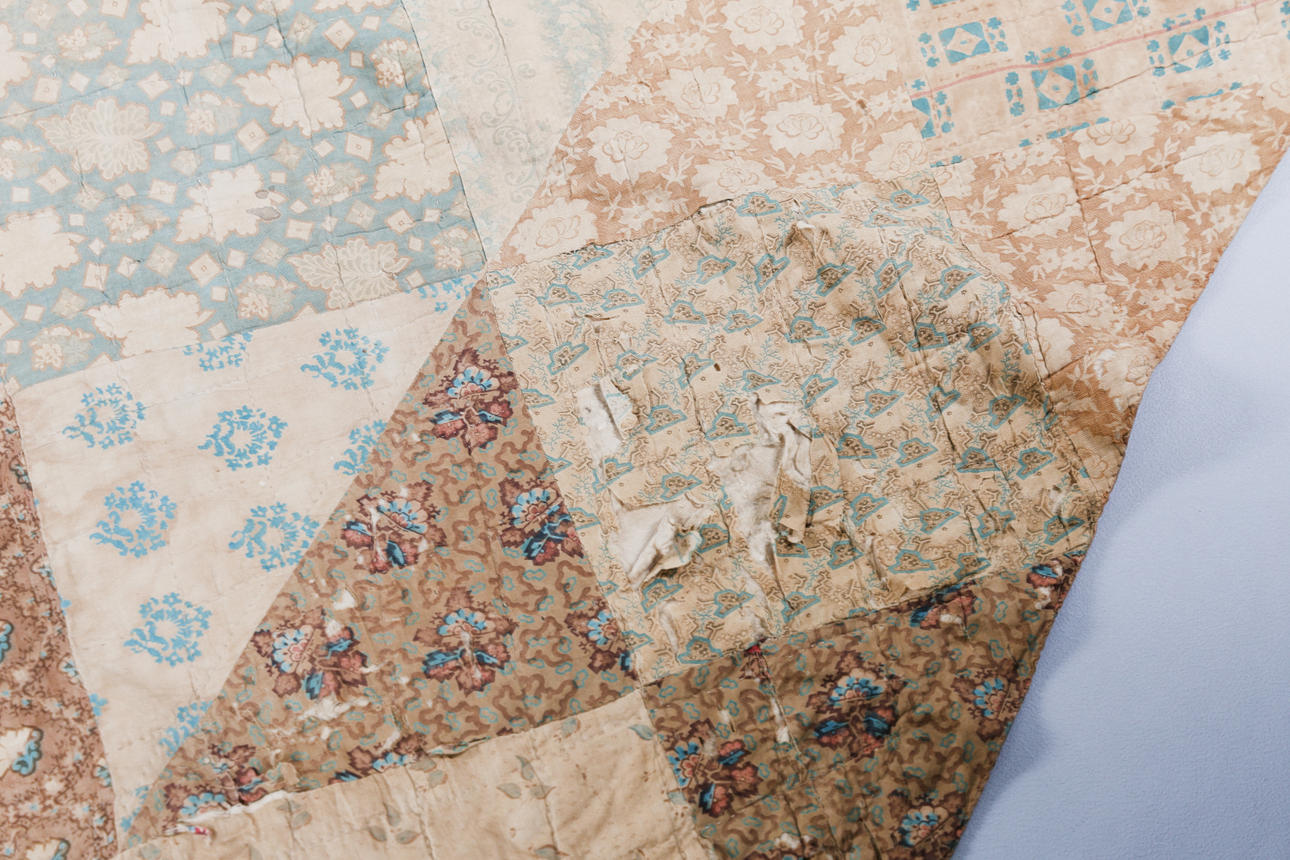 Håndsyet med bomuldsfor og forskellige pletter af trykt bomuldsstof i dæmpede farver.