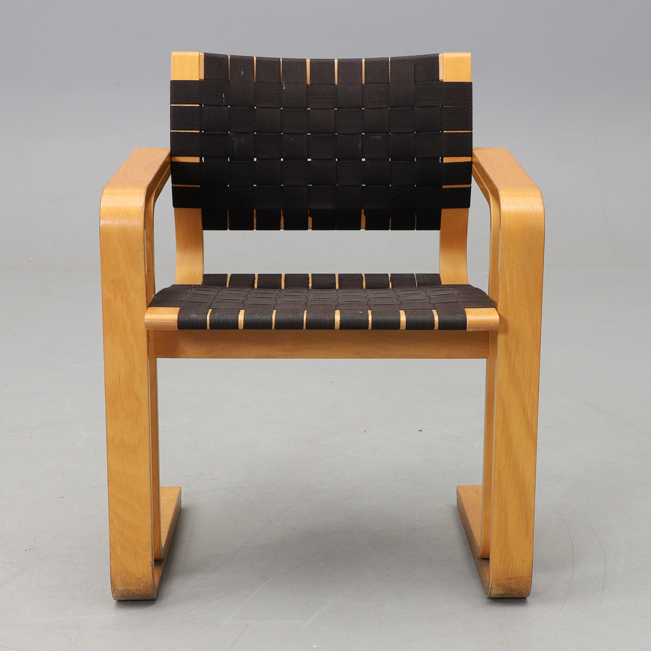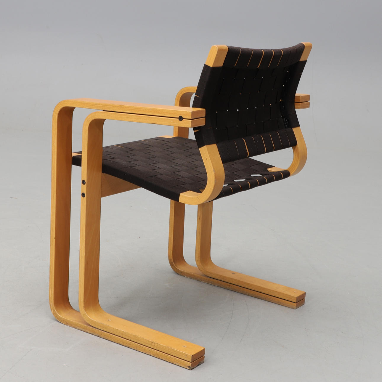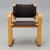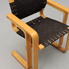 Bøjende træramme lavet af bøg. Sæde og ryg lavet af flettet sadelklud. Mærket. Bredde 61, dybde ca. 50, ryghøjde 78, sædehøjde 45 cm.