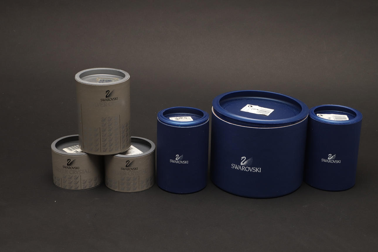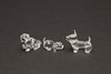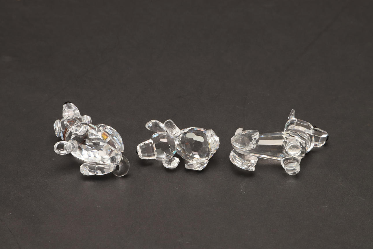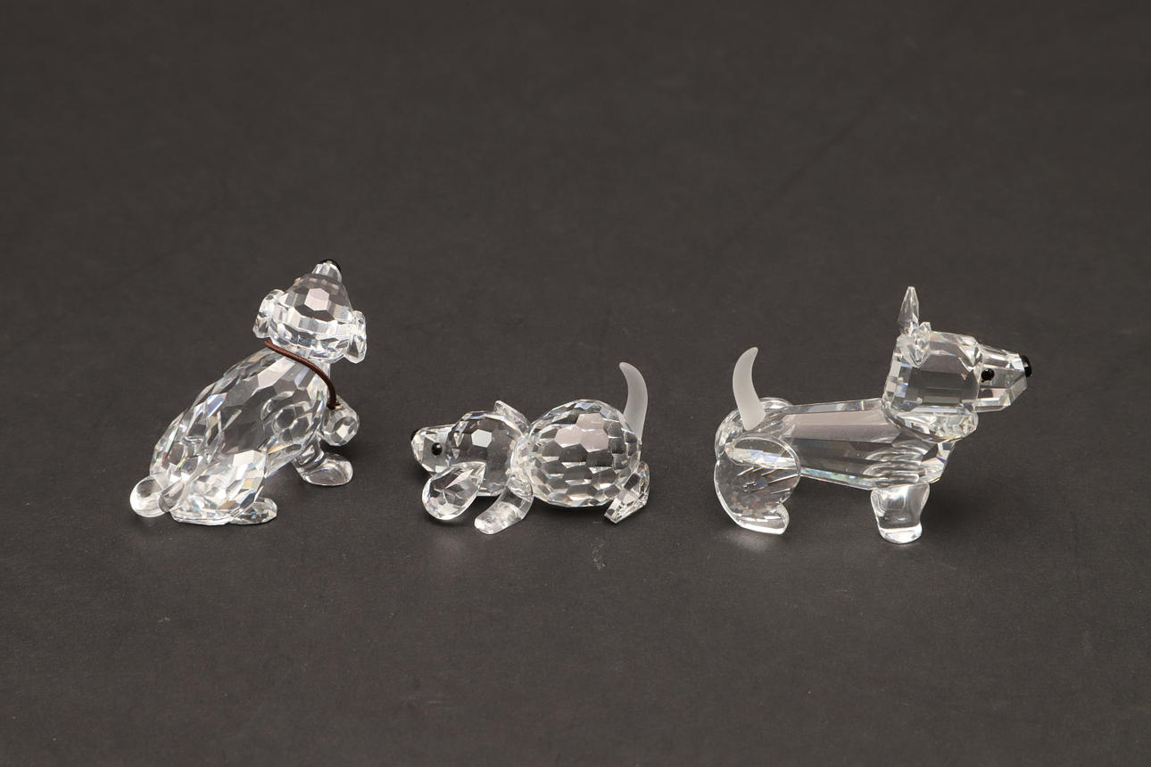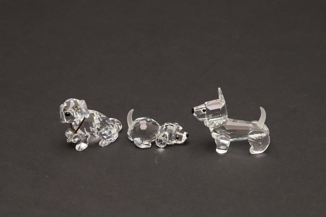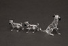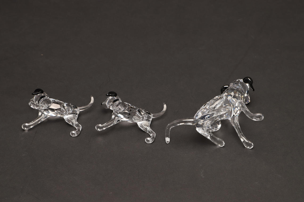 modelleret siddende, 7,5 cm høj, sammen med to dalmatiske hvalpe, modelleret stående med hovedet spændt til den ene side, 5,5 cm lange, og tre andre figurer af hunde i forskellige stillinger, alle i originale monterede kasser (6).