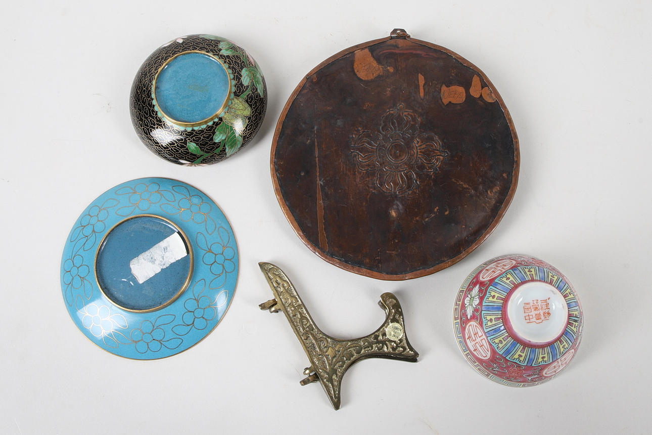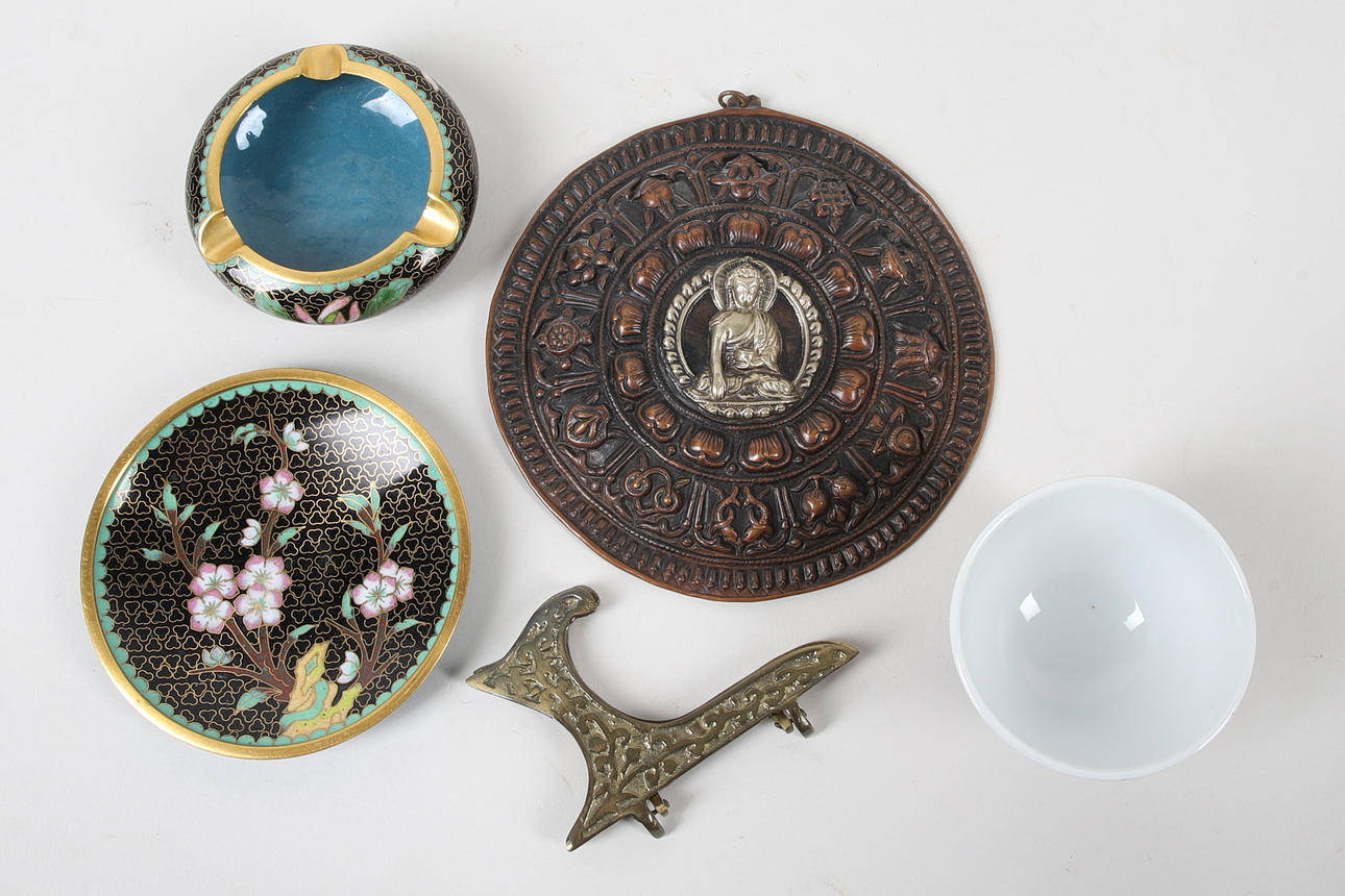 Tønde, diameter ca. 10,5 cm, med stativ. Askebæger, diameter ca. 8,5 cm. Relief, diameter ca. 14,5 cm. 7 skåle, højde ca. 5,5 cm, diameter ca. 7,5 cm.
