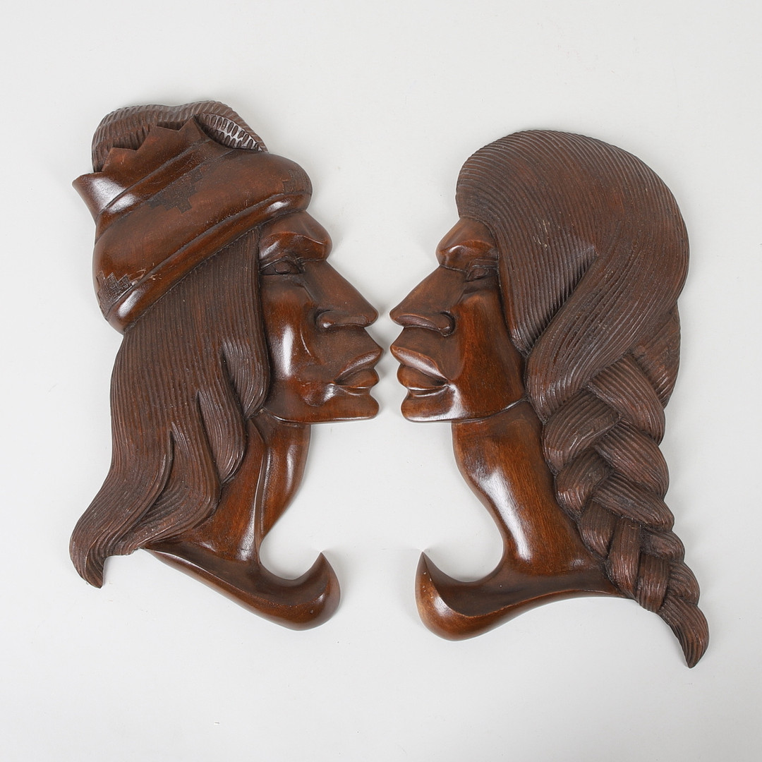 4250457. VÆGRELIEFFER, 2 stk, ansigter, træ.