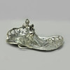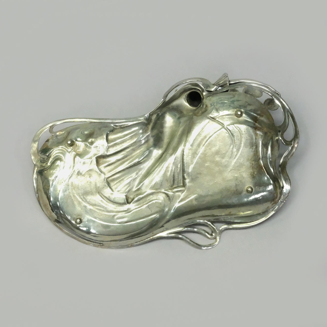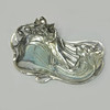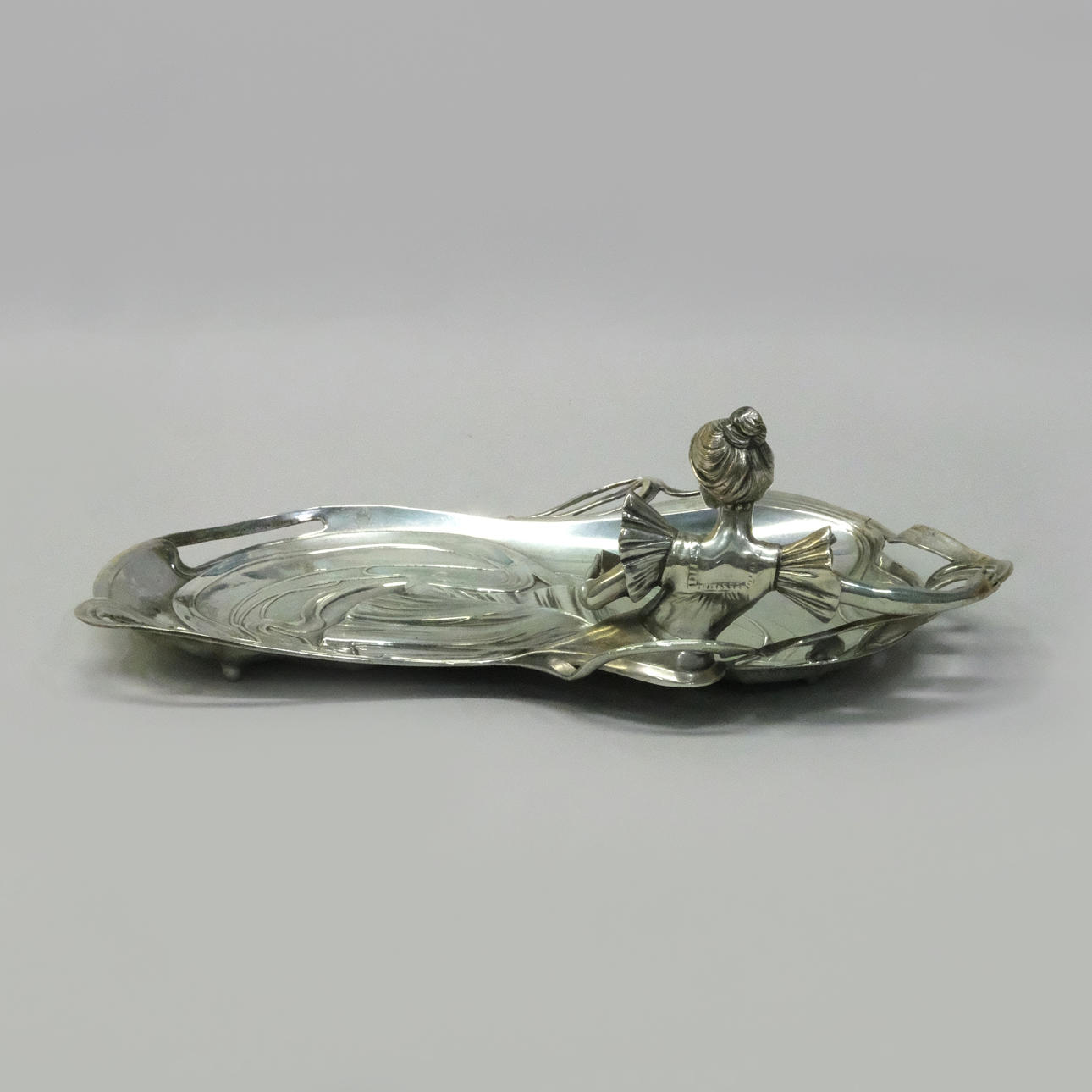 I form af figurativ læsekvinde omgivet af bugtende vegetation, sølvbelagt britanniam metal, stemplet „WMFB“, Würtembergischer metallwarenfabrik, Tyskland, begyndelsen af det 20. århundrede, længde 35, bredde 23 og højde 11 cm.