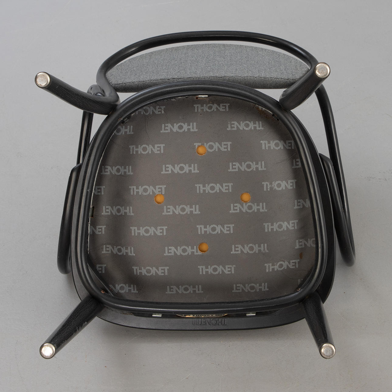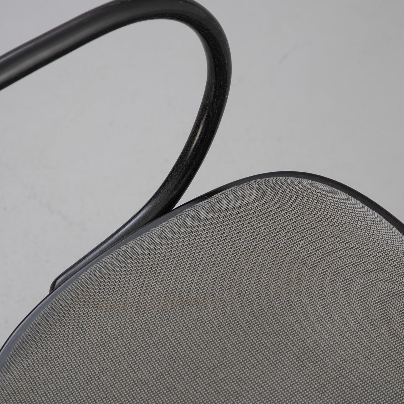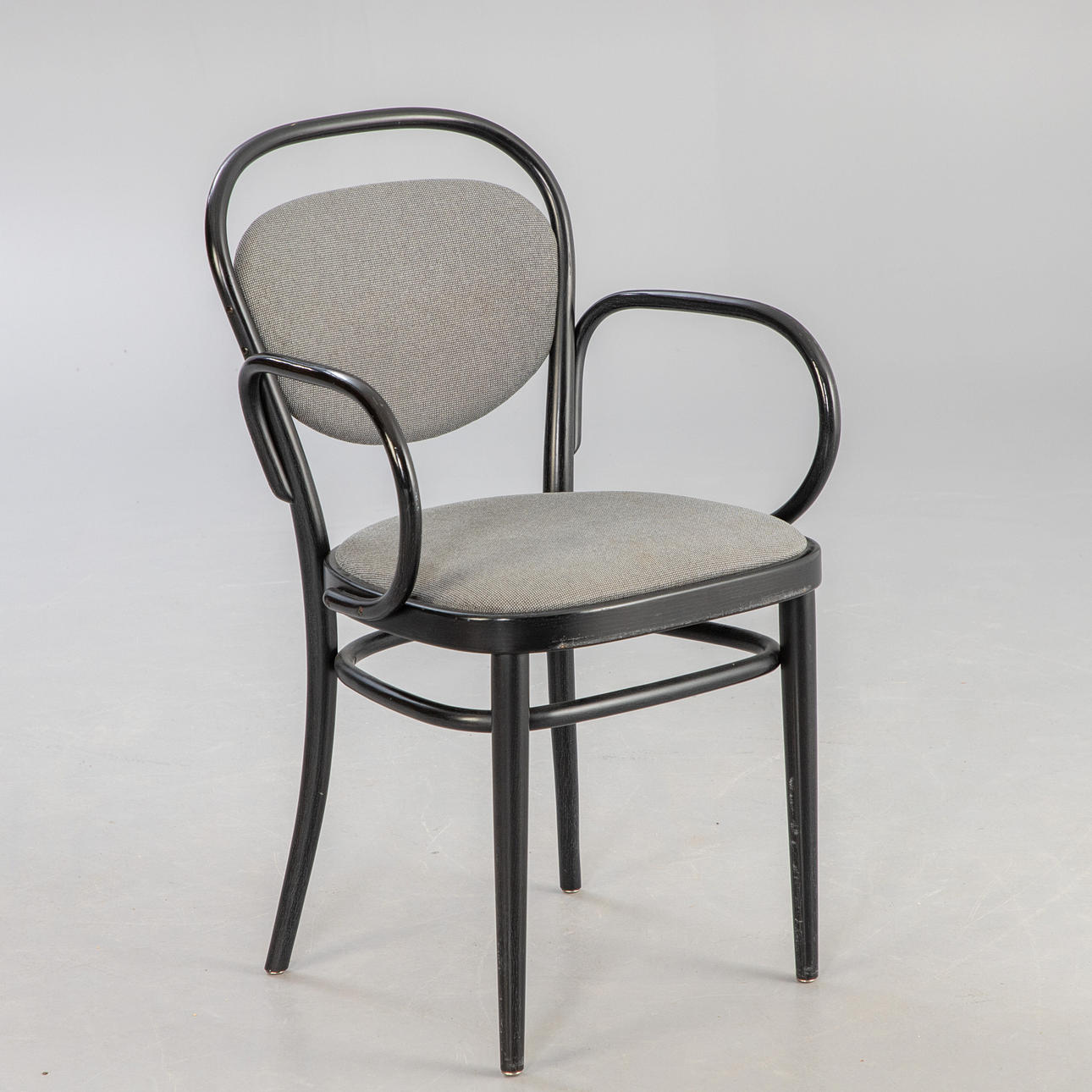 Bentwood ramme med armlæn, malet sort. Sæde og ryg polstret og dækket med stof. Indskrevet med producentens etiket og prægning i træ „Thonet99" nedenfor.