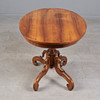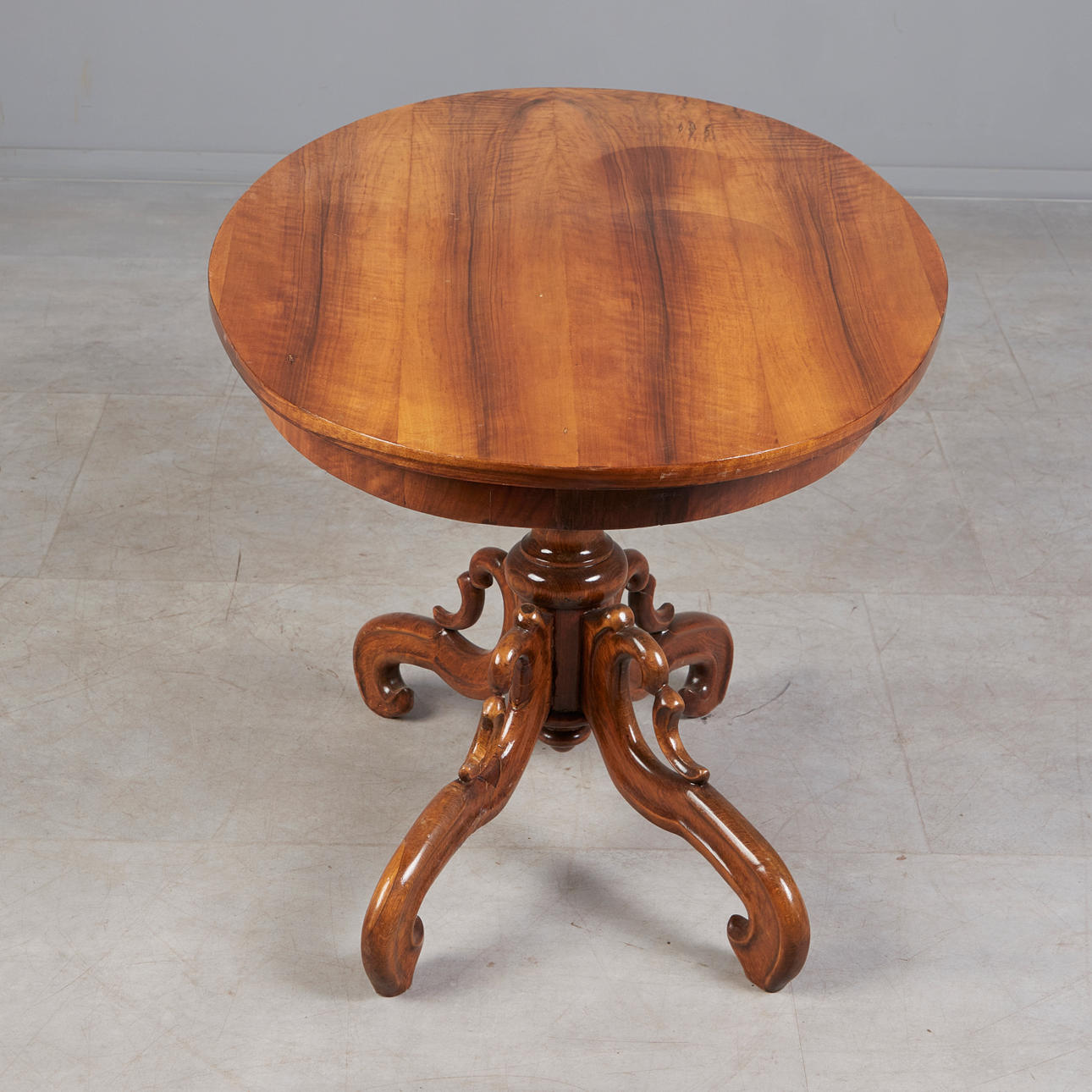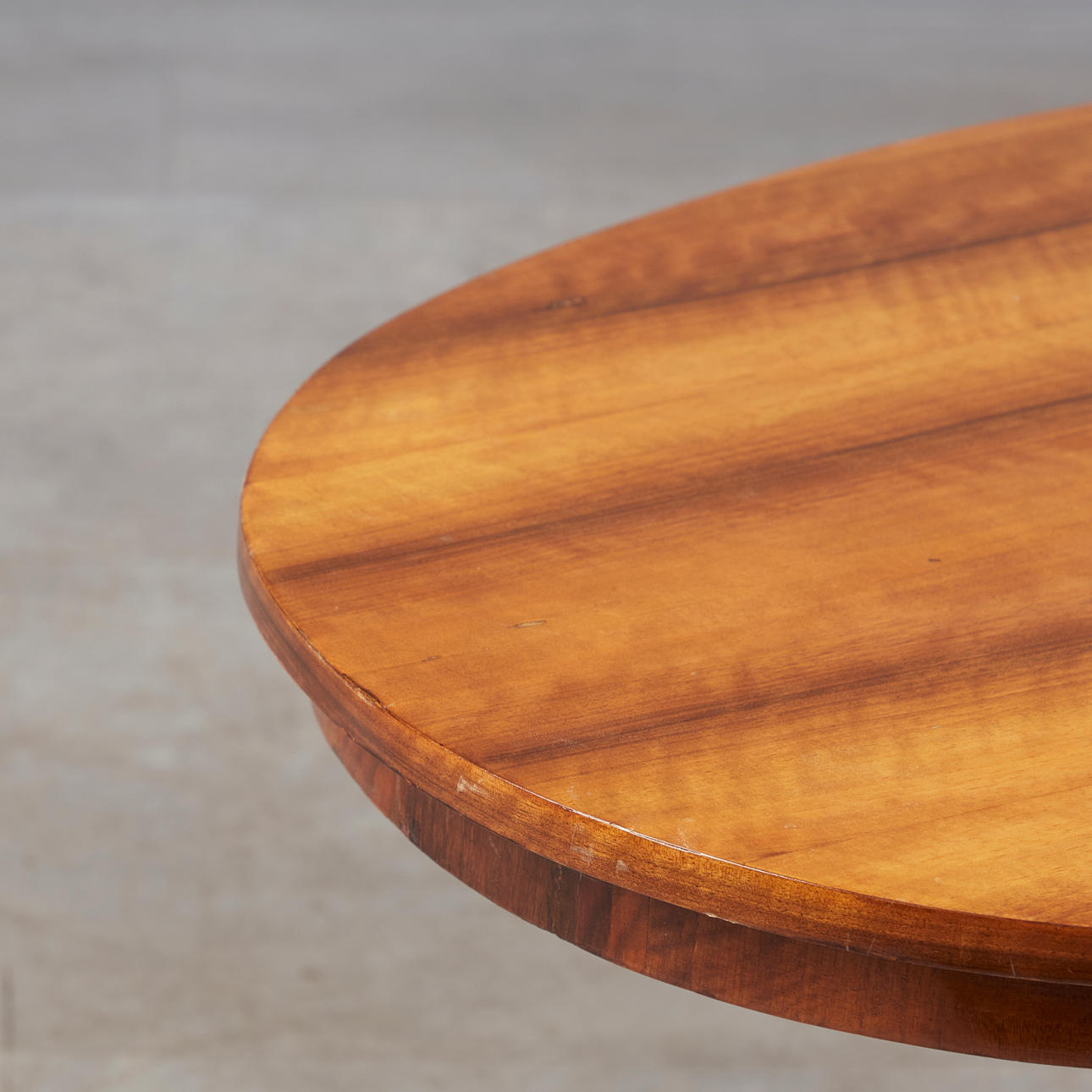 Ovalt bord lavet af lakeret valnød med en firbenet base med frøelementer, H.66cm, B.110cm, W.71cm.