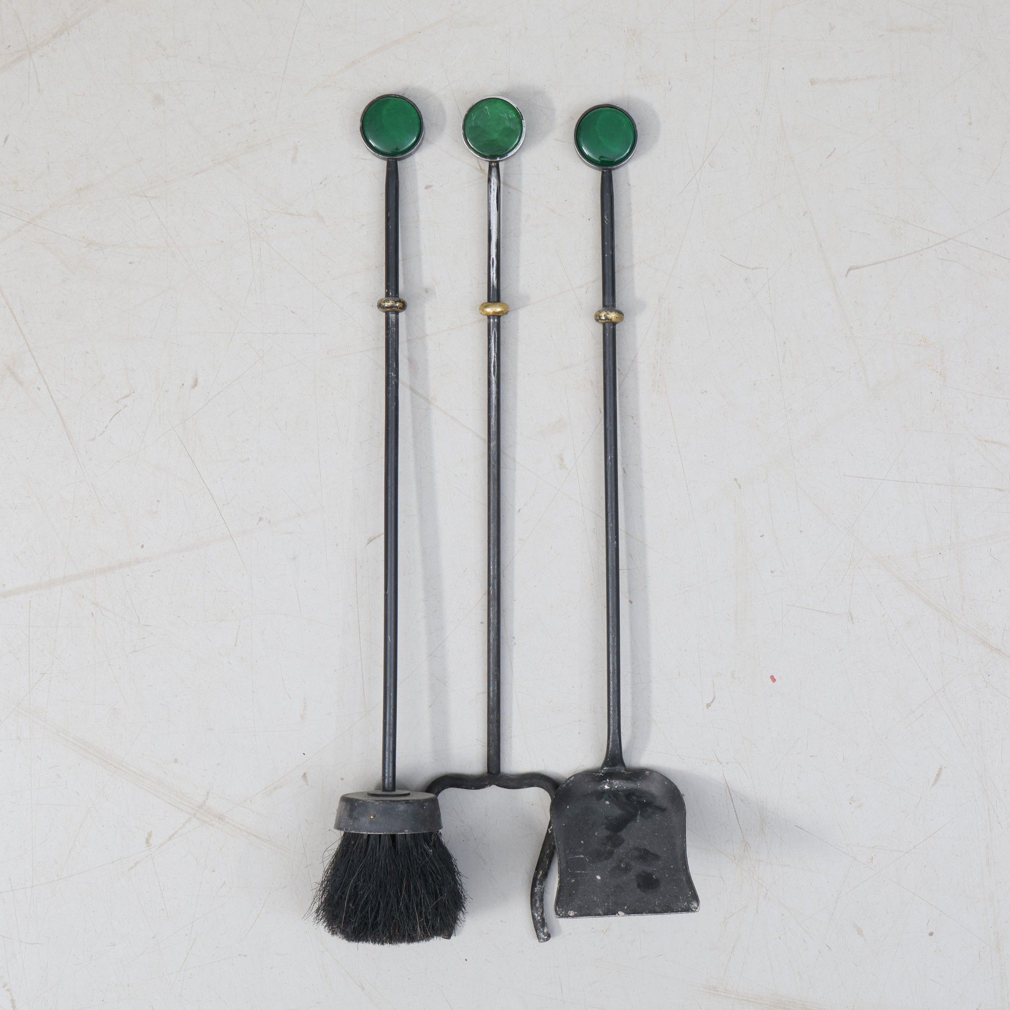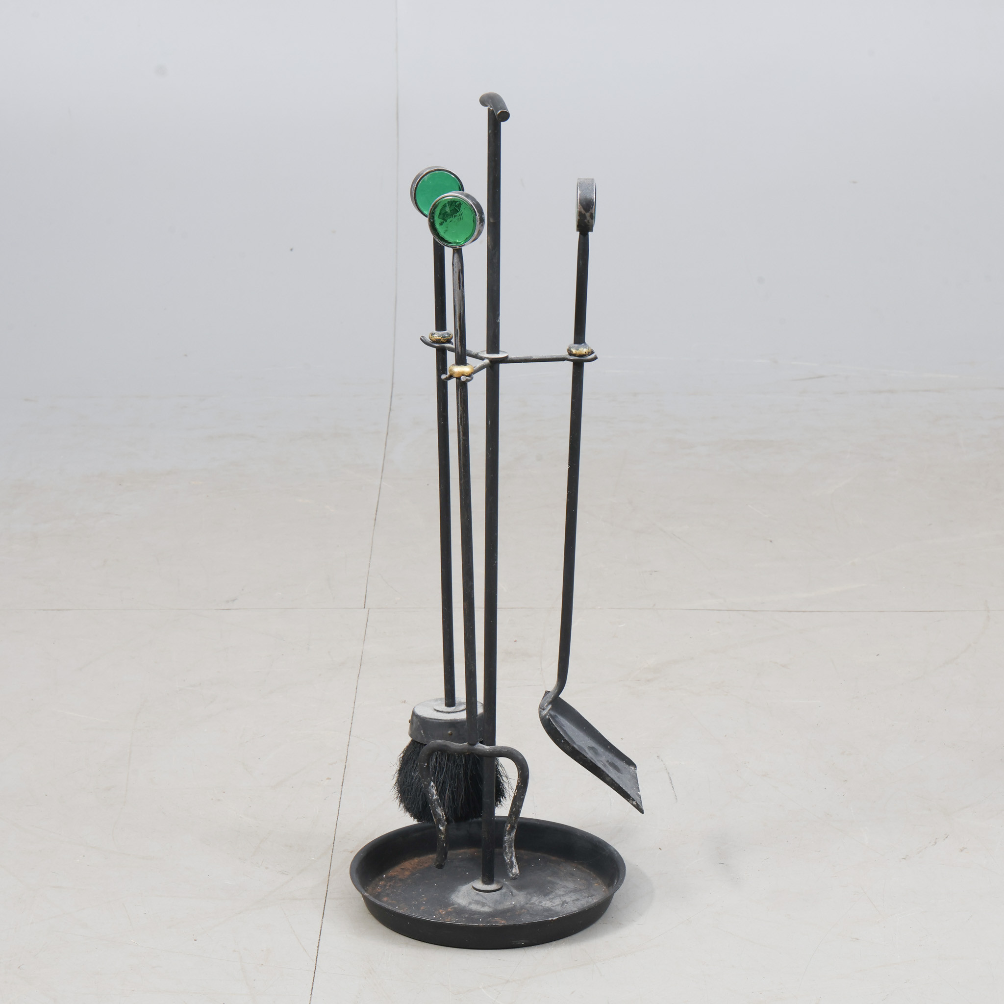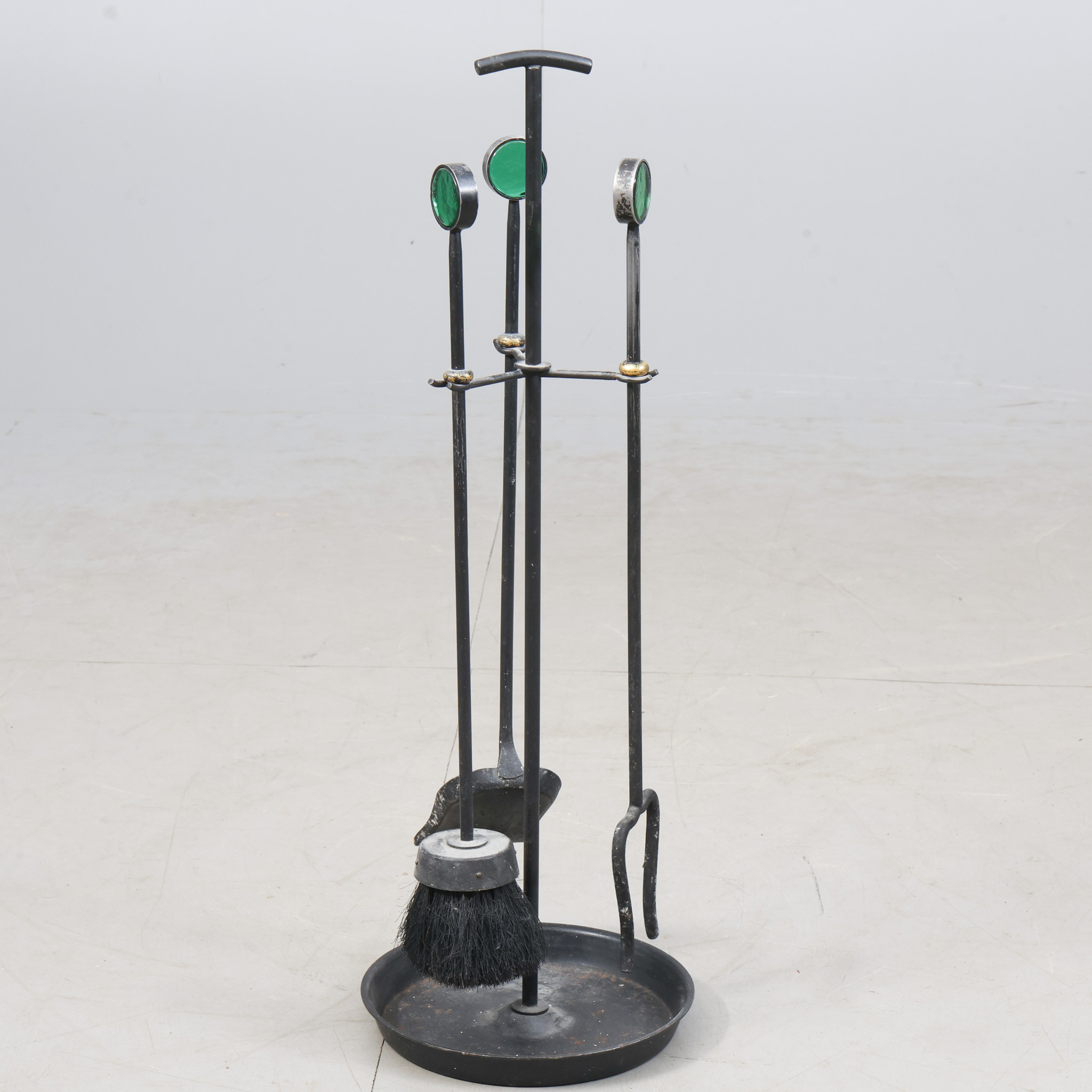 4260168. GUNNAR ANDER. Brandstativ, pejsesæt, smedejern og glas.