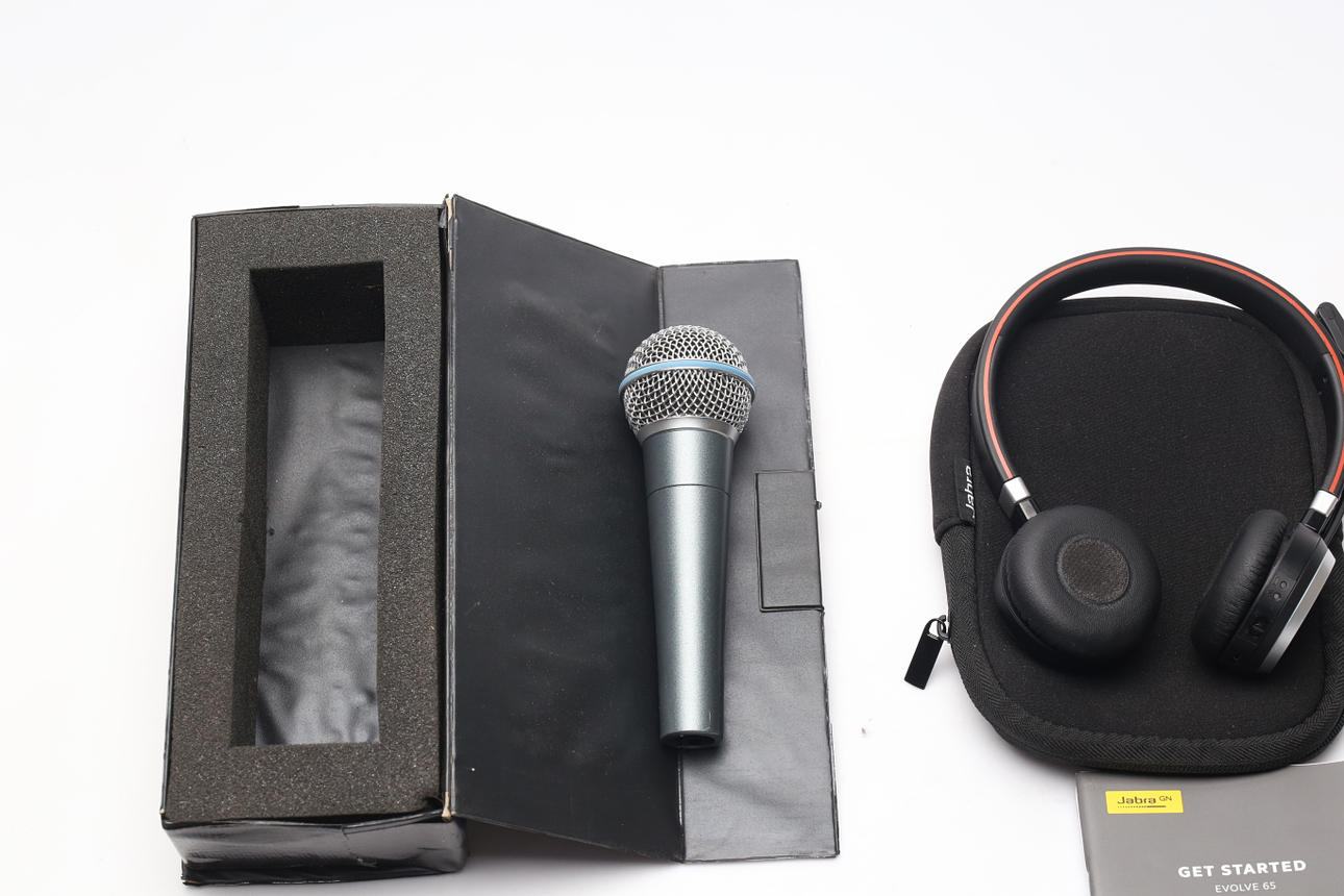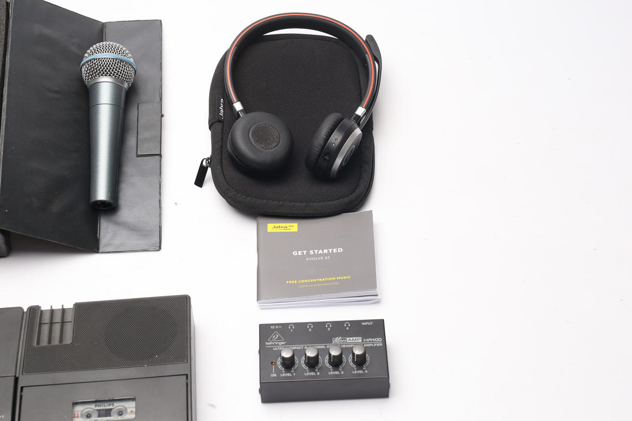 Umærket mikrofon. Hovedtelefoner Jabra evolve 65, Philips 725 diktat, Behringer HA400.